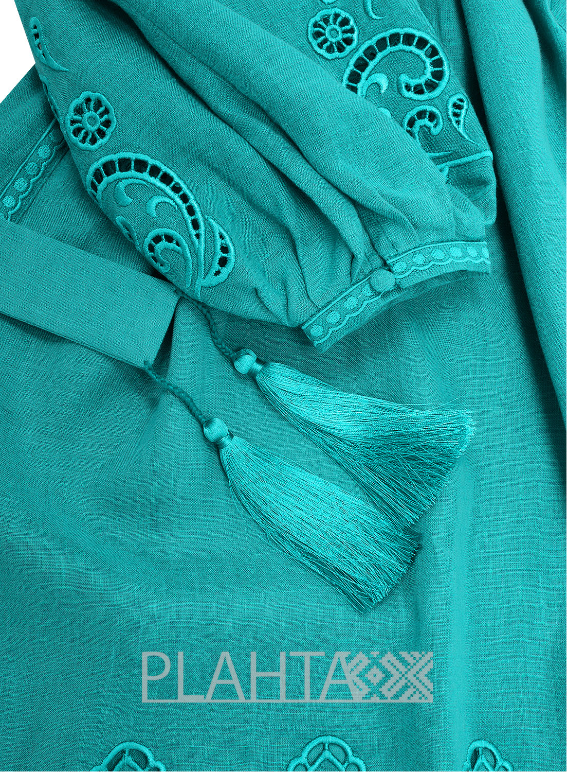 Смарагдова сукня з вишивкою рішельє "Елегія моря" - Plahta - магазин-ательє сучасних вишиванок