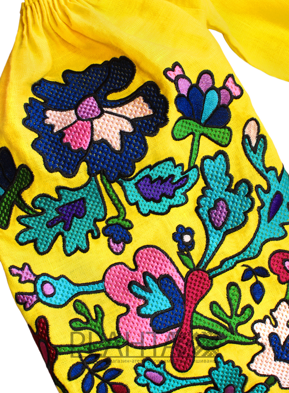 Довжина комбінезона - 85 см. Пошиття - цілісний фасон із запахом на кнопці. Для декорування рукавів використана традиційна українська техніка - "пухлики". На рукавах - застібки-гудзики. Вишивка зроблена на промислових японських вишивальних машинах якісними нитками, що не линяють. Виріб зшитий вручну нашими майстринями.