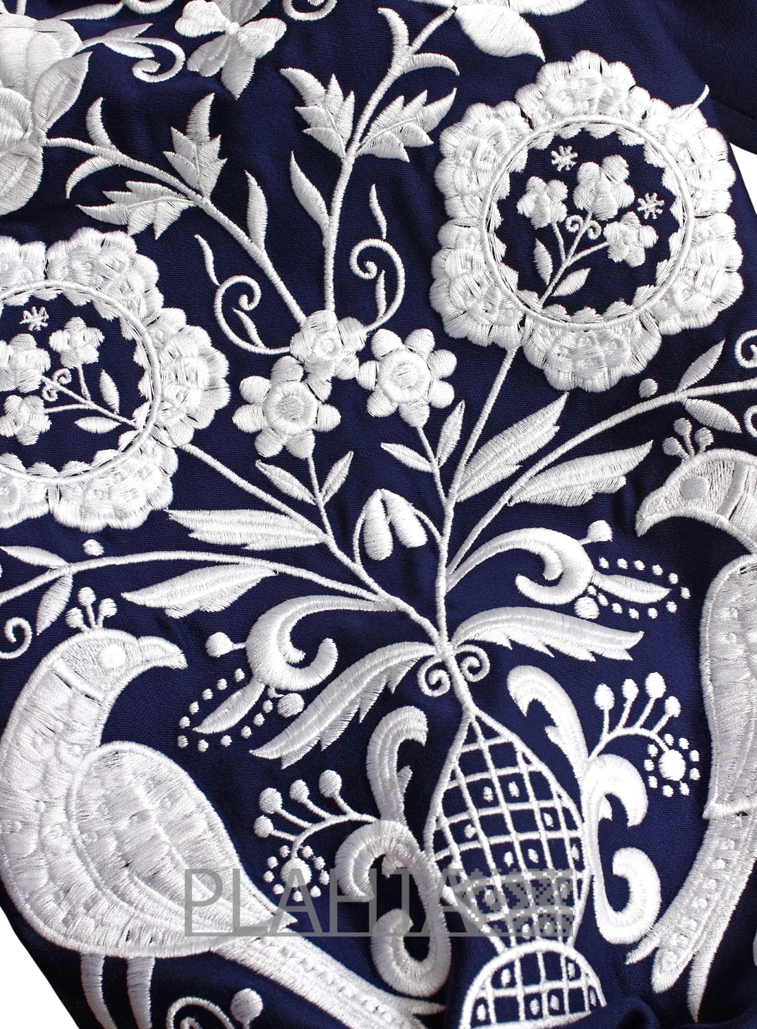 Колорит сукні та мотив вишивки не тільки гармонійно поєднуються, але й мають особливе значення. Синій колір в українській культурі - це символ води та жіночого начала, а білий символізує чистоту. У вишивці домінує квітковий мотив, зібраний в систему орнаменту, що символізує уявлення народу про Всесвіт та його нескінченність. А птахи - це посланці Божого Духа, що оберігають родину.