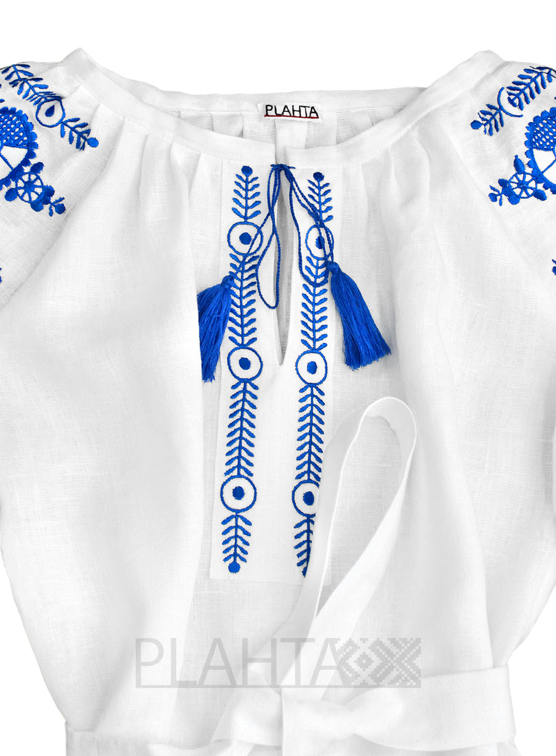 Туніка "Волошковий Вир" - симбіоз модних світових тенденцій і символічної української орнаменталістики. Поєднання білого льону і соковитої волошкової вишивки виглядає свіжо і стильно. Яскрава туніка доповнить сучасний гардероб нотою автентичної жіночності. Гармонує як з діловим стилем, так і з повсякденним.