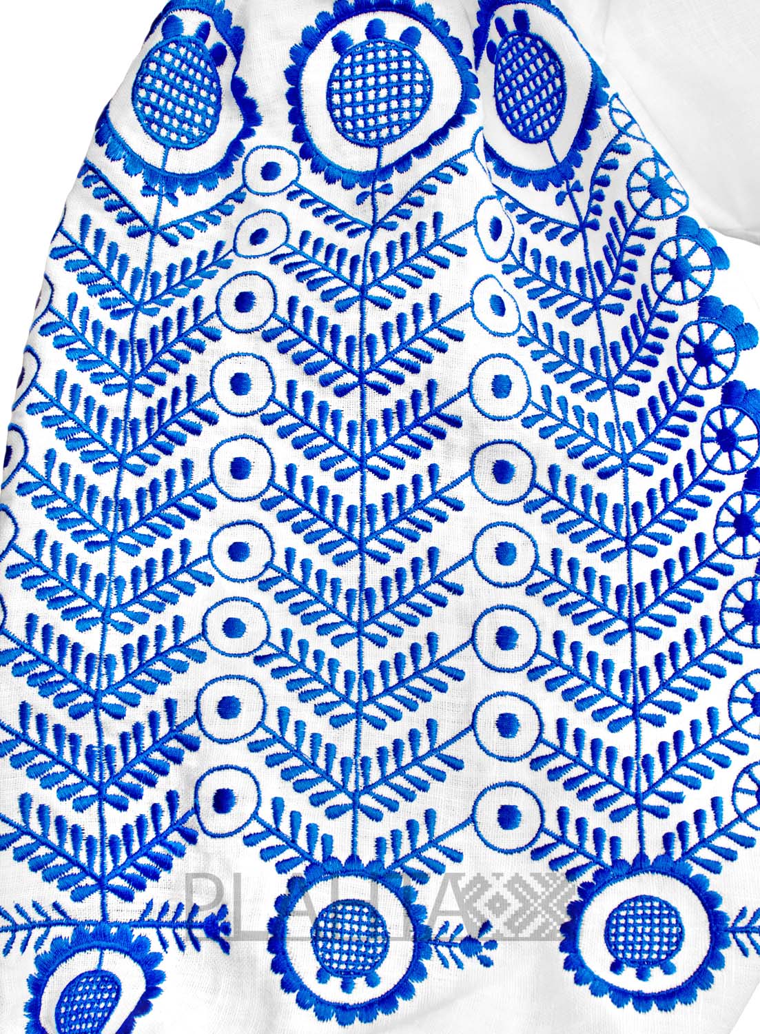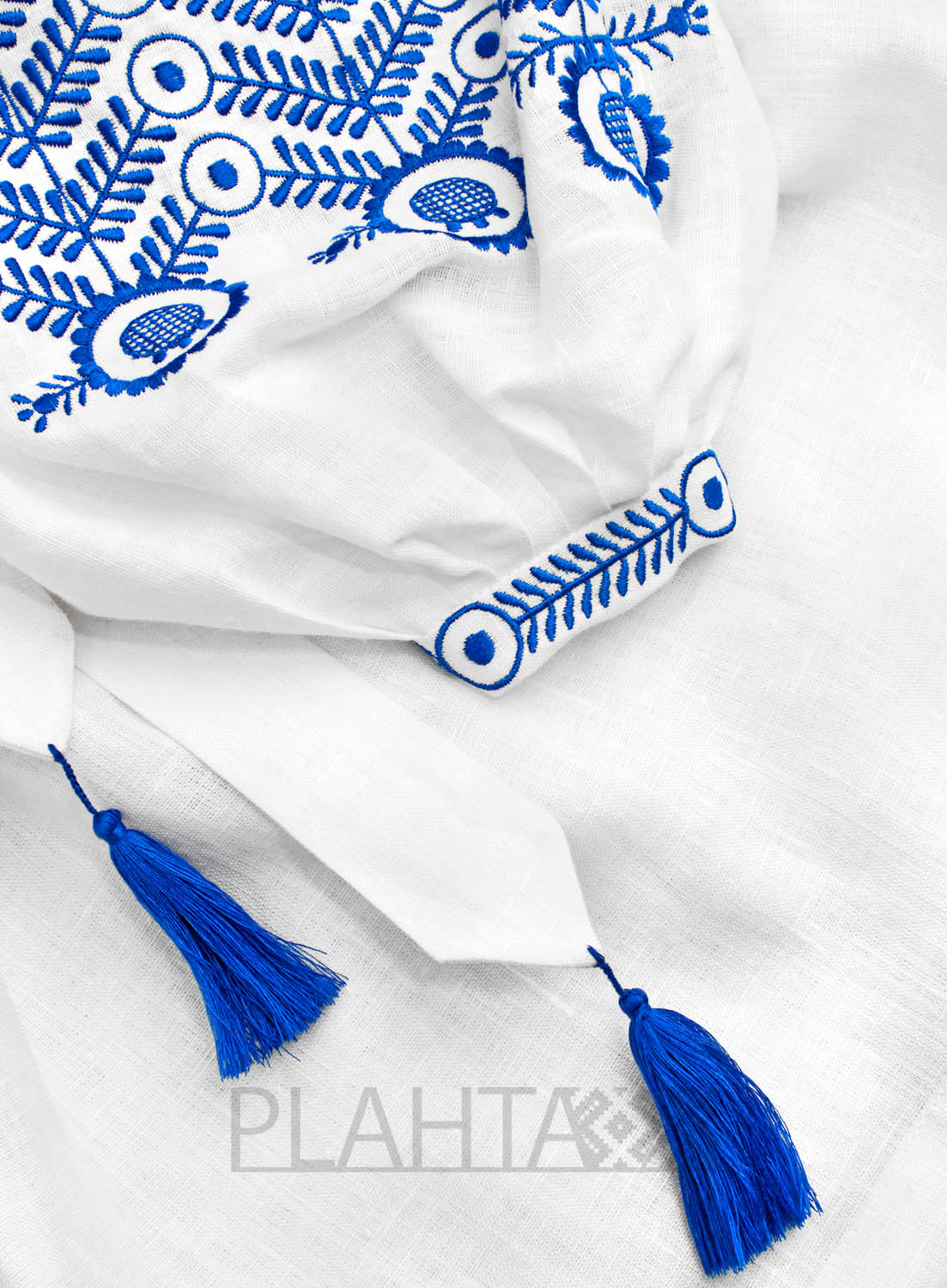 Поєднання білого і синього є традиційним для жіночих українських вишиванок. Білий колір ніжної лляної матерії - це колір сили, життя, енергії, чистоти і непорочності. На ньому яскраво і контрастно виділяється синій орнамент. Синій - колір води, який символізує жіноче начало, а також очищення і душевний спокій. Стилізовані рослинні мотиви включають в себе і давньослов'янські знаки, такі як коло - сонячний знак і "велике коло" (восьмикутний хрест, вписаний в коло) - символ Родового дерева, що об'єднує галузі різних родів в єдине ціле, символ вічності і нескінченності, а також всепроникненої любові. Рослинні мотиви, зібрані в систему геометризированного орнаменту, являють собою уявлення народу про структуру Всесвіту.