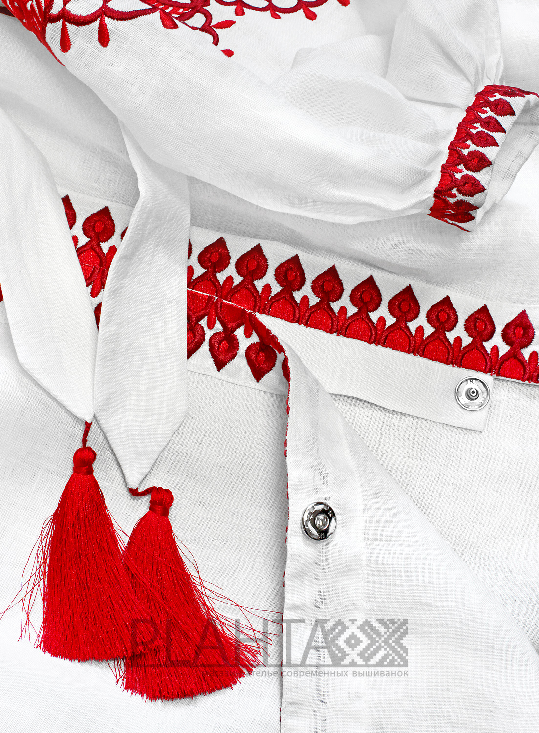 Колірна гамма вишиванки володіє певним символізмом. Білий колір лляної тканини пов'язаний з ідеєю світла і символізує чистоту і енергію. Яскравий червоний колір вишивки здавна символізує любов, пристрасть, сонце, а також захищає від зла і притягує енергію гармонії і любові. Новий погляд на традиційний український колорит втілений в авторській вишивці східного орнаменту. У ній простежуються елементи "Пейслі" ("буту" на Сході), який ще називають "східний огірок". "Східний огірок" родом з Персії. Цей узор використовували для прикрашання царських регалій і одягу знатних персів, вважаючи його символом родючості, достатку і гармонії.