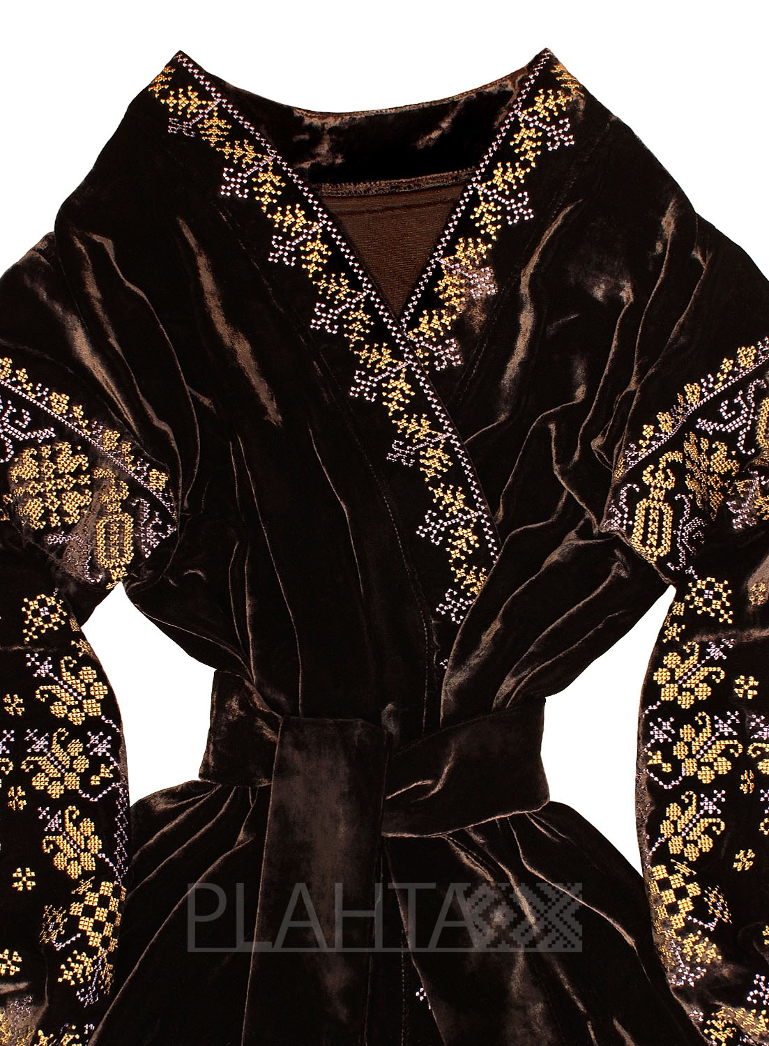 Оригінальна оксамитова сукня "Дівоча Зваба" підкреслить Вашу жіночу чарівність найліпшим чином! Розкішний лиснючий оксамит, жіночний умбровий колорит й традиційна вишивка українського мотиву виглядають вишукано та нетривіально.