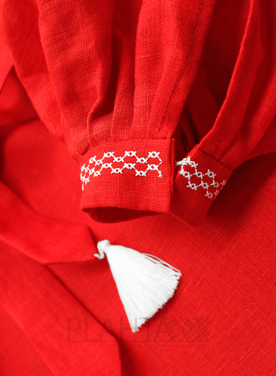 Довжина - 74 см. Пошиття - цілісний фасон з вирізом посередині. На горловині та рукавах використані традиційні українські техніки "збиранка" та "пухлики". На рукавах - застібки-гудзики. Вишивка зроблена на промислових японських вишивальних машинах якісними нитками, що не линяють. Виріб зшитий вручну нашими майстринями.