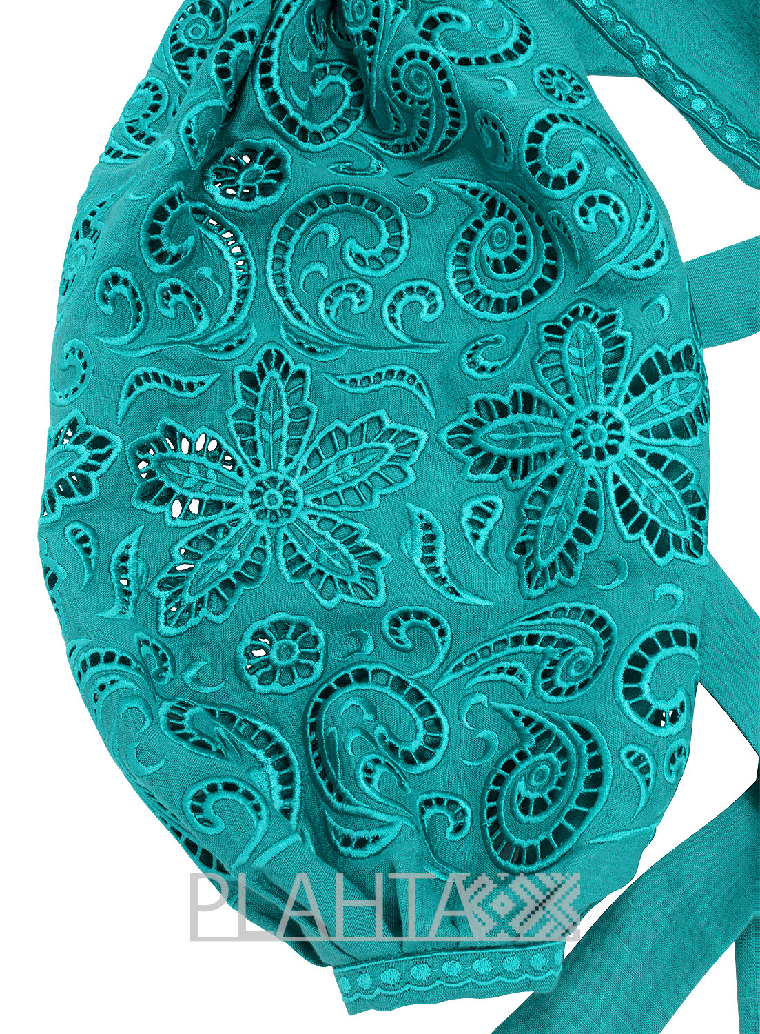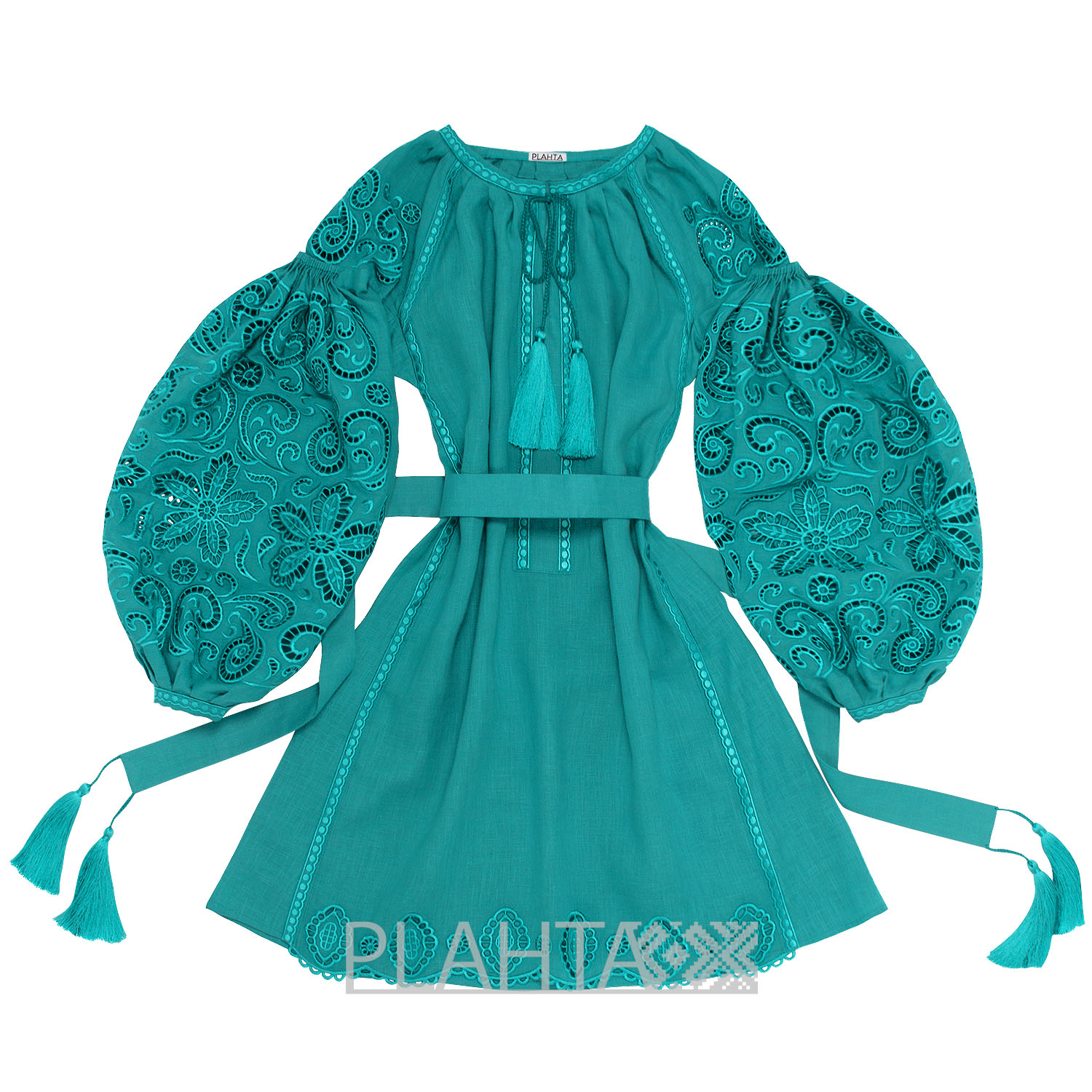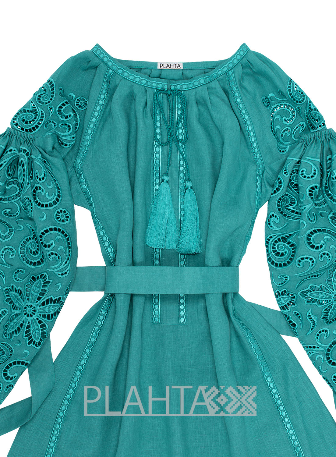 Смарагдова сукня з вишивкою рішельє "Елегія моря" - Plahta - магазин-ательє сучасних вишиванок
