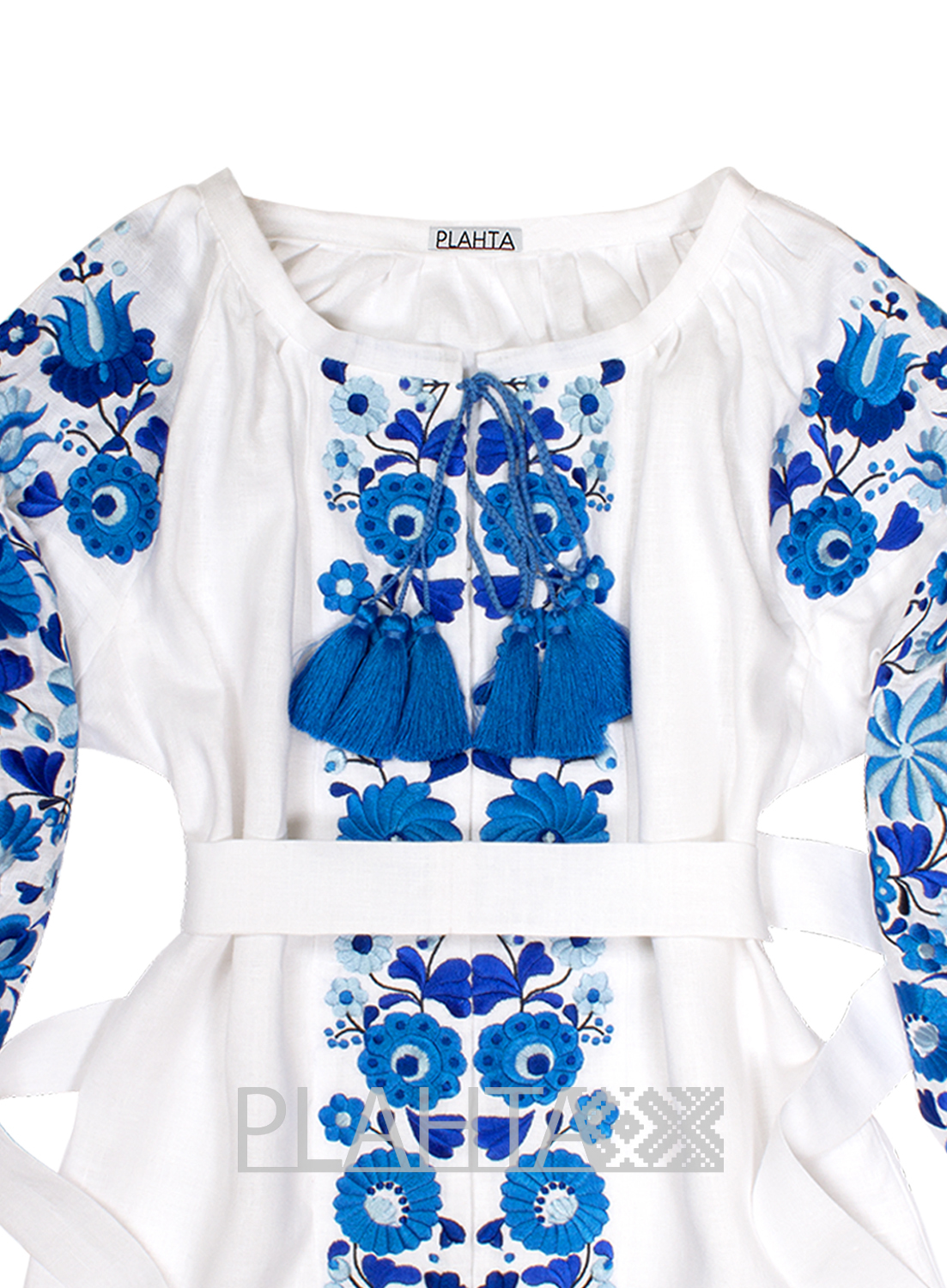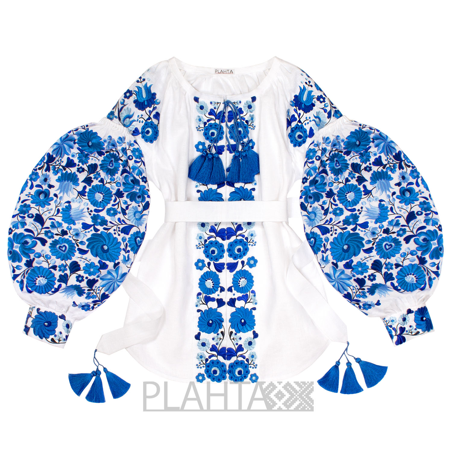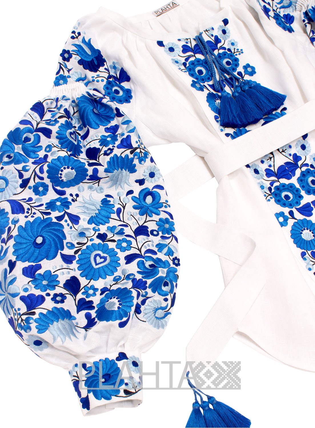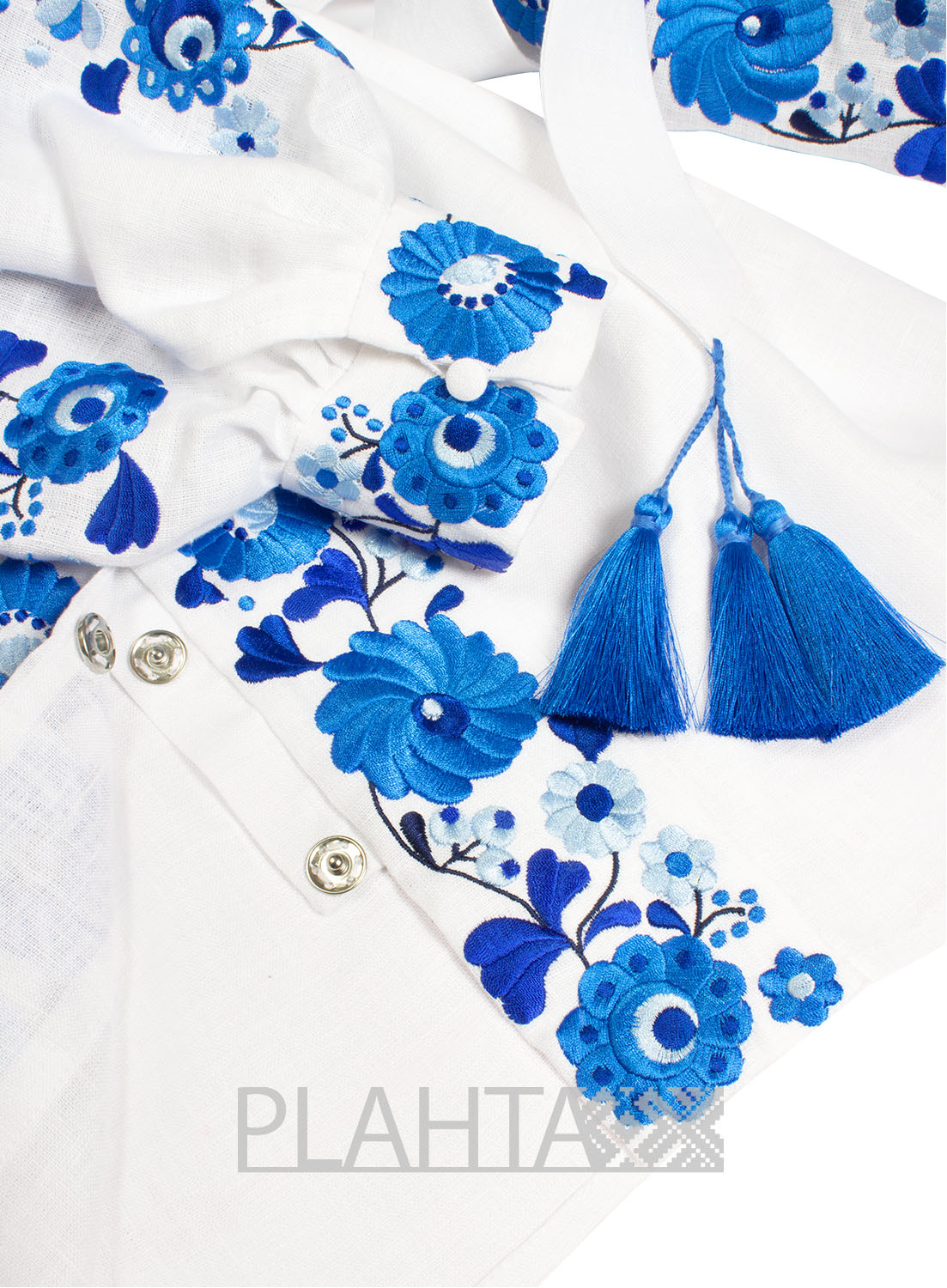 Довжина - 68 см. На планці - застібки-кнопки. Горловина і рукава виконані в традиційних українських техніках - "збиранка" та "пухлики". На рукавах - застібки-гудзики.