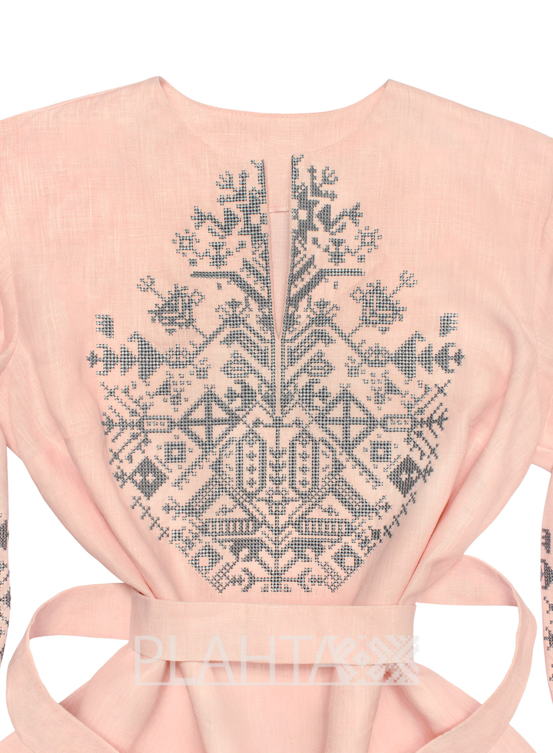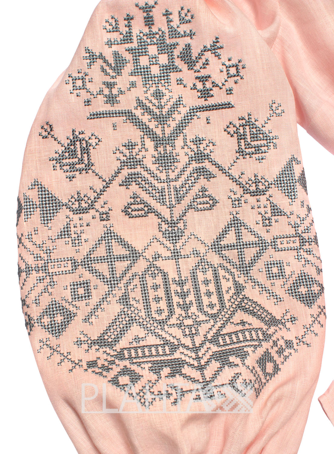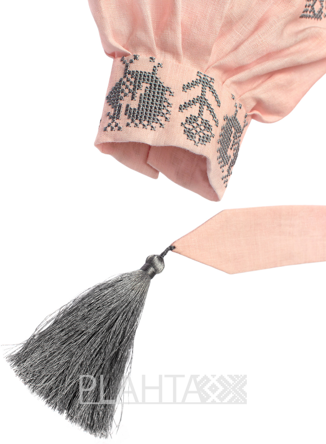 На світло-рожевому льоні красується символічна монохромна вишивка. У вишитому мотиві простежуються казкові птахи-павичі. Павич - це жар-птиця, яка несе в собі сонячну енергію розвитку. Також павич це символ молодості та сімейного щастя.