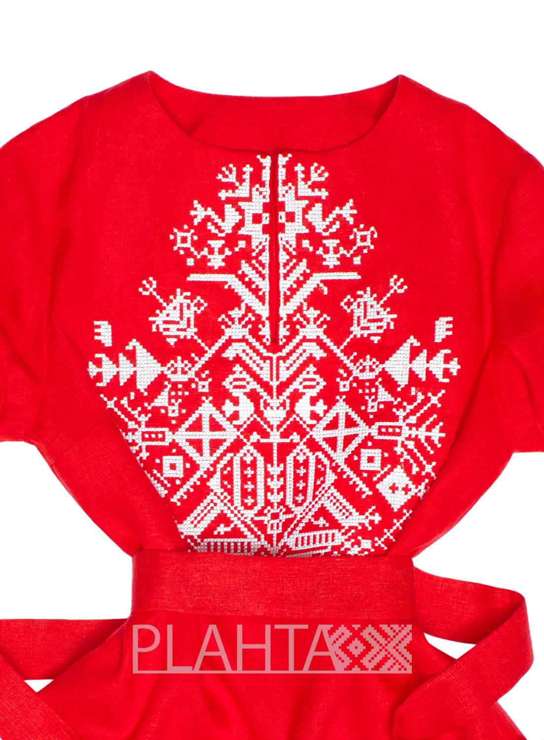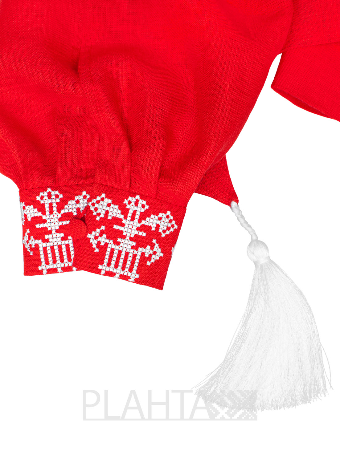 На червоному льоні красується символічна монохромна вишивка. У вишитому мотиві простежуються казкові птахи-павичі. Павич - це жар-птиця, яка несе в собі сонячну енергію розвитку. Також павич - це символ молодості та сімейного щастя.