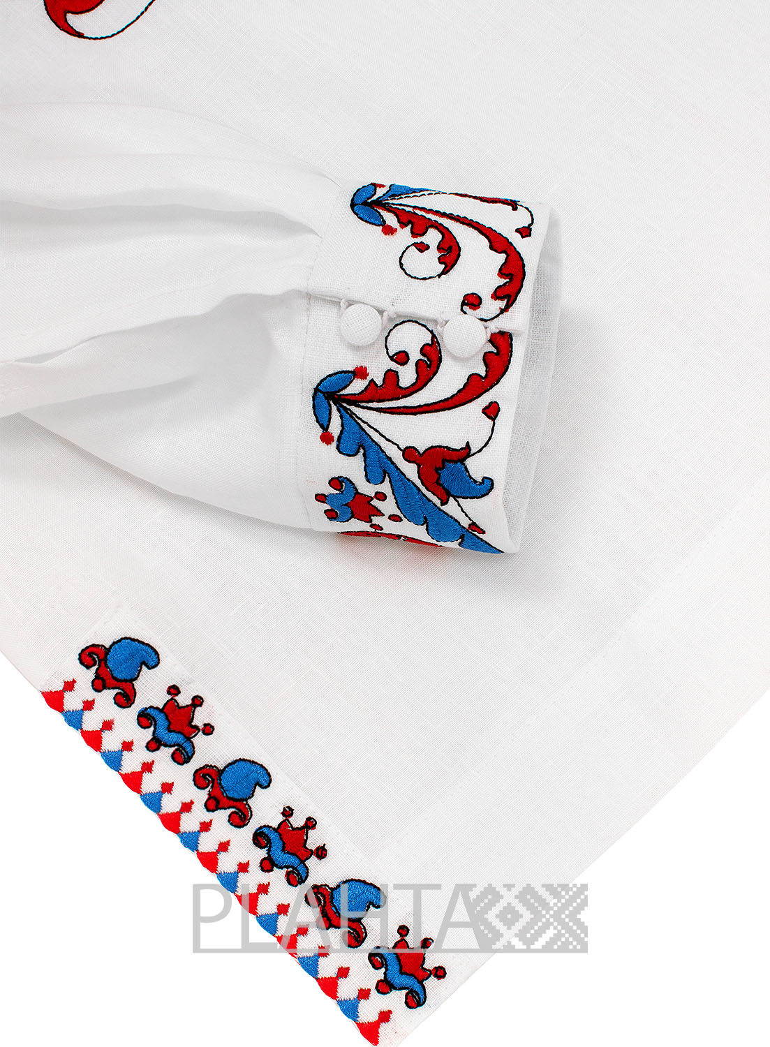 Пошиття - цілісний фасон з вирізом посередині. Горловина, груди і манжети вишиванки декоровані вишивкою, зробленою на промислових японських вишивальних машинах якісними нитками, що не линяють. На рукавах - застібки-гудзики. Виріб зшитий вручну нашими майстринями.