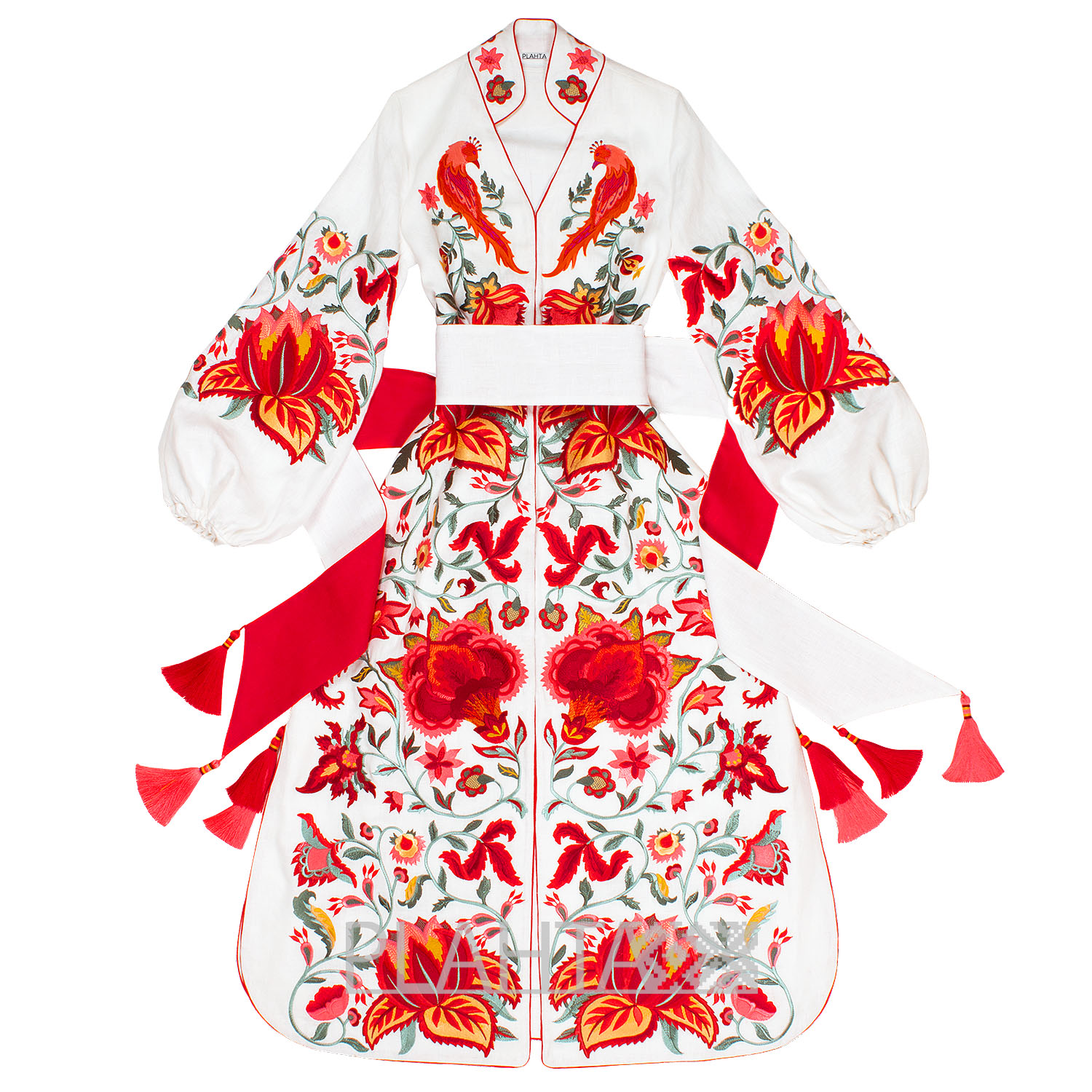 Довжина - 130 см. На планці - застібки-кнопки. З боків сукні розрізи. Горловина V-образна. Манжети на резинці. Виріб зшитий вручну нашими майстринями.