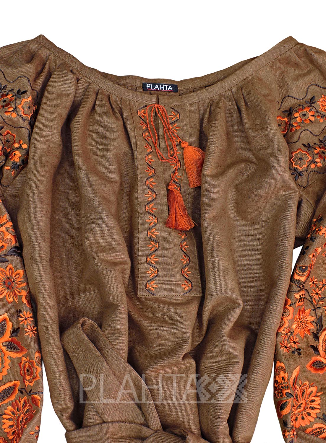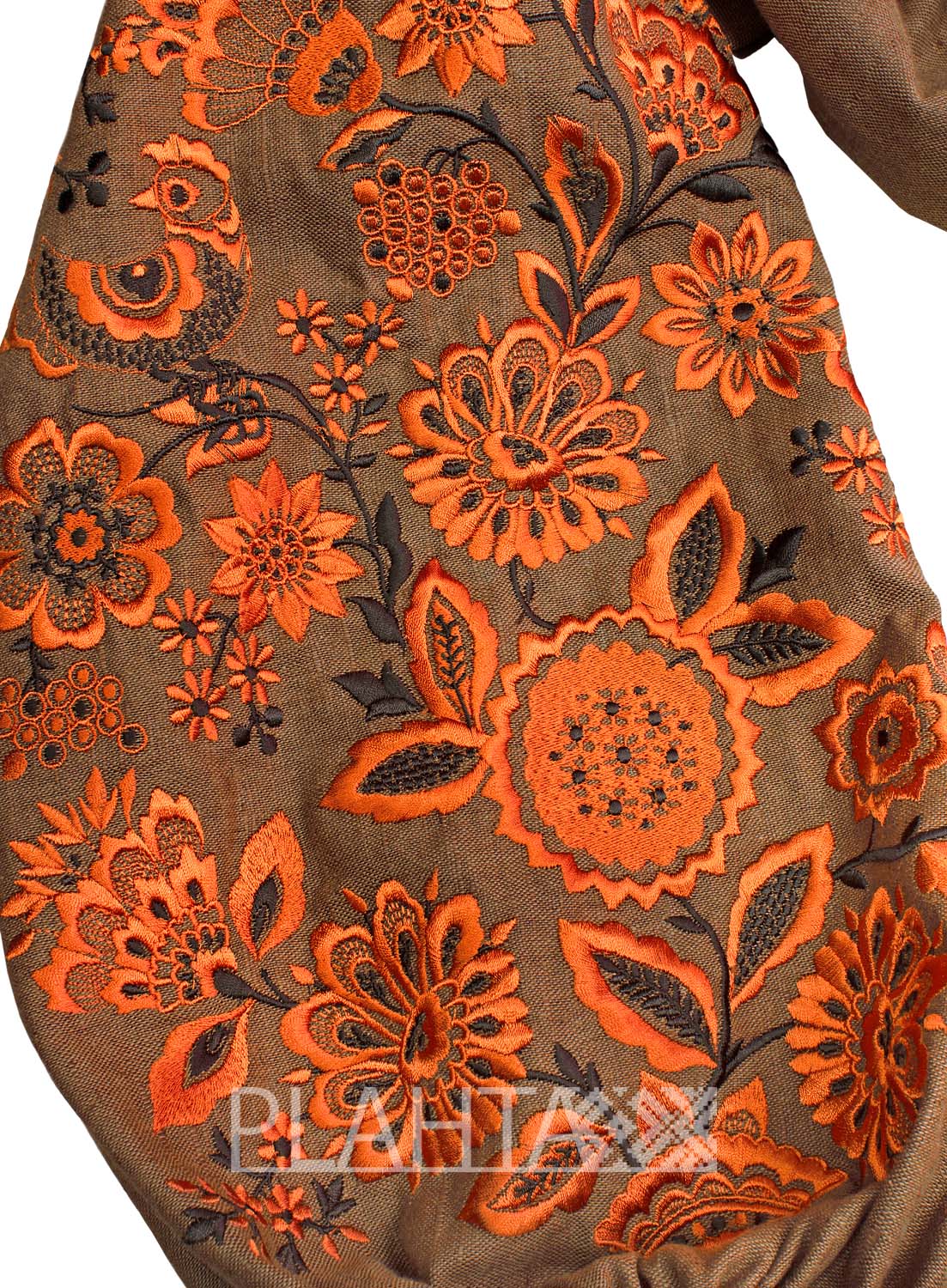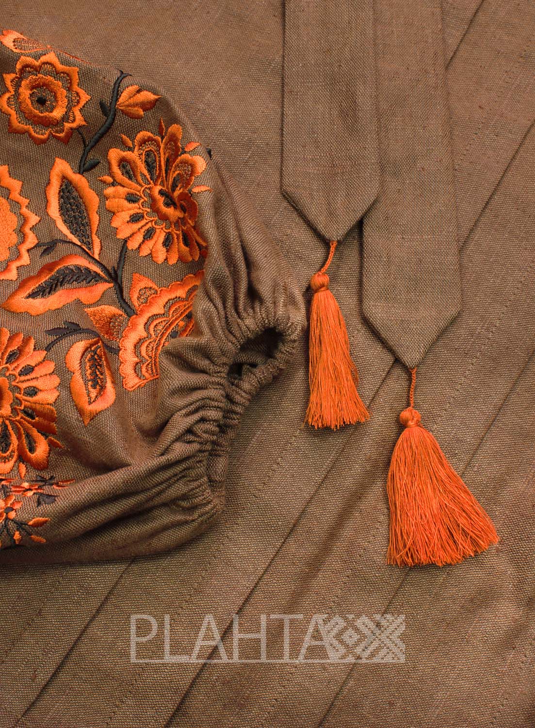 Переплетення традиційного мотиву вишивки з цікавими деталями поєднання кольорів виглядає актуально і "живо", до того ж воно не позбавлене особливого сенсу. Коричневий колір в українській культурі трактується як колір землі, відповідно символізує родючість. А жовтогарячий, використаний у вишивці, - це колір пшениці і меду. Такий колір символізує радість, достаток, багатство і благополуччя. З давніх-давен вважалося, що вишиванка з жовтогарячою вишивкою приносить матеріальний достаток свого носія. На окрему увагу заслуговує мотив, використаний у вишивці - це так зване, "Дерево Життя" - український етнічний обереговий знак, який володіє кількома значеннями - це і Мати-Природа, і Жінка-Мати, а також цей символ уособлював структуру світобудови в розумінні народу. Квіти на Дереві Життя символізують красу і молодість, а птиці - це посланці Божого Духа, що оберігають родину.