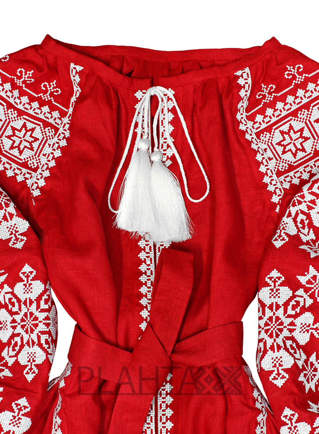 Довжина - 130 см. На планці - застібки-кнопки. З боків сукні клини, прикрашені вишивкою. Горловина і рукава виконані в традиційних українських техніках - "збиранка" та "пухлики". На рукавах - застібки-гудзики. Вишивка хрестиком зроблена на промислових японських вишивальних машинах якісними нитками, що не линяють. Виріб зшитий вручну нашими майстринями.