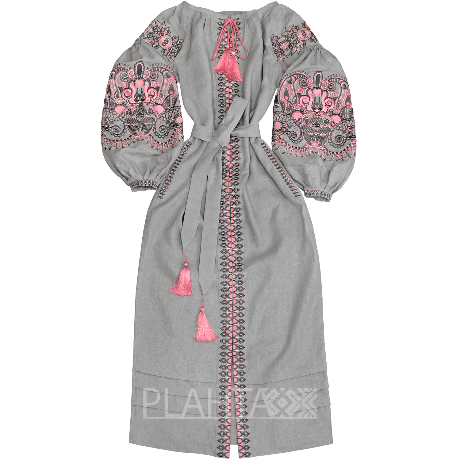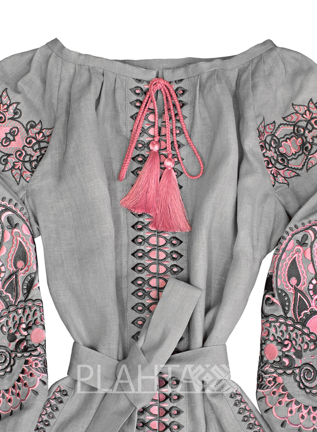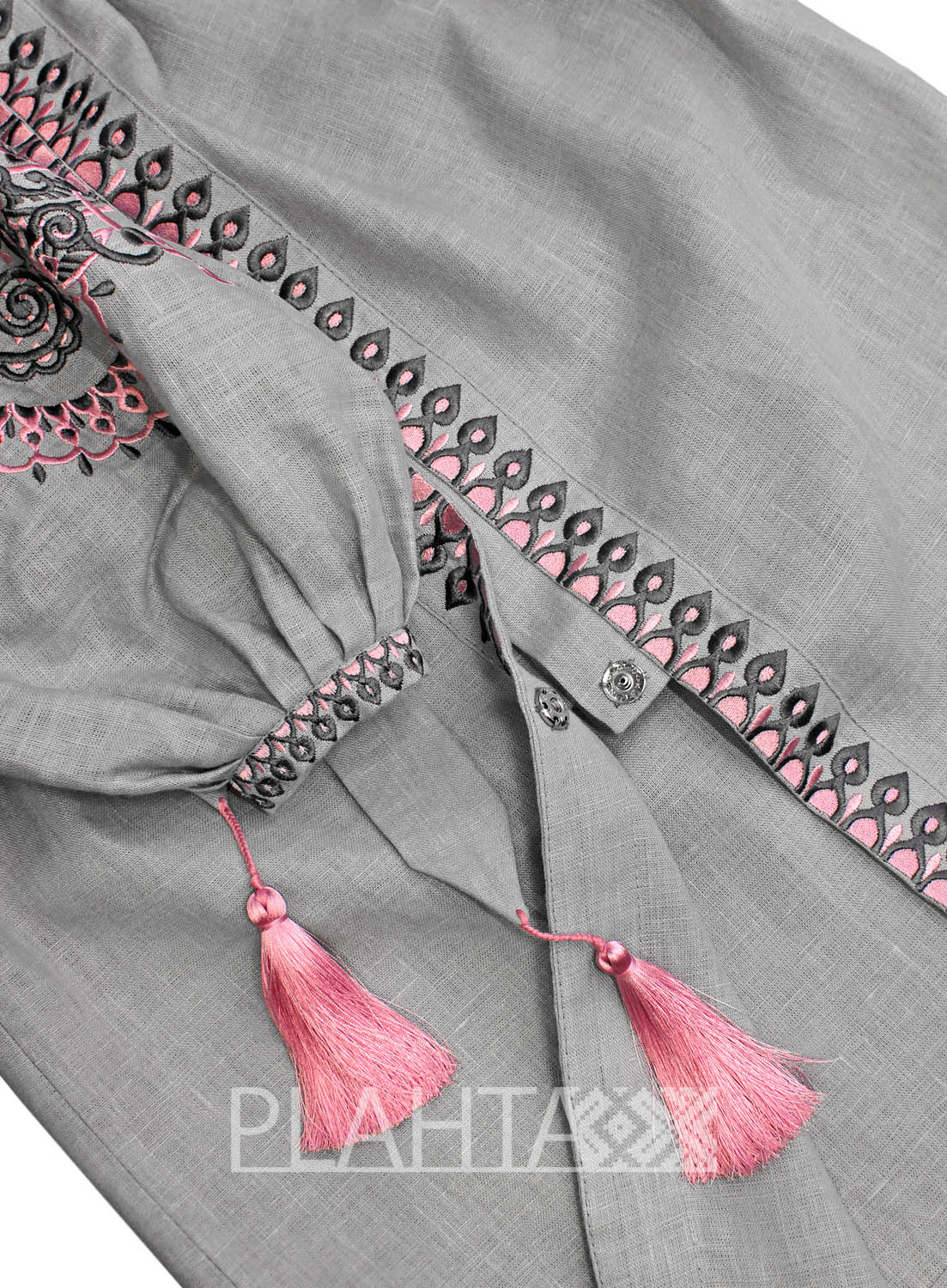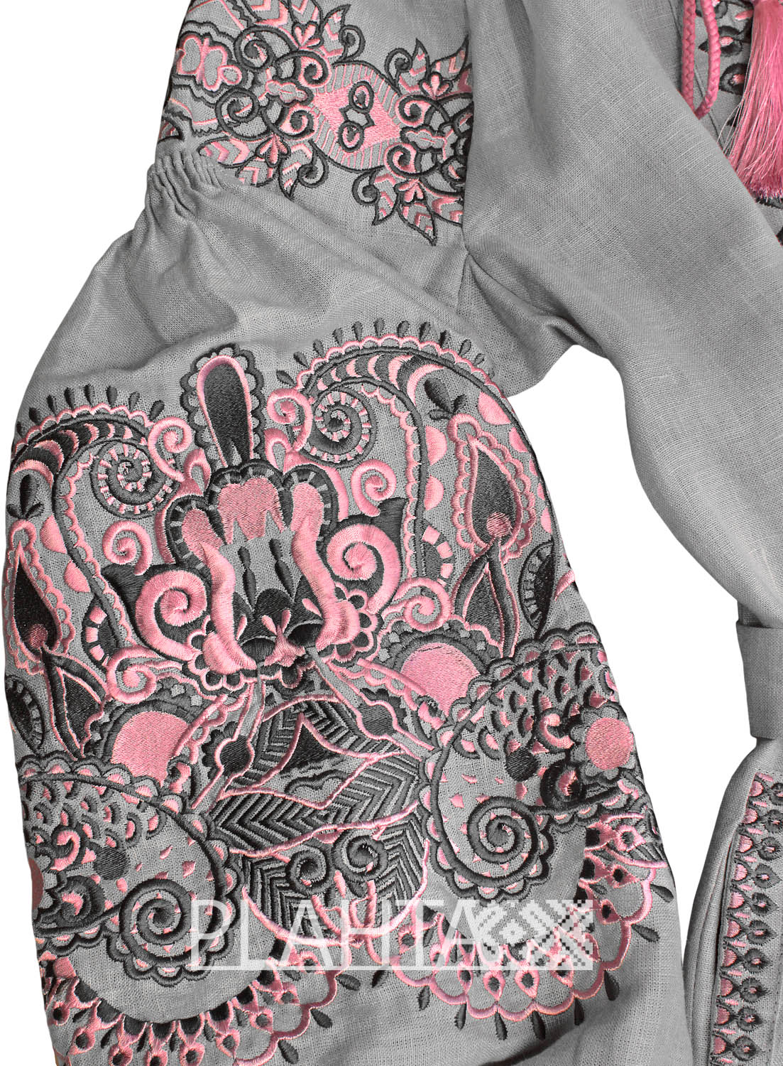Завжди актуальний сірий колір тканини чудово поєднується з блідо-рожевою вишивкою. Рожевий колір на українській вишиванці - символ чуттєвості. В авторській вишивці східного орнаменту  простежуються елементи "Пейслі" ( "буту" на Сході), який ще називають "східний огірок". "Східний огірок" родом з Персії. Це символ руху, розвитку і енергії, який також асоціюють з побажанням щастя і  благополуччя дому.