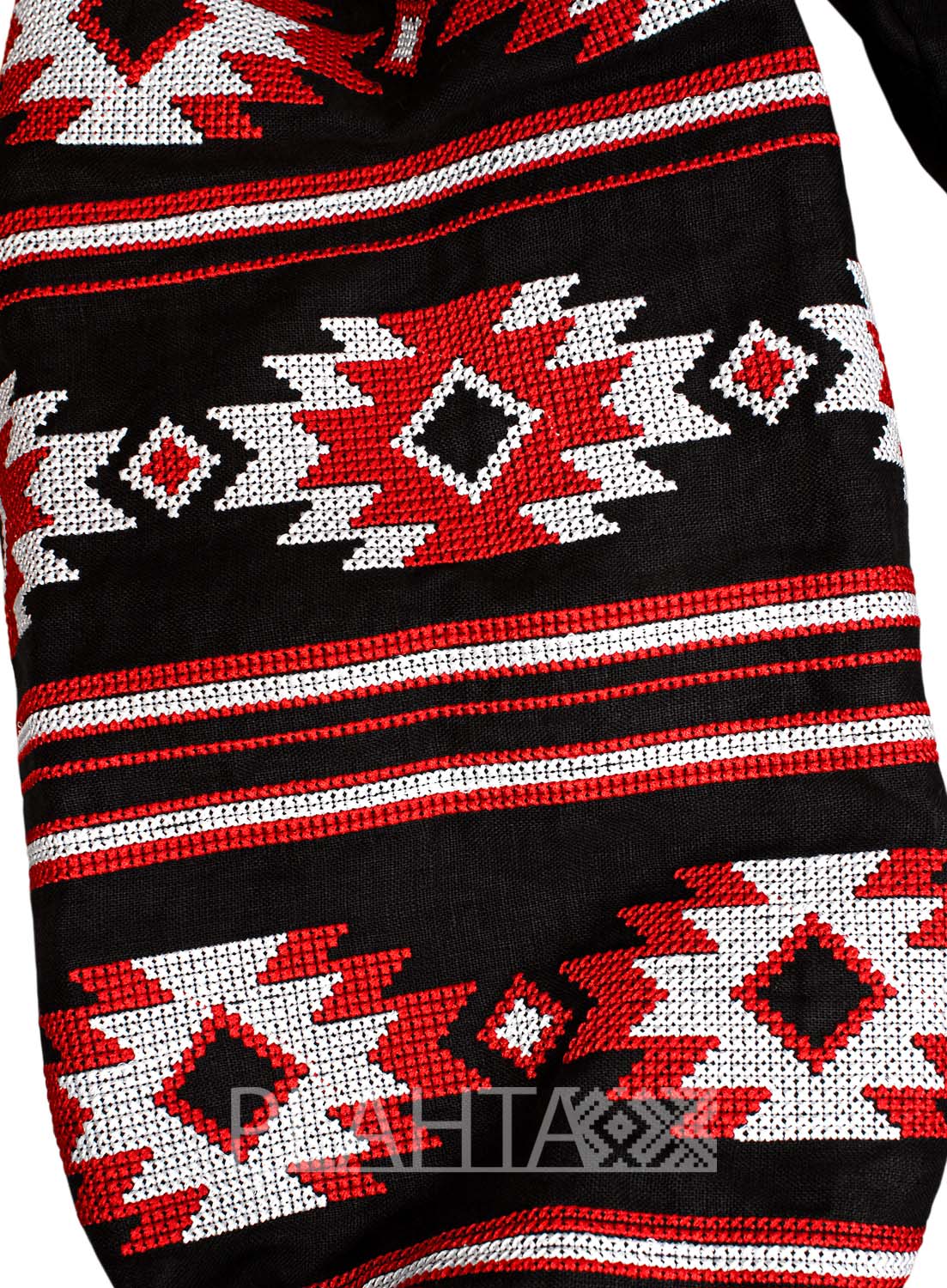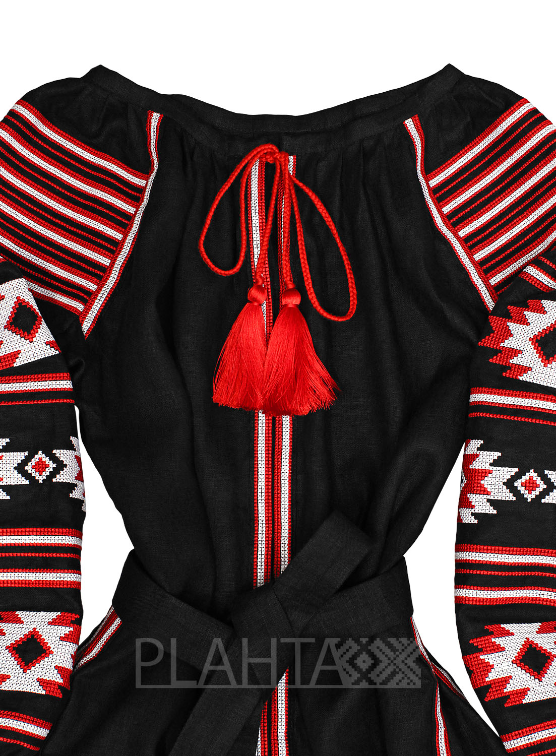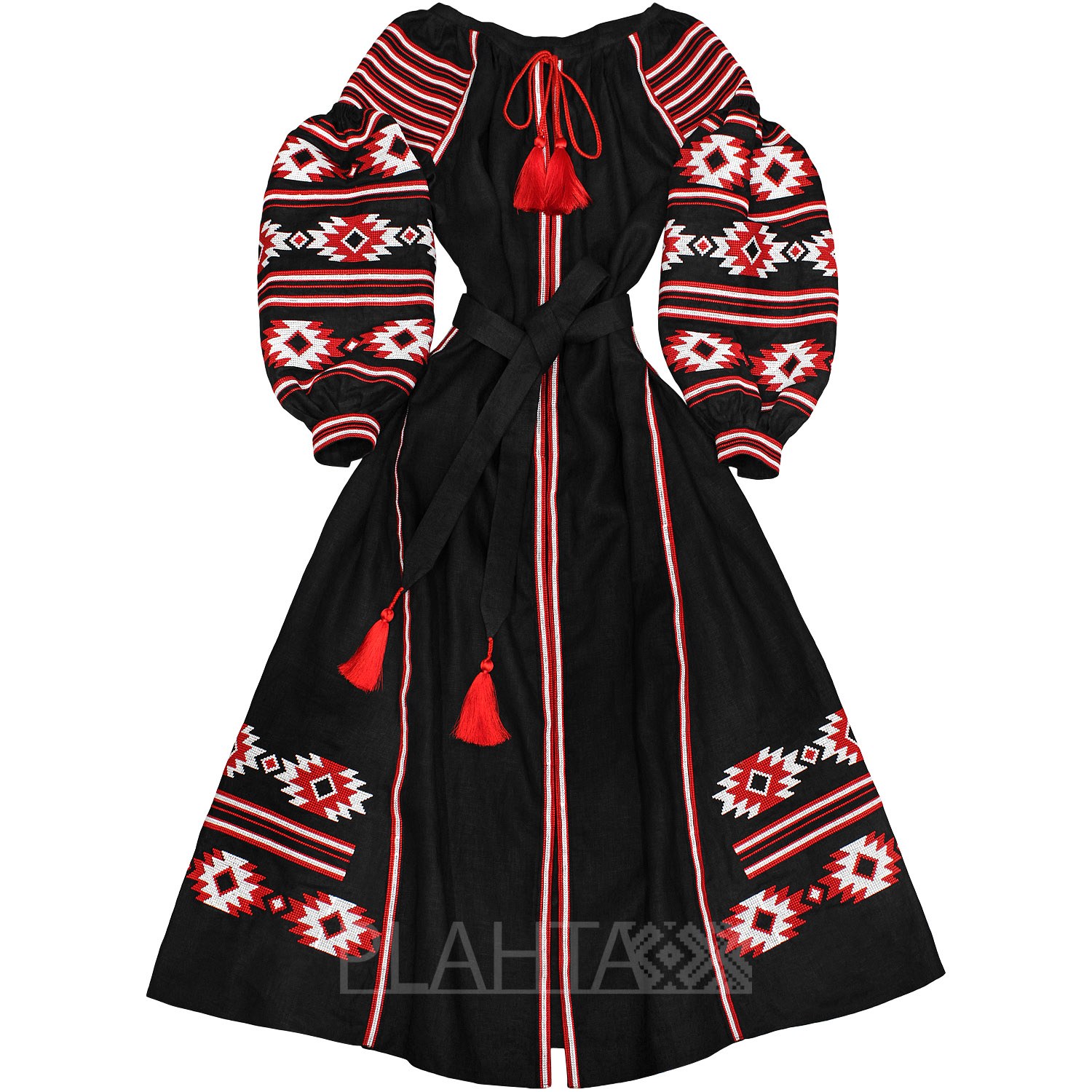 Оригінальна сукня-вишиванка "Вогняний Танок" зачаровує своїм етнічним шармом при першому ж погляді. Контрастні кольори й строгий геометричний орнамент виглядають неймовірно стильно.