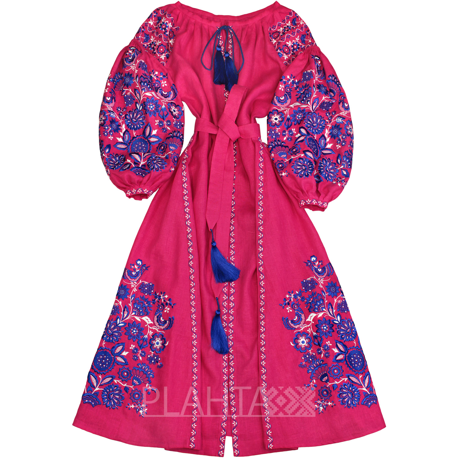 Довжина - 130 см. З боків сукні - клини, прикрашені вишивкою. На планці - застібки-кнопки. Горловина і рукава декоровані в традиційних українських техніках - "збиранка" та "пухлики". На рукавах - застібки-гудзики. Вишивка зроблена на промислових японських вишивальних машинах якісними нитками, що не линяють. Виріб зшитий вручну нашими майстринями.