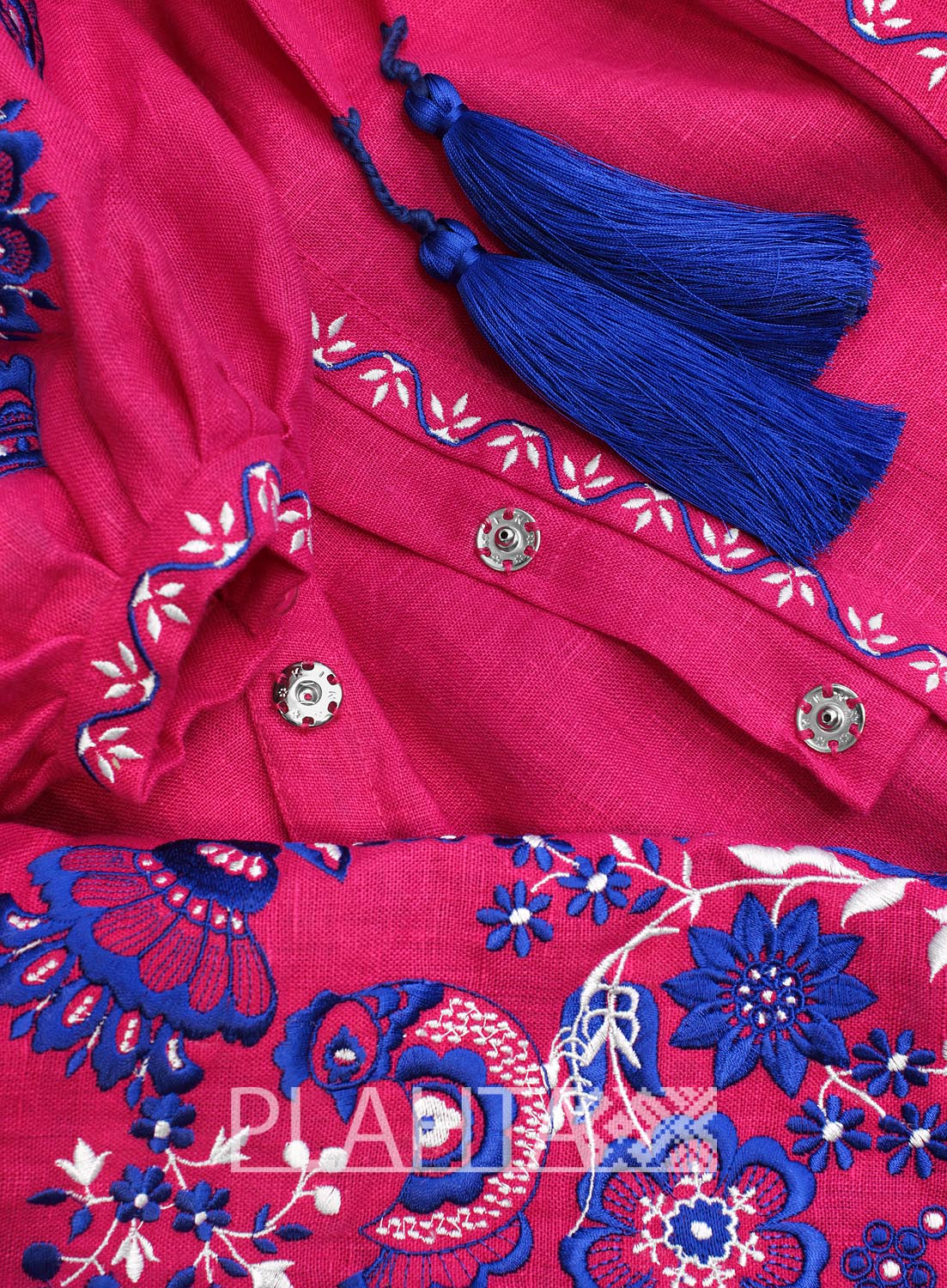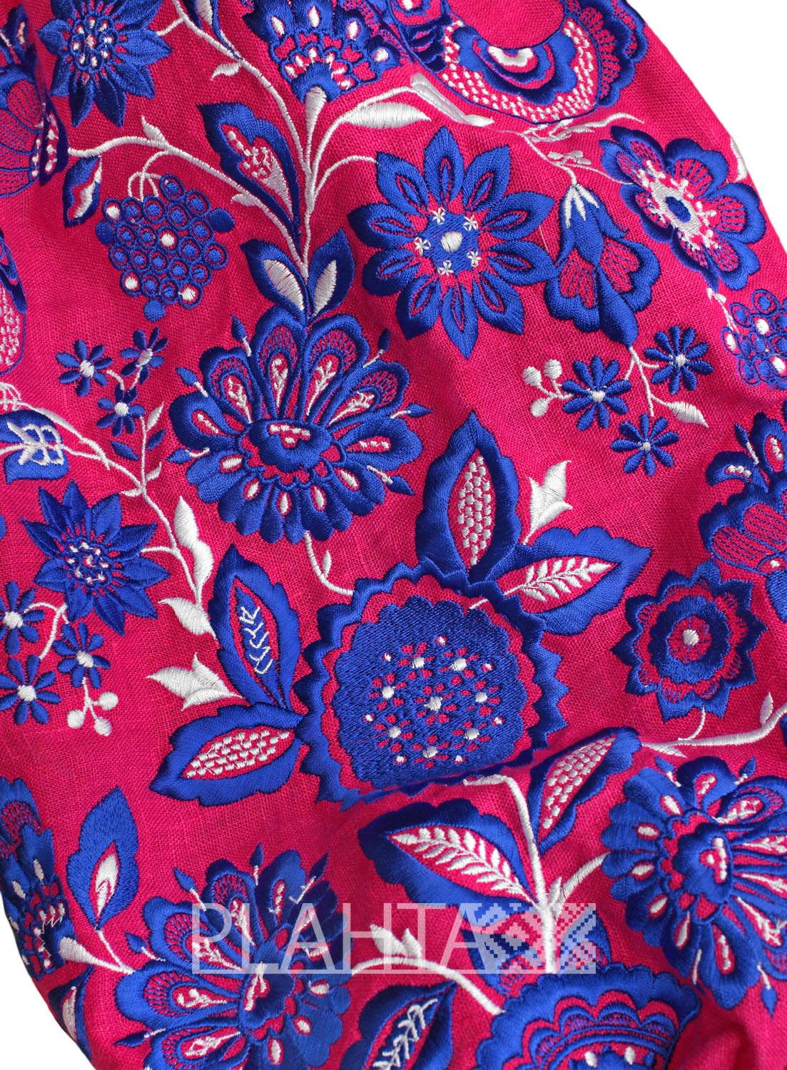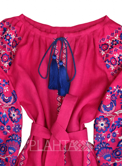 Соковите поєднання малинового льону та синьо-білої вишивки доповнює глибинний архаїчний зміст вишитого мотиву. Так зване, "Дерево Життя" - це український етнічний обереговий знак, який має декілька значень: Мати-Природа, Жінка-Мати, уособлення структури світобудови. Квіти на Дереві Життя символізують красу і молодість, а птиці - це посланці Божого Духа, що оберігають родину.