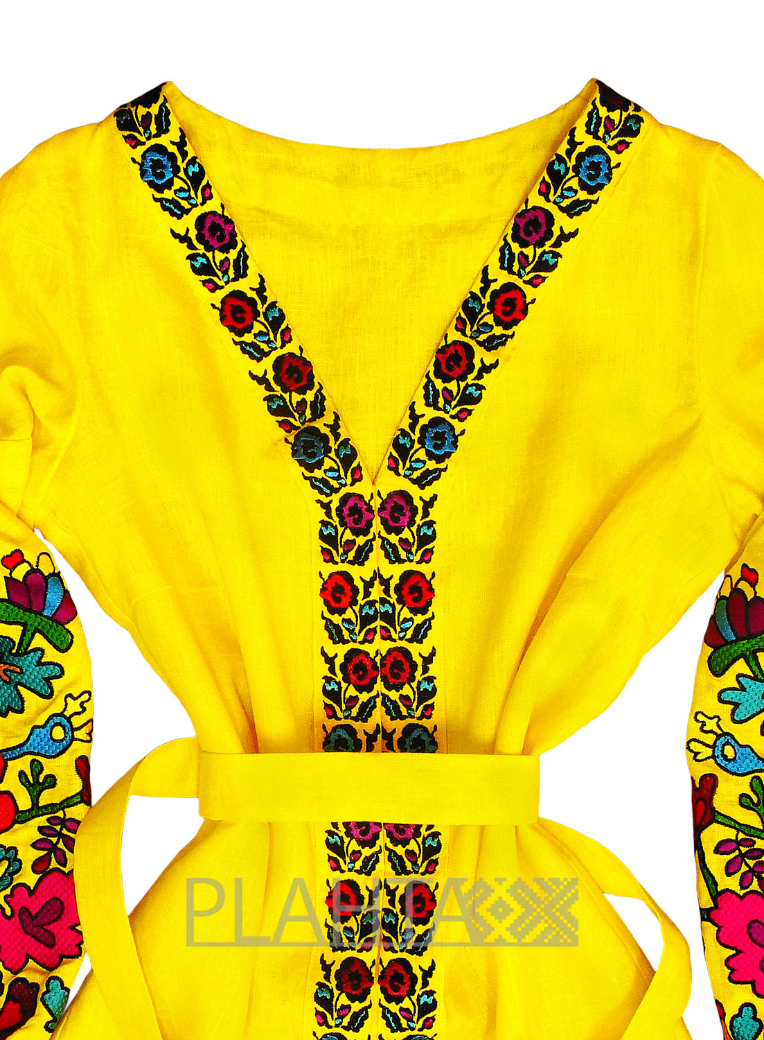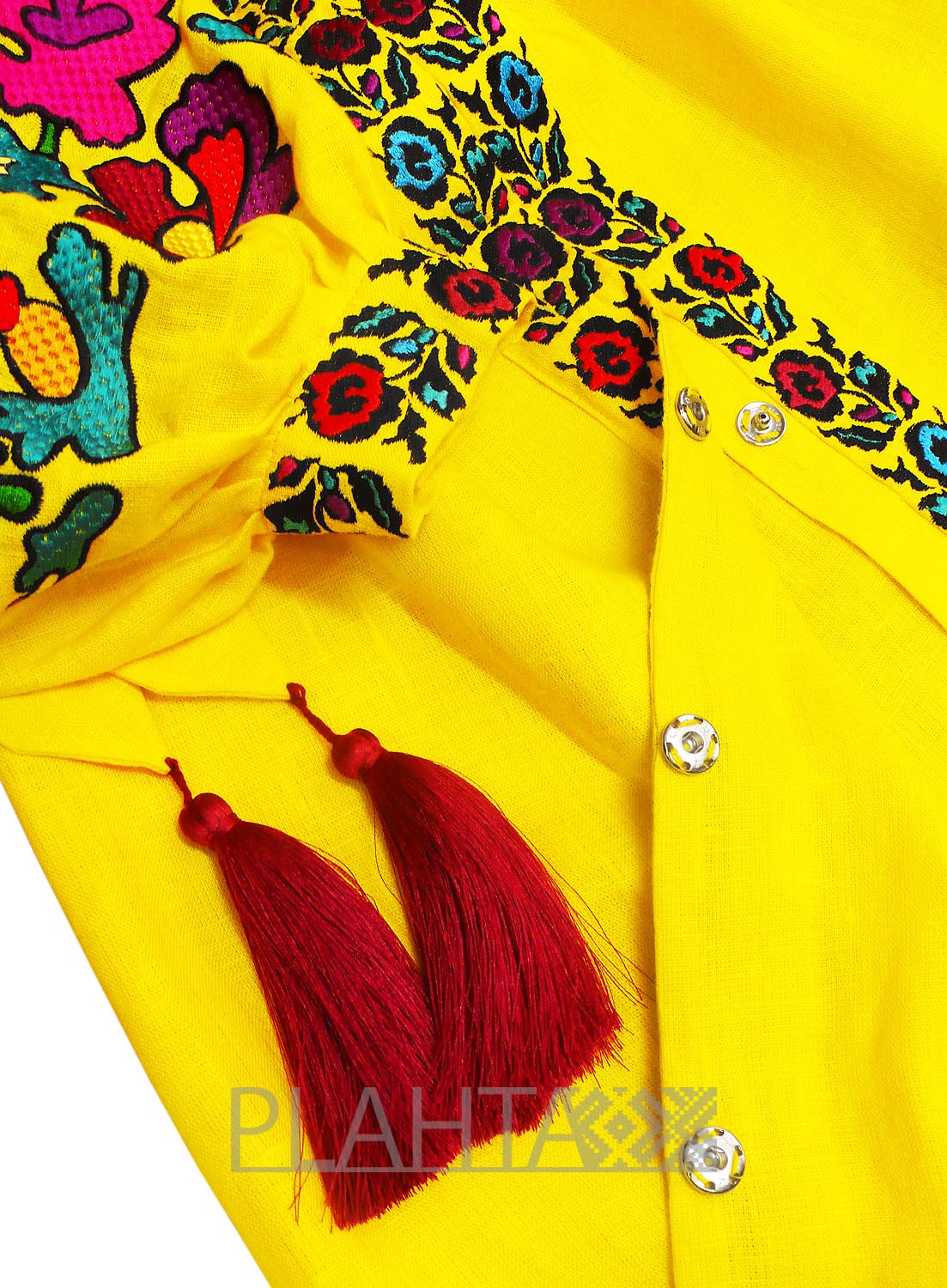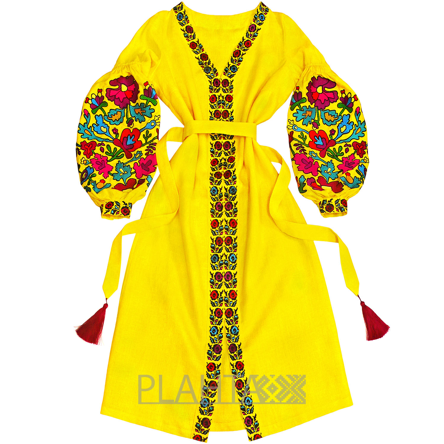 Довжина - 130 см. У сукні V-образна горловина й виточки на грудях. На планці - застібки-кнопки. Рукава виконані в традиційній українській техніці "пухлики". На рукавах - застібки-гудзики. Вишивка зроблена на промислових японських вишивальних машинах якісними нитками, що не линяють. Виріб зшитий вручну нашими майстринями.
