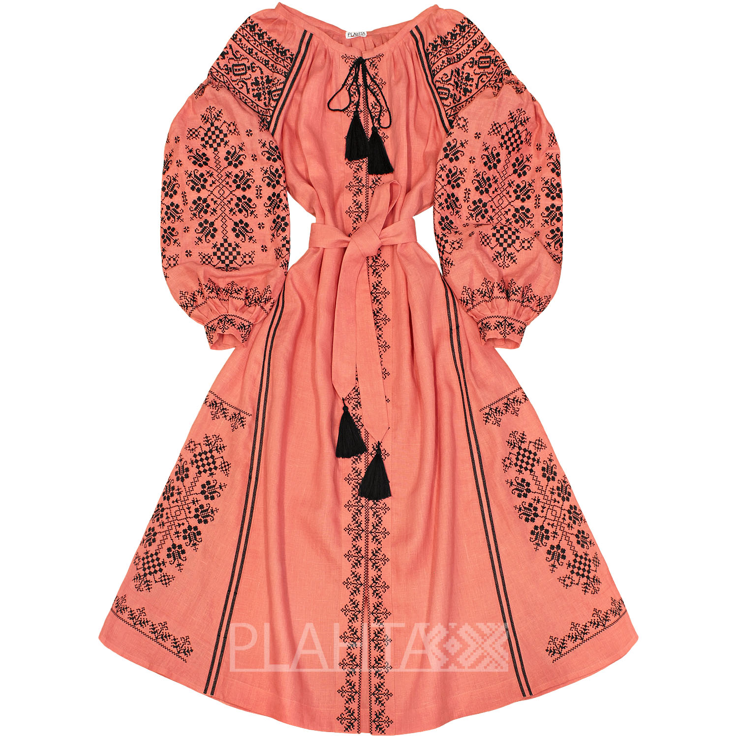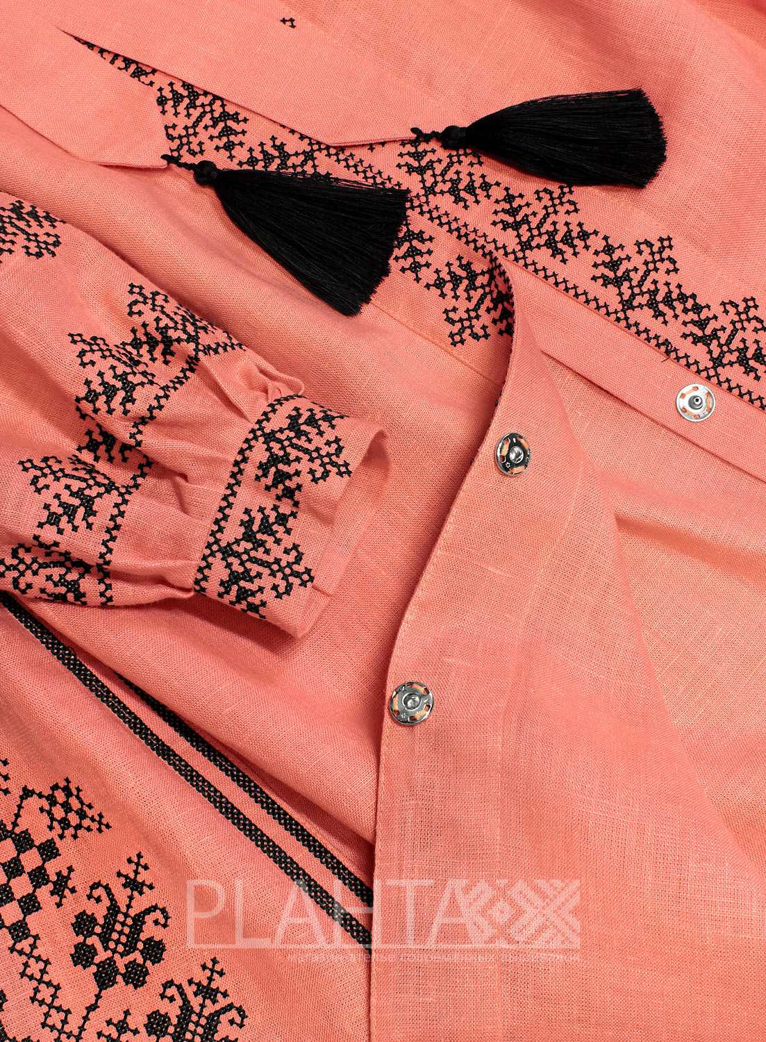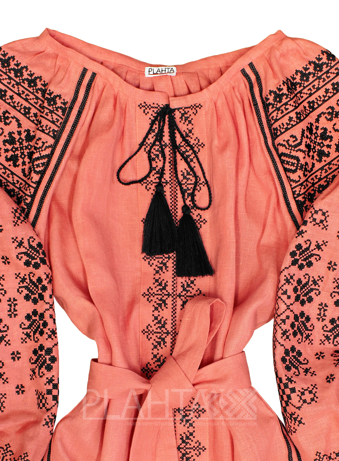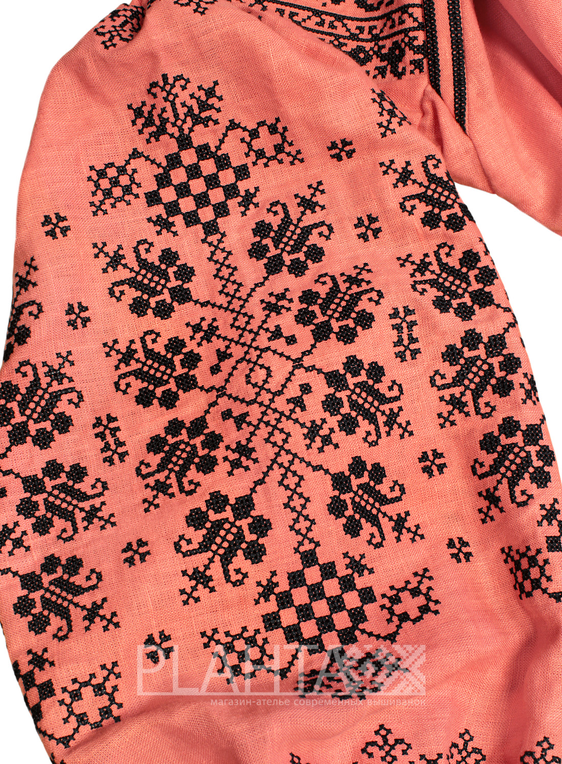Жіночний кораловий колір льону прекрасно поєднується з лаконічною чорною вишивкою. Чорний - це колір землі-годувальниці, відповідно, він символізує родючість. Вишитий хрестиком квітковий орнамент несе сенс, закладений ще в сиву давнину. Квітка на українській вишиванці - символ краси, юності, чистоти і процвітання роду. А повторювані квіти, зібрані в систему орнаменту, символізували уявлення народу про Всесвіт і його нескінченність.
