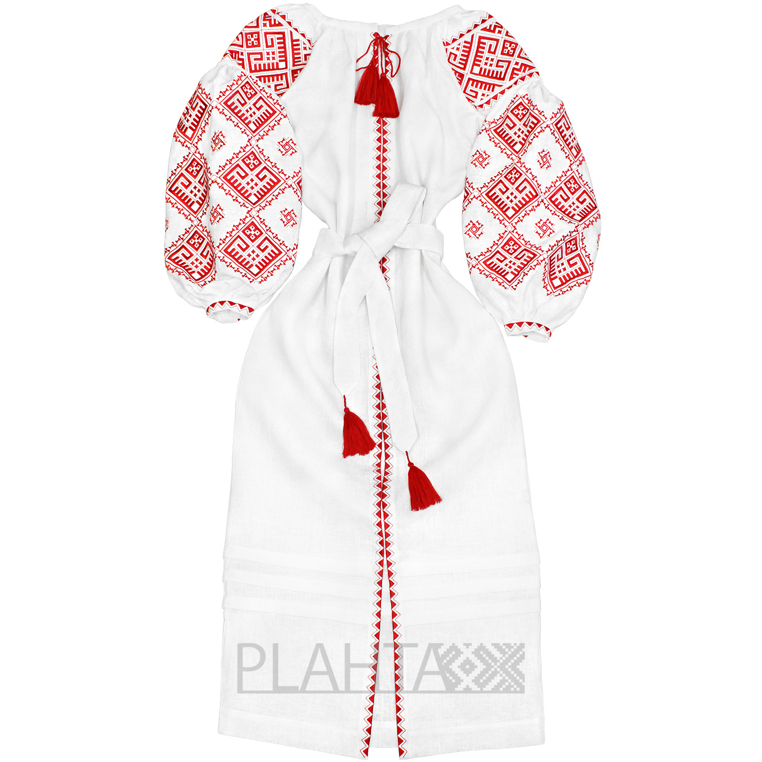Довжина сукні - 130 см. На планці - застібки-кнопки. Горловина і рукава декоровані в традиційних українських техніках - "збиранка" та "пухлики". На рукавах - застібки-гудзики.  Вишивка хрестиком зроблена на промислових японських вишивальних машинах якісними нитками, що не линяють. Виріб зшитий вручну нашими майстринями.