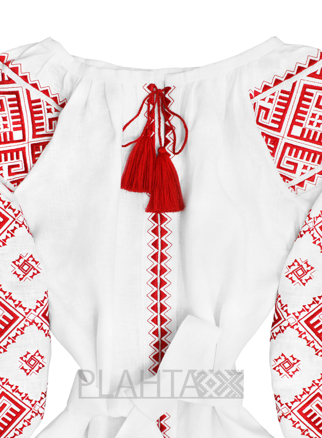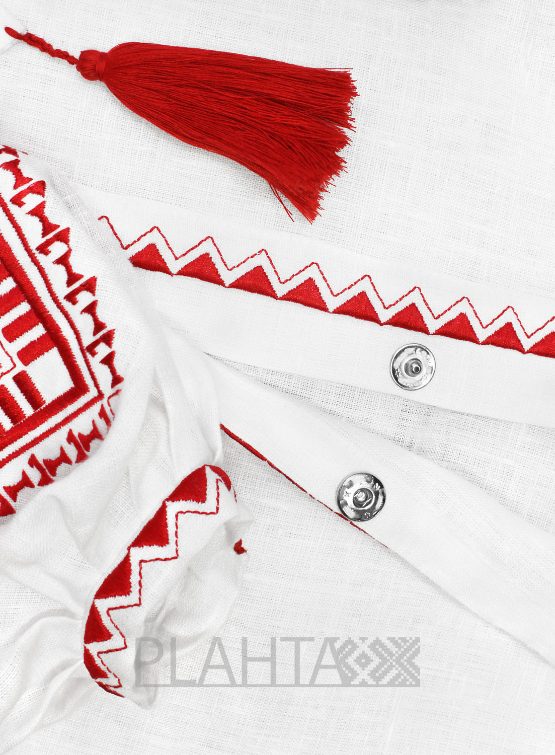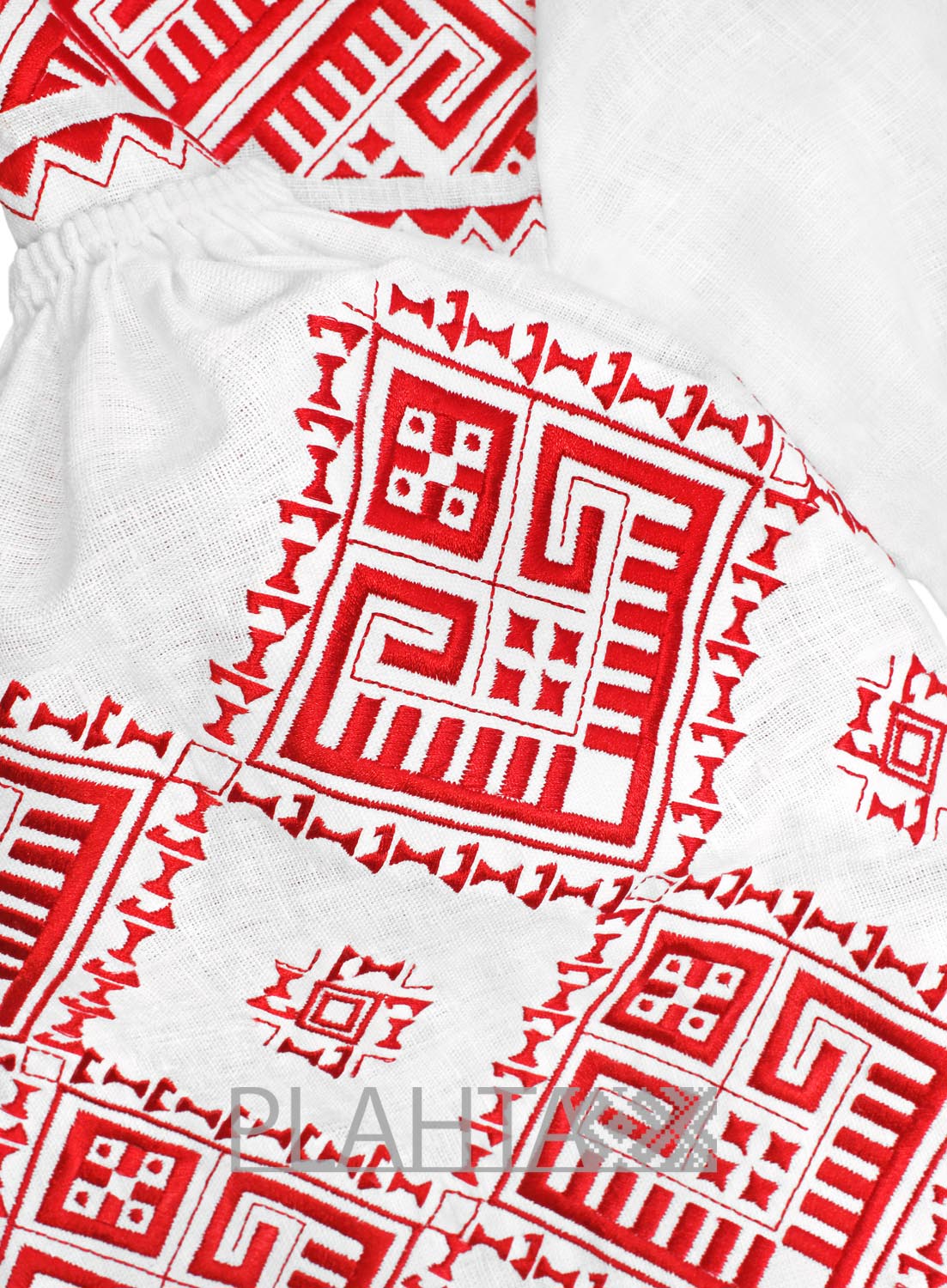 У колориті й вишитому орнаменті закладено глибокий архаїчний символізм. Білий колір символізує чистоту та енергію, а червоний - пристрасть, любов, сонце. У вишивці  використані давньослов'янські сакральні символи. Домінує ромбічний мотив, який є потужним оберегом, що приносить щастя. Ромб - це символ сонця та родючості. Також у вишивці  зустрічається трикутник - символ людини.