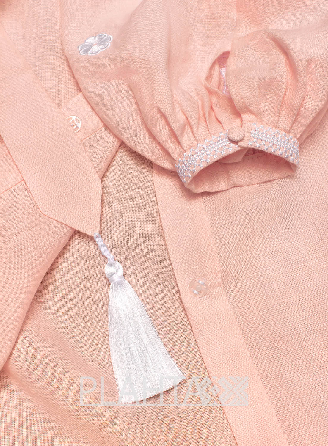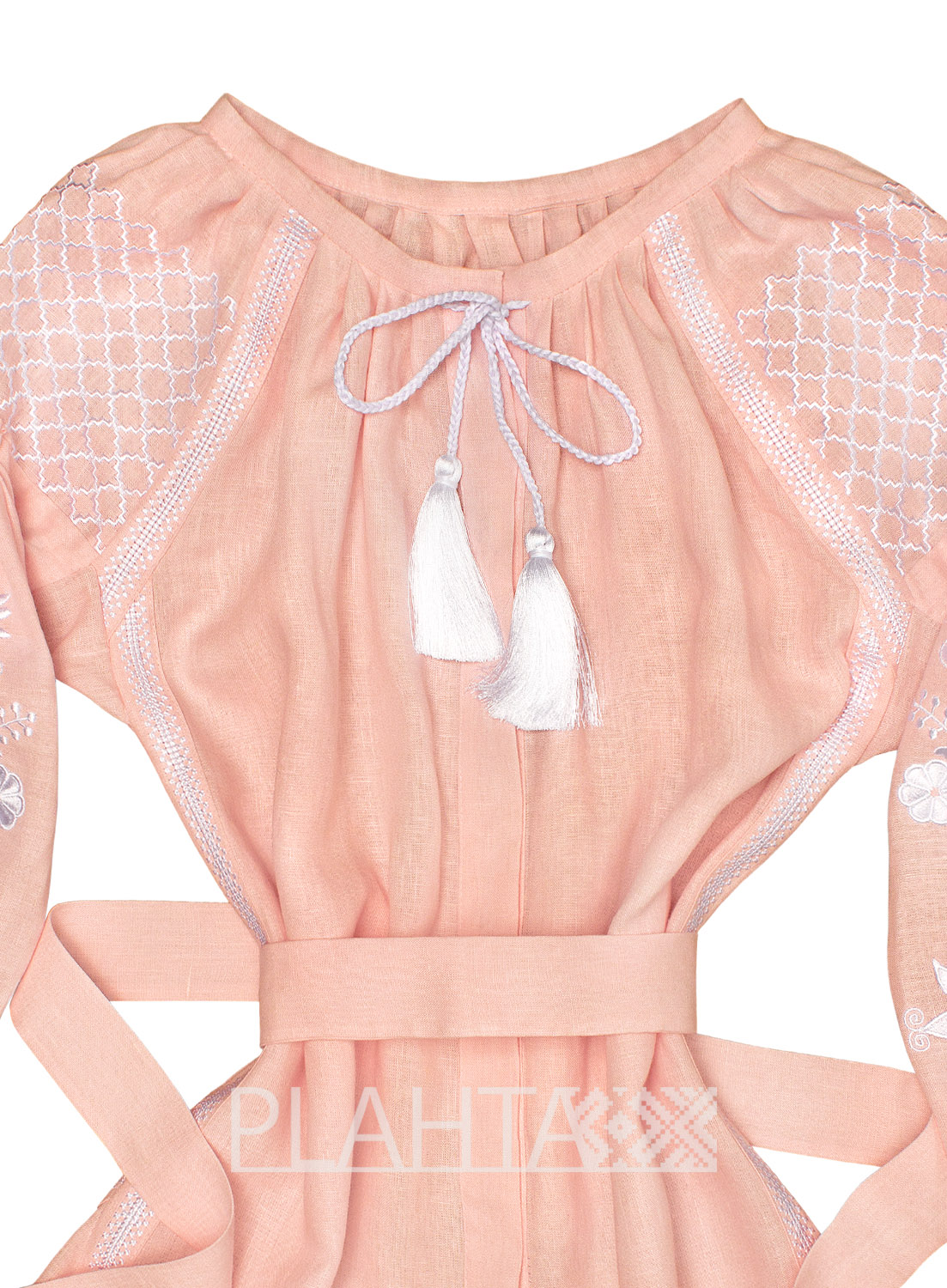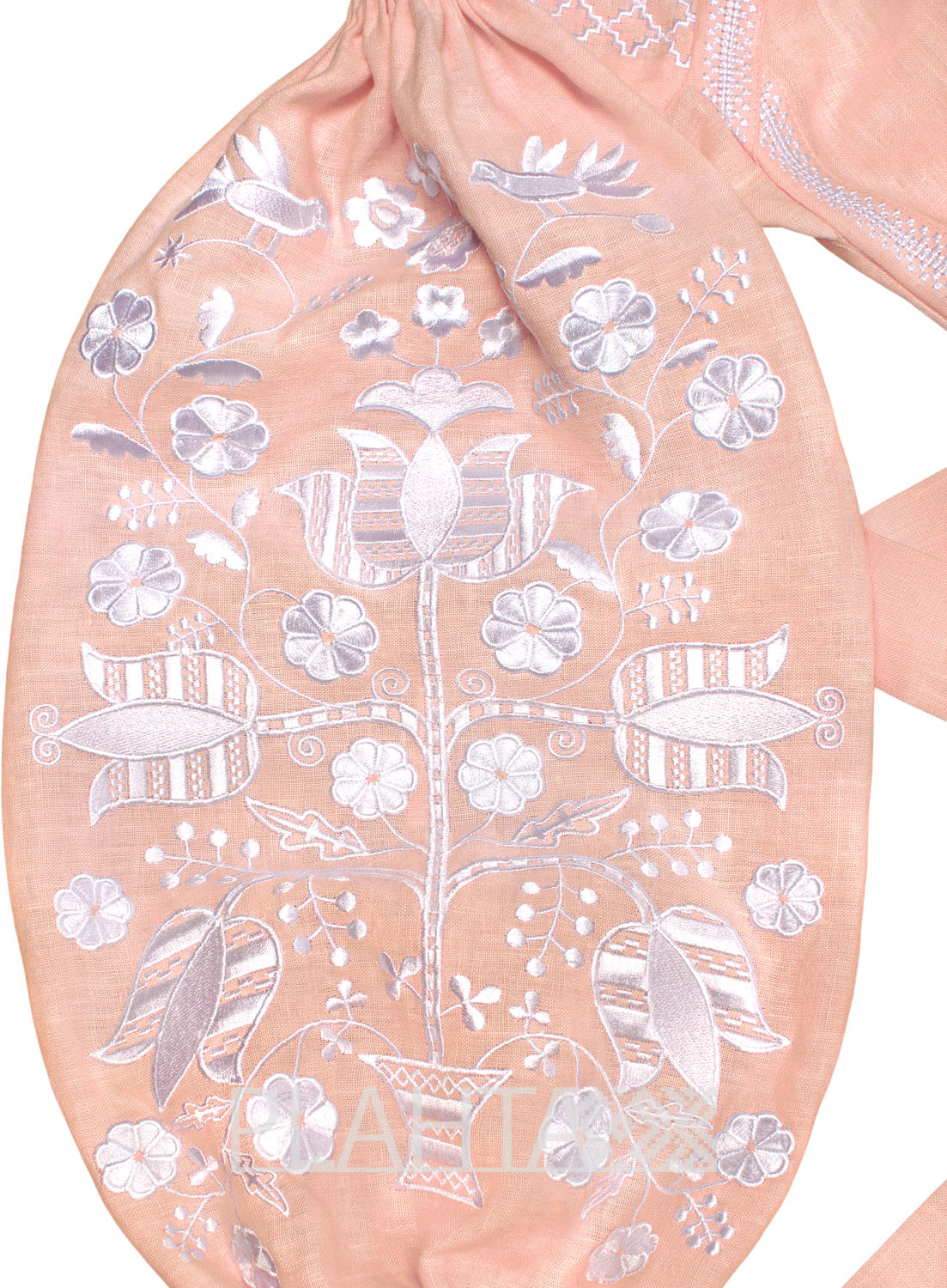 Зі світло-рожевим кольором льону чудово гармонує біла вишивка, що несе глибинний архаїчний зміст. Домінуючий мотив у вишивці - "Дерево Життя". Це один з найдавніших символів, що втілює зв'язок землі з небом. До того ж здавна вважалося, що цей символ приносить щастя й захищає від зла. Квіти на Дереві Життя символізують красу та молодість, а птиці - душу людини.