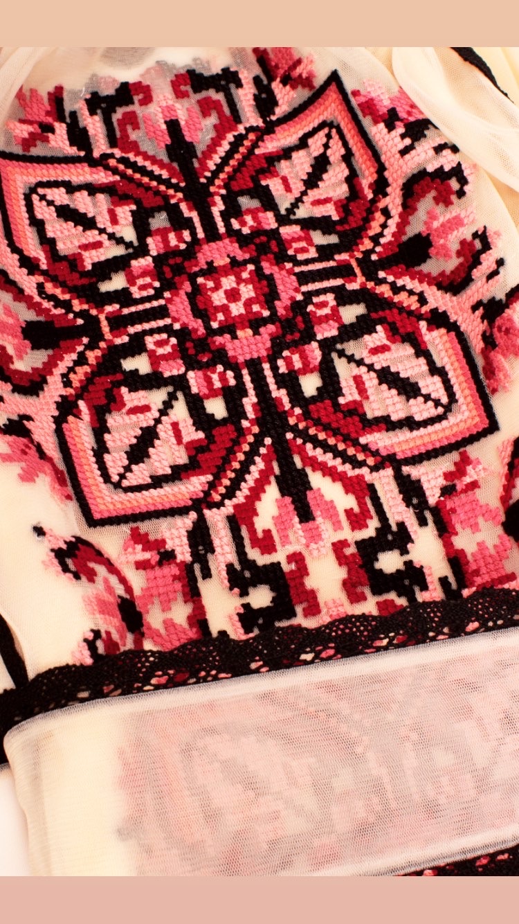 Повітряний фатин прикрашено вишуканою квітковою вишивкою. В українській вишивці квітка - це символ краси, юності та чистоти. Квіти, зібрані в систему орнаменту, символізували уявлення народу про всесвіт і його нескінченність.