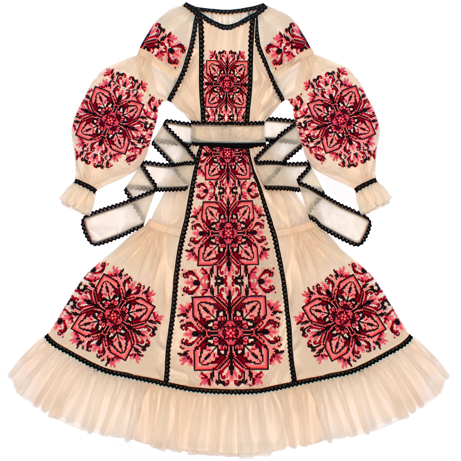Довжина - 140 см. З боків сукні клини, прикрашені вишивкою. Горловина і рукава виконані в традиційних українських техніках - "збиранка" та "пухлики". На рукавах - застібки-гудзики. Вишивка хрестиком зроблена на промислових японських вишивальних машинах якісними нитками, що не линяють. Виріб зшитий вручну нашими майстринями.