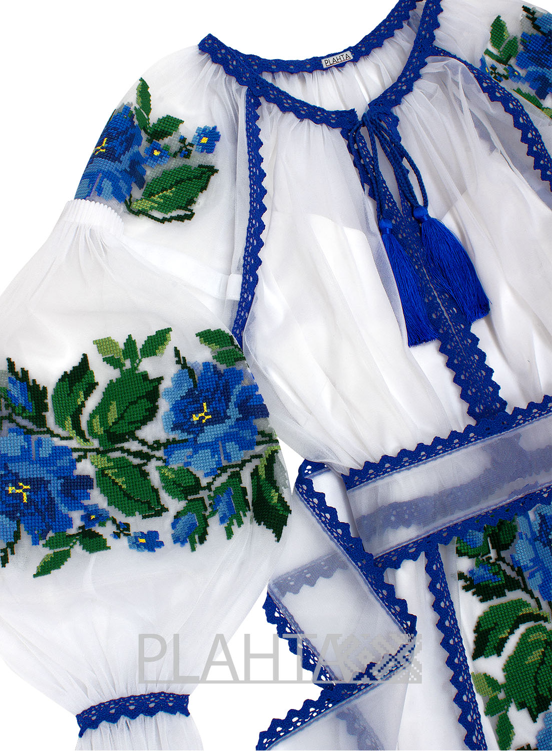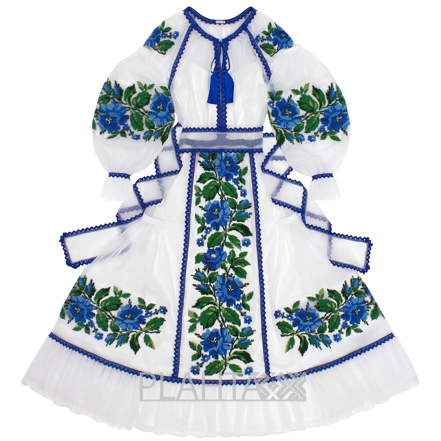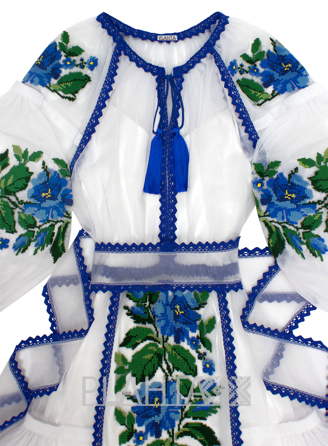 Довжина - 140 см. З боків сукні клини, прикрашені вишивкою. Горловина і рукава виконані в традиційних українських техніках - "збиранка" та "пухлики". На рукавах - застібки-гудзики. Вишивка хрестиком зроблена на промислових японських вишивальних машинах якісними нитками, що не линяють. Виріб зшитий вручну нашими майстринями.