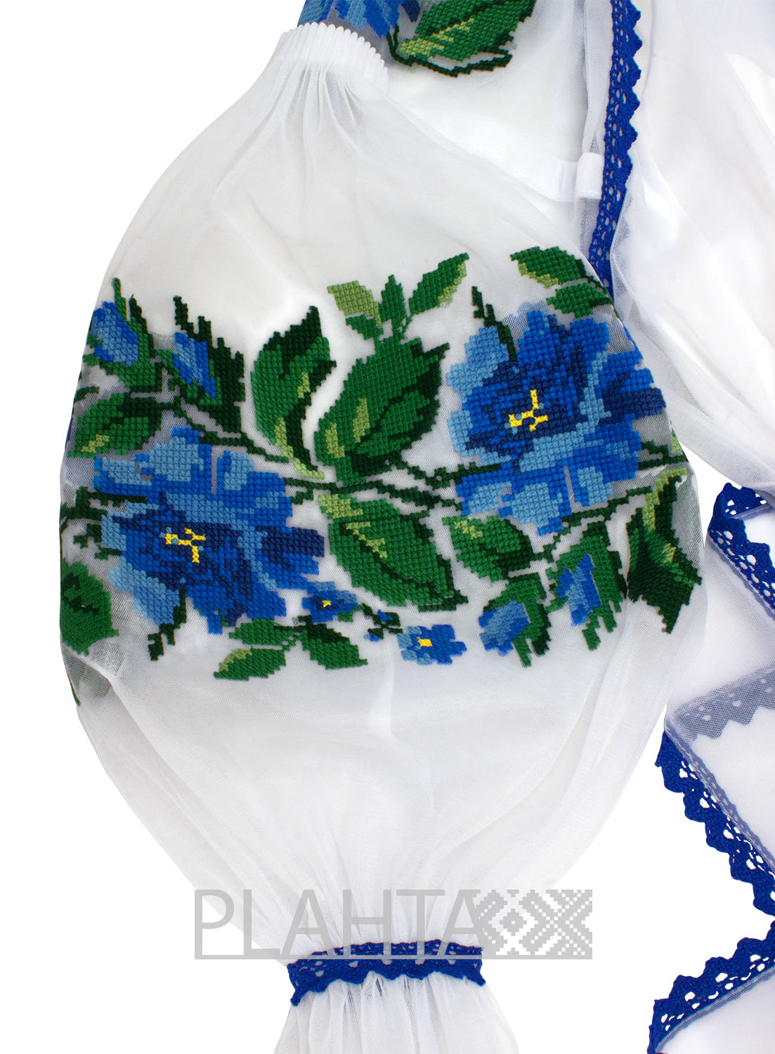 Повітряний фатин прикрашено вишуканою квітковою вишивкою. В українській вишивці квітка - це символ краси, юності та чистоти. Квіти, зібрані в систему орнаменту, символізували уявлення народу про всесвіт і його нескінченність.