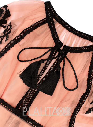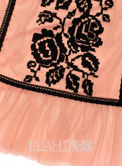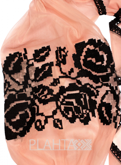 Легкий кораловий фатин прикрашен трояндами, вишитими в автентичному українському стилі. Троянда - улюблена квітка українців, яку здавна вишивали на одязі й рушниках. Ніжні квіти, зібрані в геометричний орнамент, втілюють уявлення людини про Всесвіт як про гармонійну систему. Крім того, троянда - це символ дівочої вроди та привабливості.