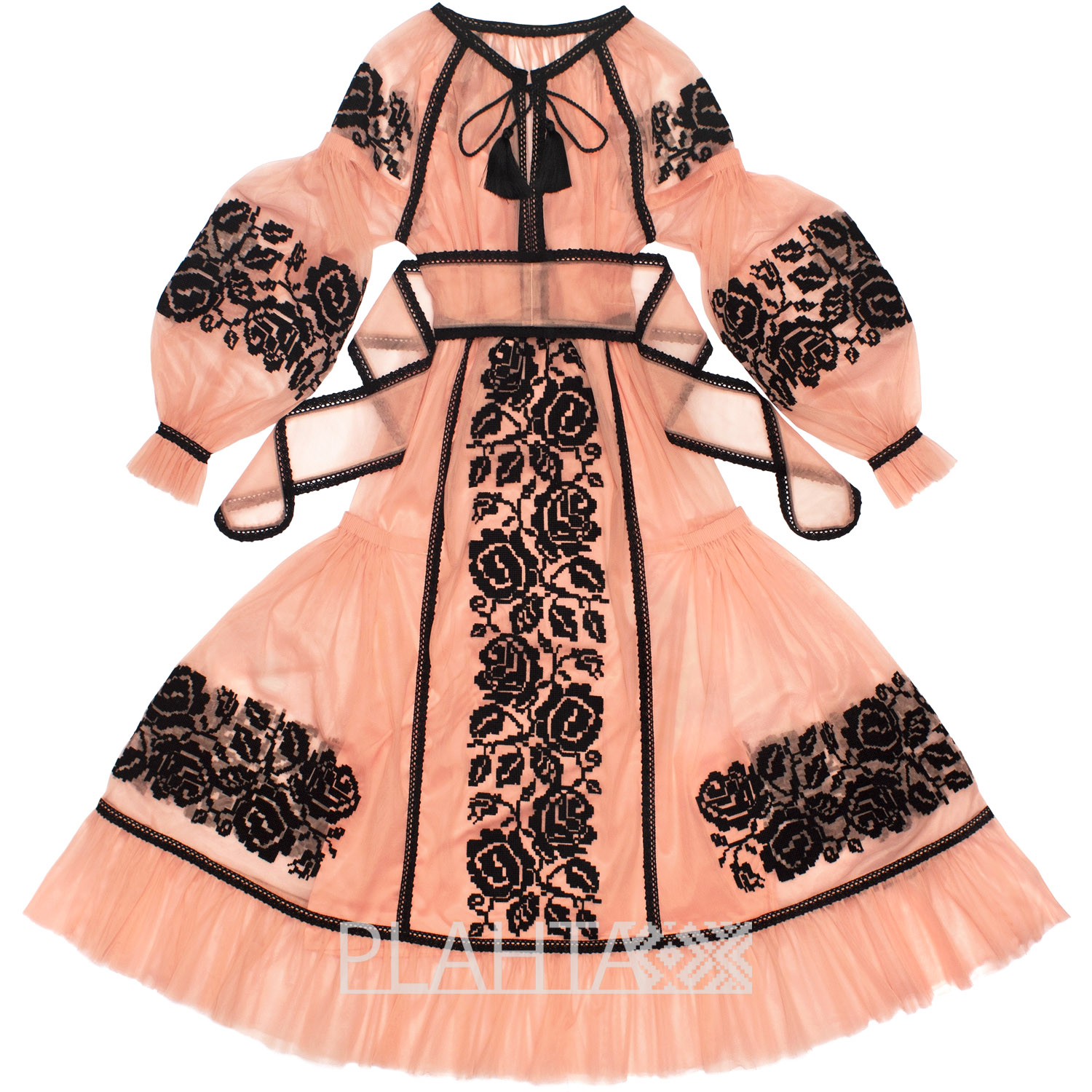 Довжина - 140 см. З боків сукні клини, прикрашені вишивкою. Горловина і рукава виконані в традиційних українських техніках - "збиранка" та "пухлики". На рукавах - застібки-гудзики. Вишивка хрестиком зроблена на промислових японських вишивальних машинах якісними нитками, що не линяють. Виріб зшитий вручну нашими майстринями.