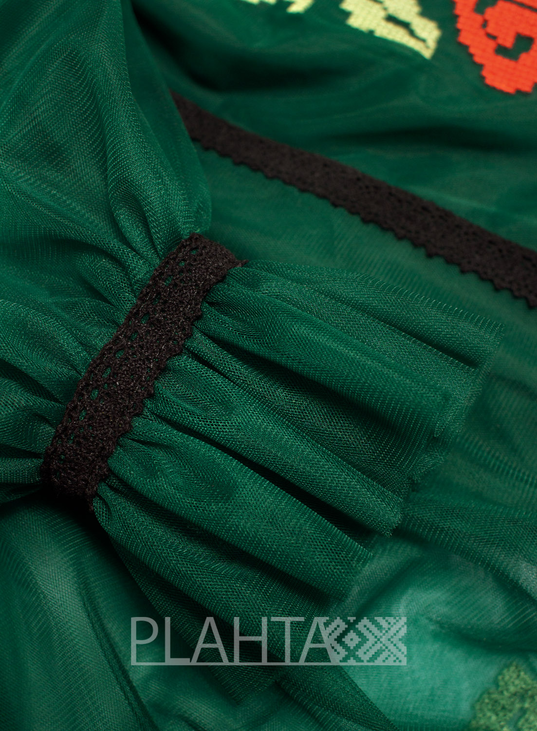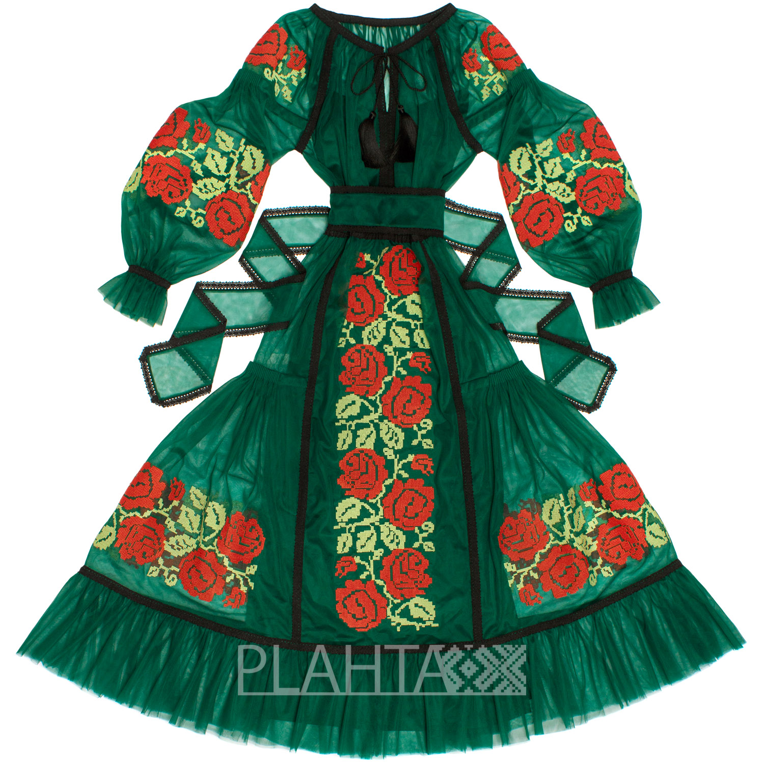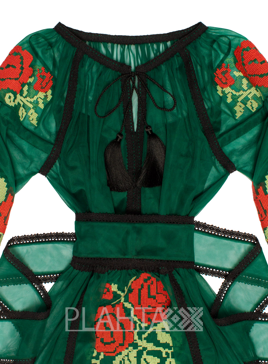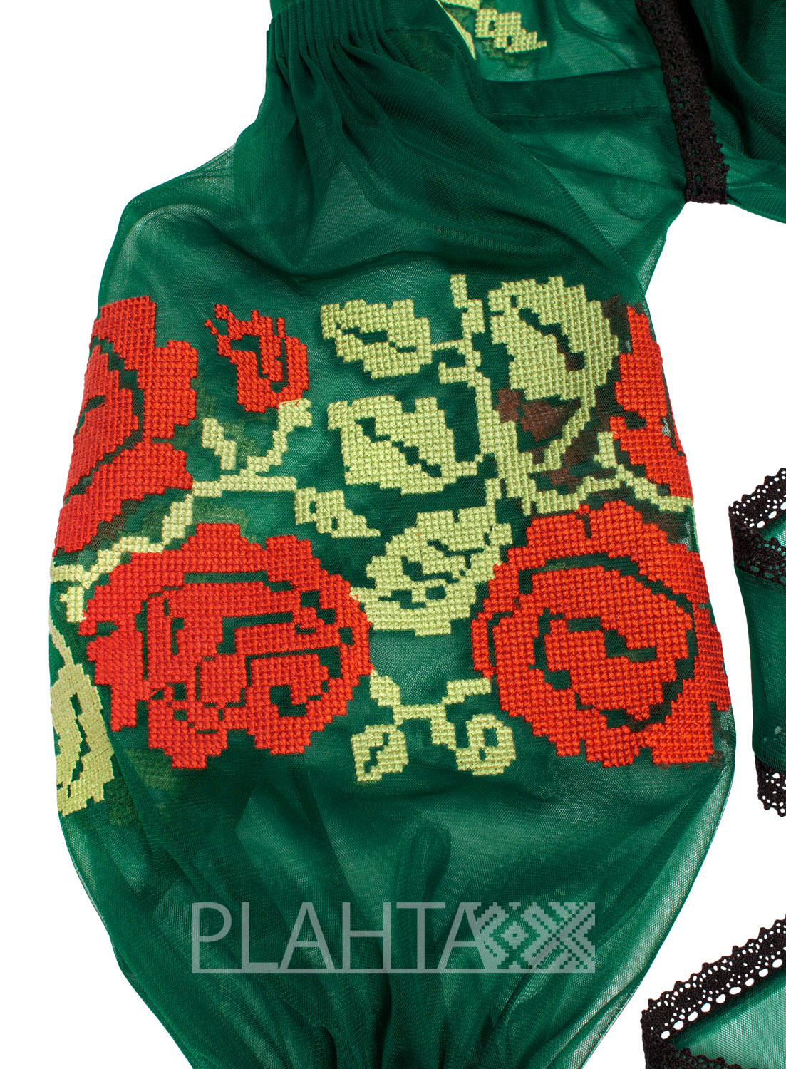 Розкішний темно-зелений фатин прикрашен трояндами, вишитими в автентичному українському стилі. Троянда - улюблена квітка українців, яку здавна вишивали на одязі й рушниках. Ніжні квіти, зібрані в геометричний орнамент, втілюють уявлення людини про Всесвіт як про гармонійну систему. Крім того, троянда - це символ дівочої вроди та привабливості.