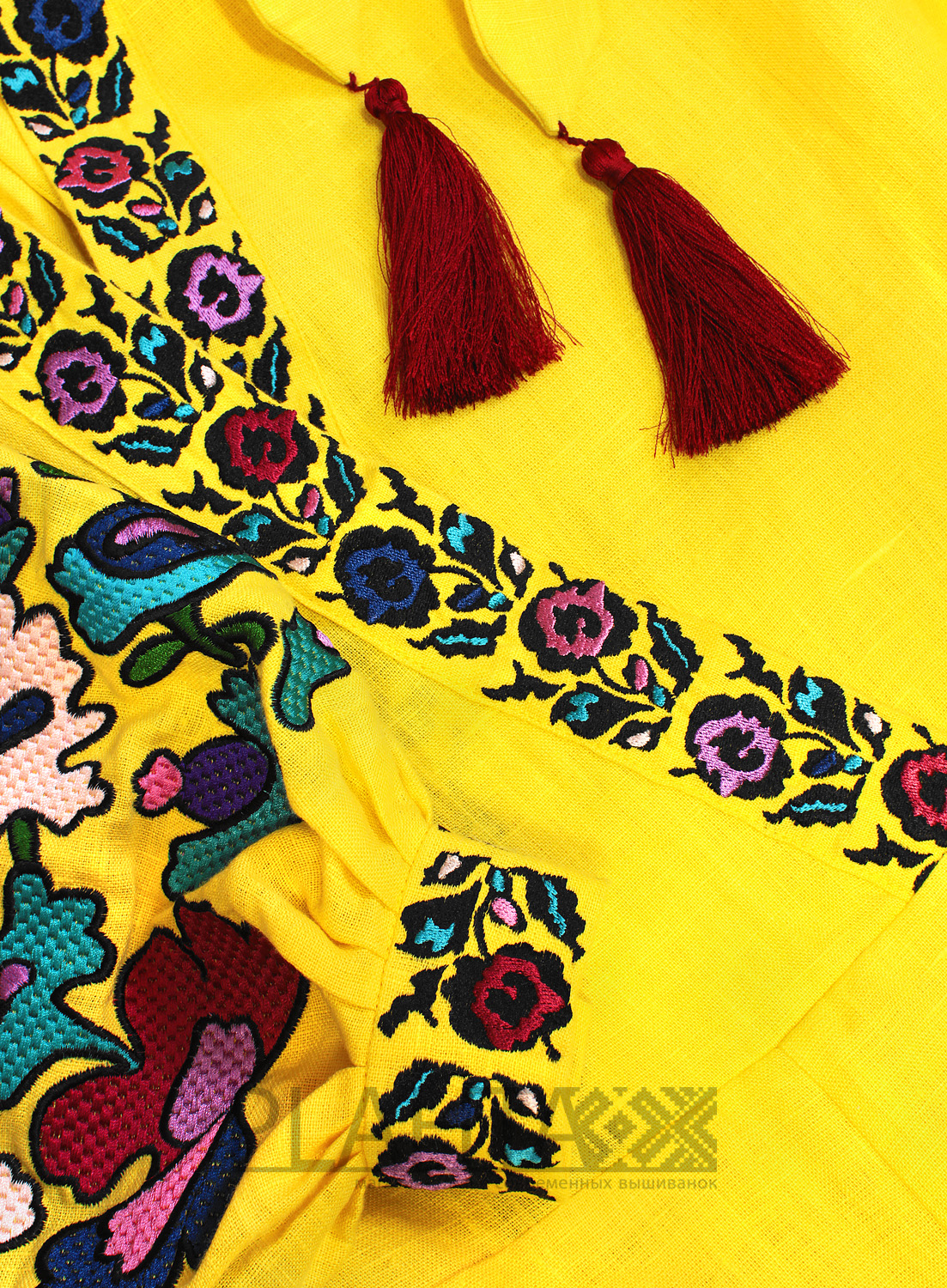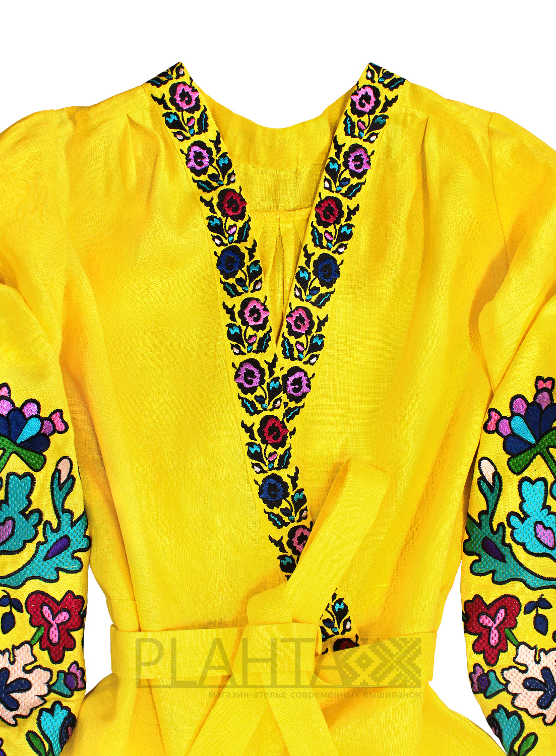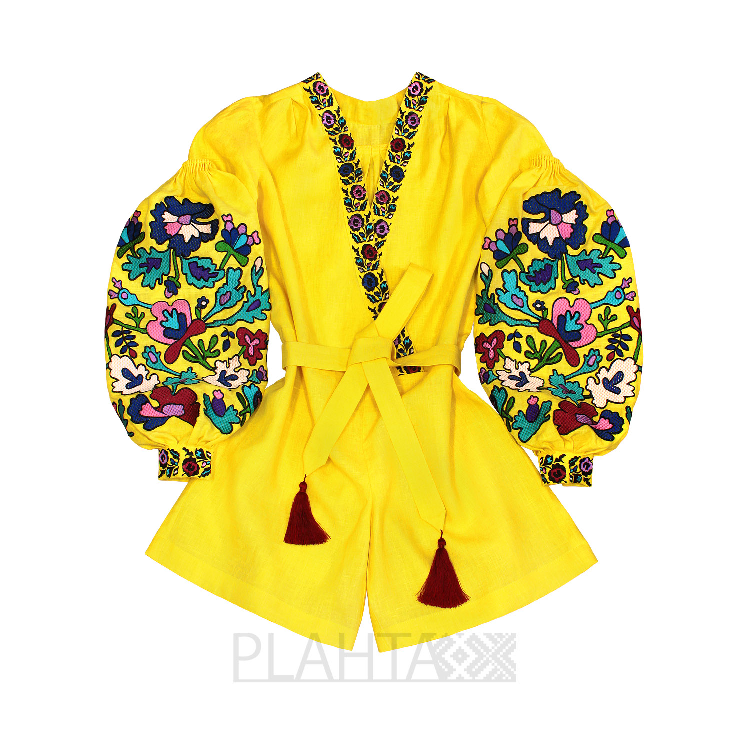 Довжина комбінезона - 85 см. Пошиття - цілісний фасон із запахом на кнопці. Для декорування рукавів використана традиційна українська техніка - "пухлики". На рукавах - застібки-гудзики. Вишивка зроблена на промислових японських вишивальних машинах якісними нитками, що не линяють. Виріб зшитий вручну нашими майстринями.