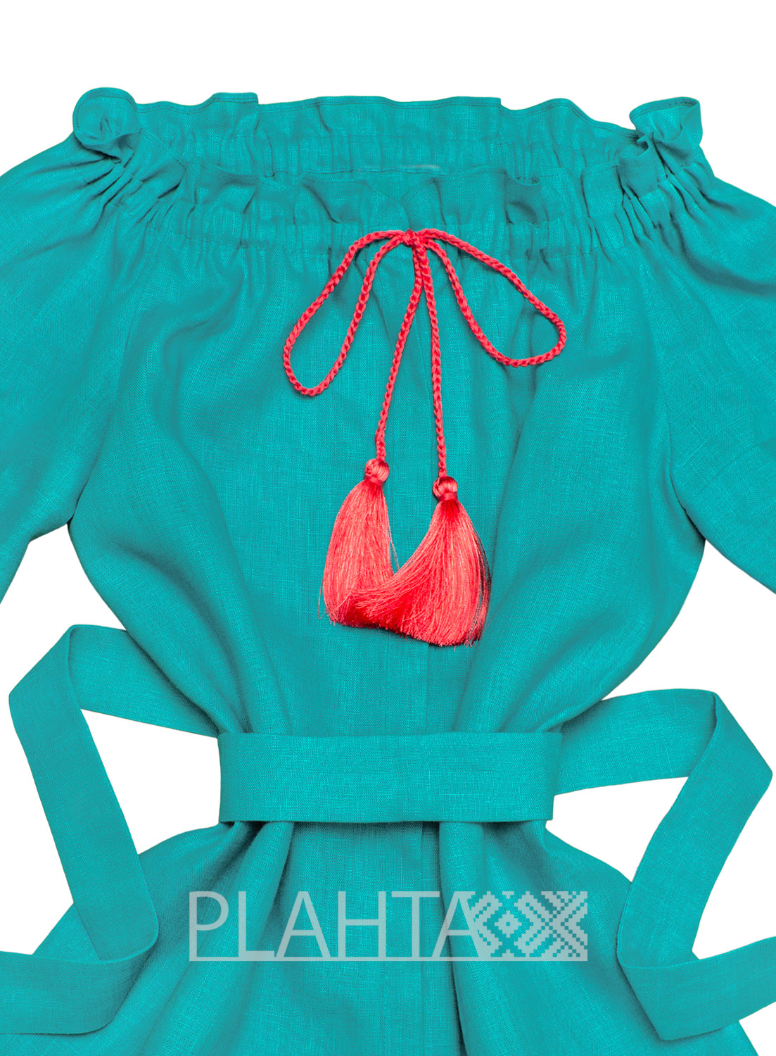 Довжина сукні - 86 см. На планці - застібки-кнопки. Рукава декоровані в традиційній українській техніці - "пухлики". Резинка на горловині сукні дозволяє оголити плечі. На манжетах - зав'язки-шнурки. Вишивка зроблена на промислових японських вишивальних машинах якісними нитками, що не линяють. Виріб зшитий вручну нашими майстринями.