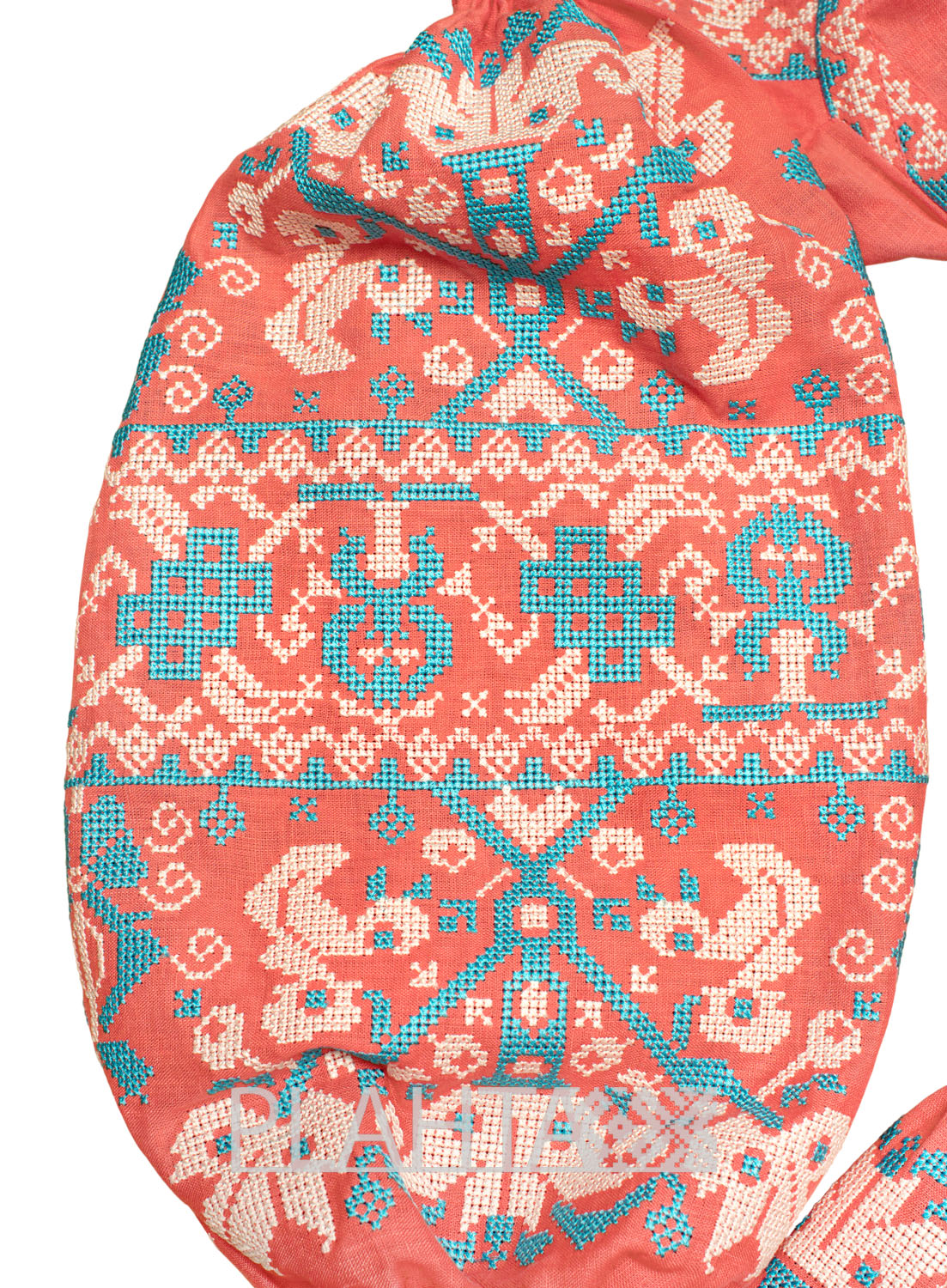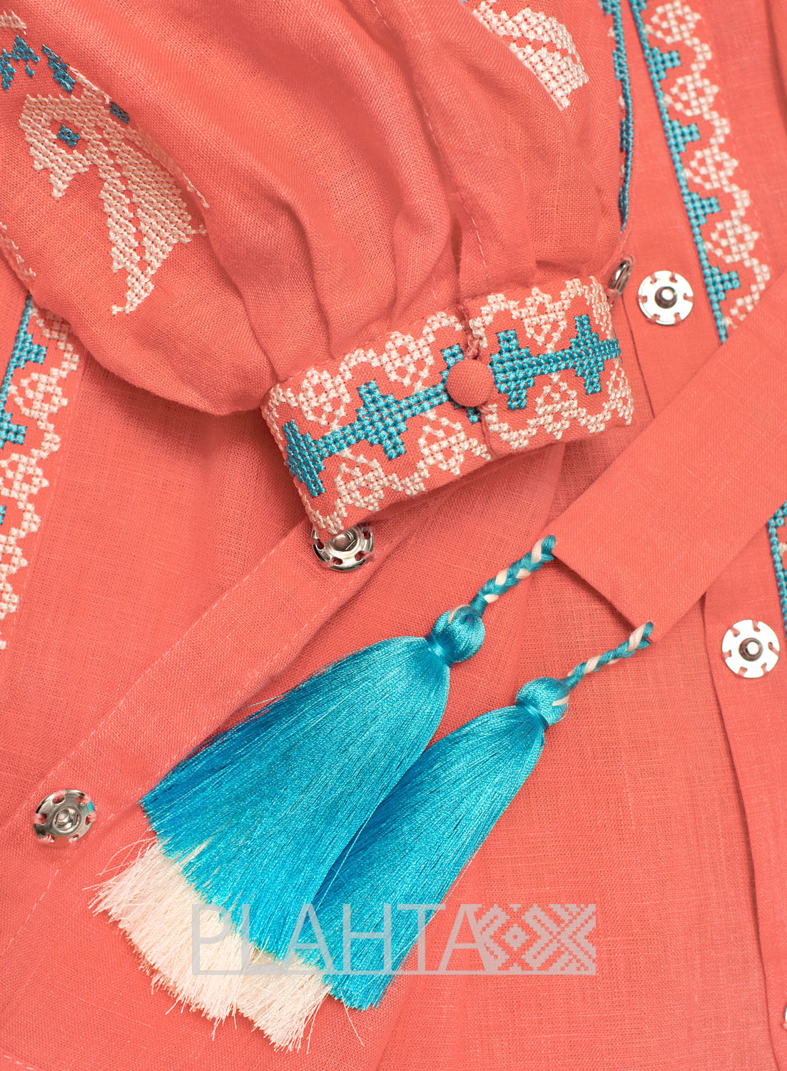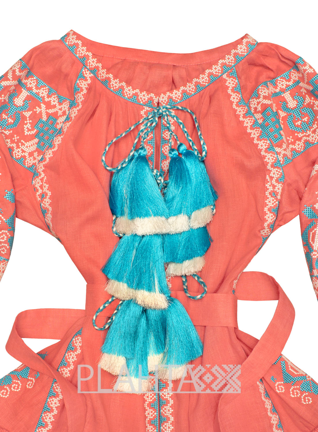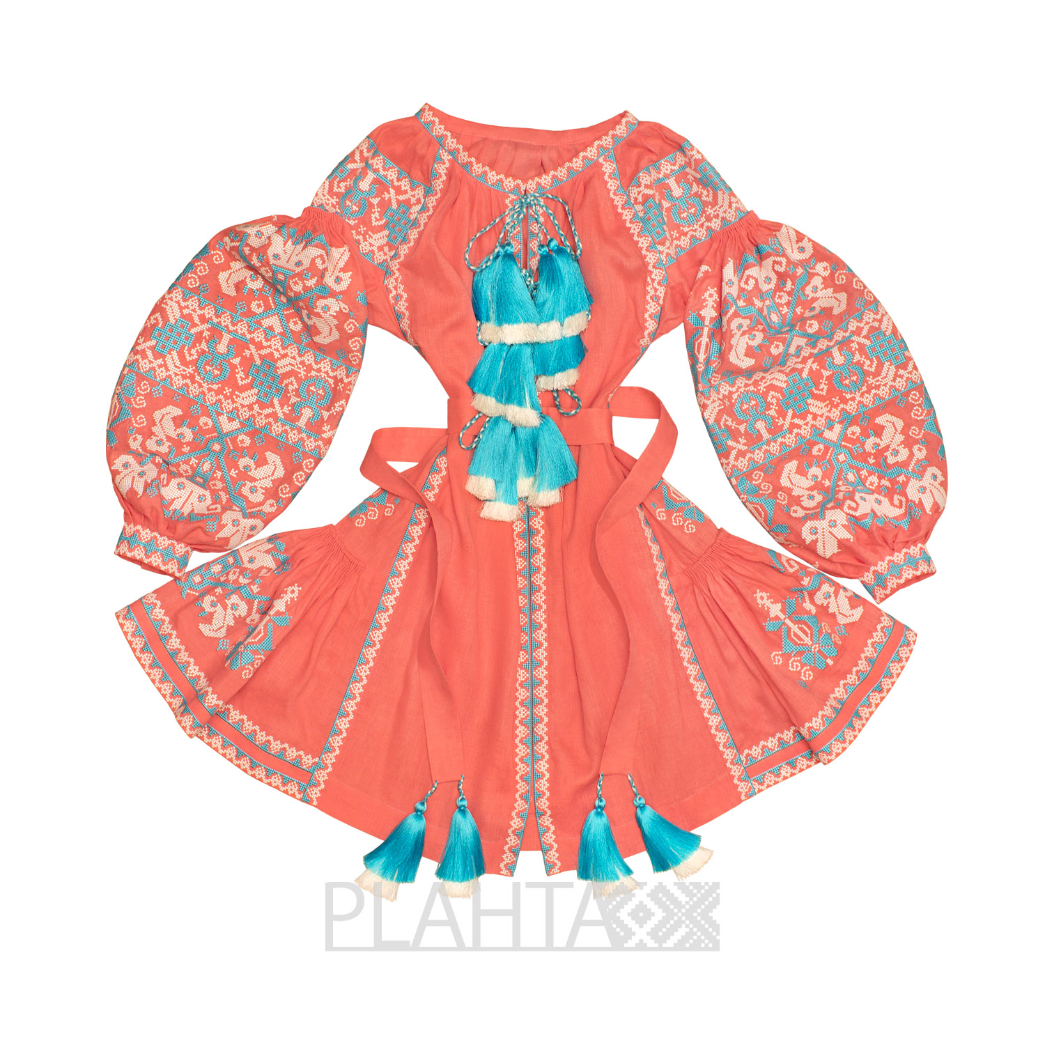 Довжина - 86 см. На планці - застібки-кнопки. З боків сукні клини, прикрашені вишивкою. Горловина і рукава виконані в традиційних українських техніках - "збиранка" та "пухлики". На рукавах - застібки-гудзики. Вишивка хрестиком зроблена на промислових японських вишивальних машинах якісними нитками, що не линяють. Виріб зшитий вручну нашими майстринями.