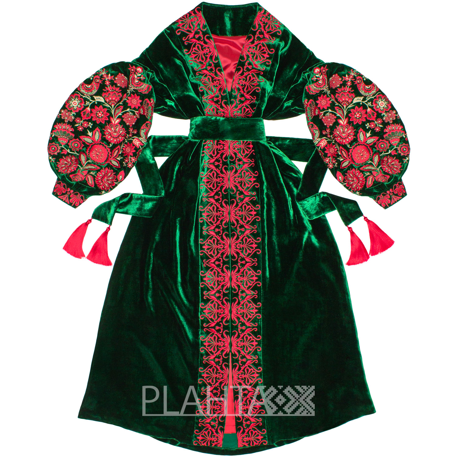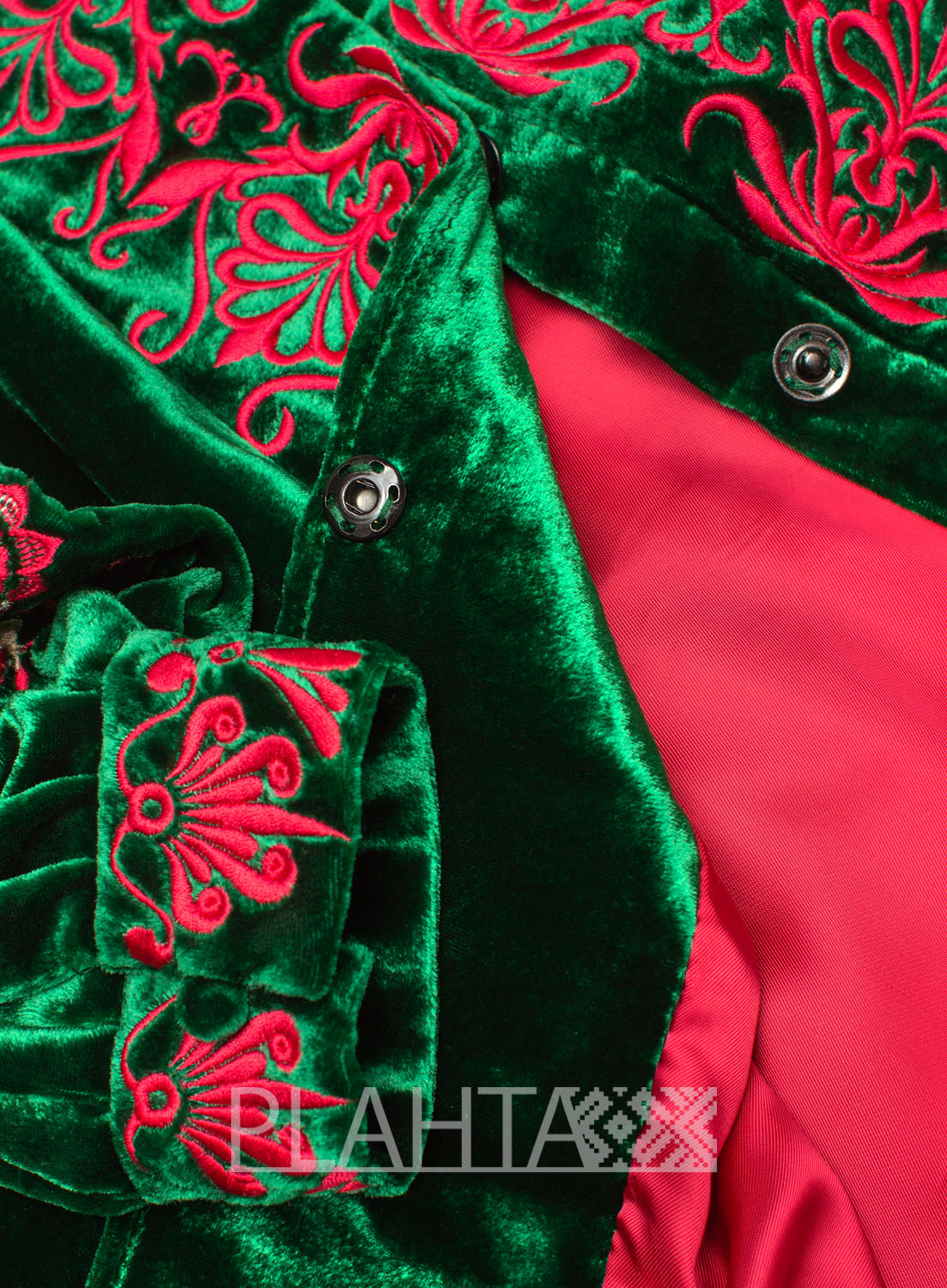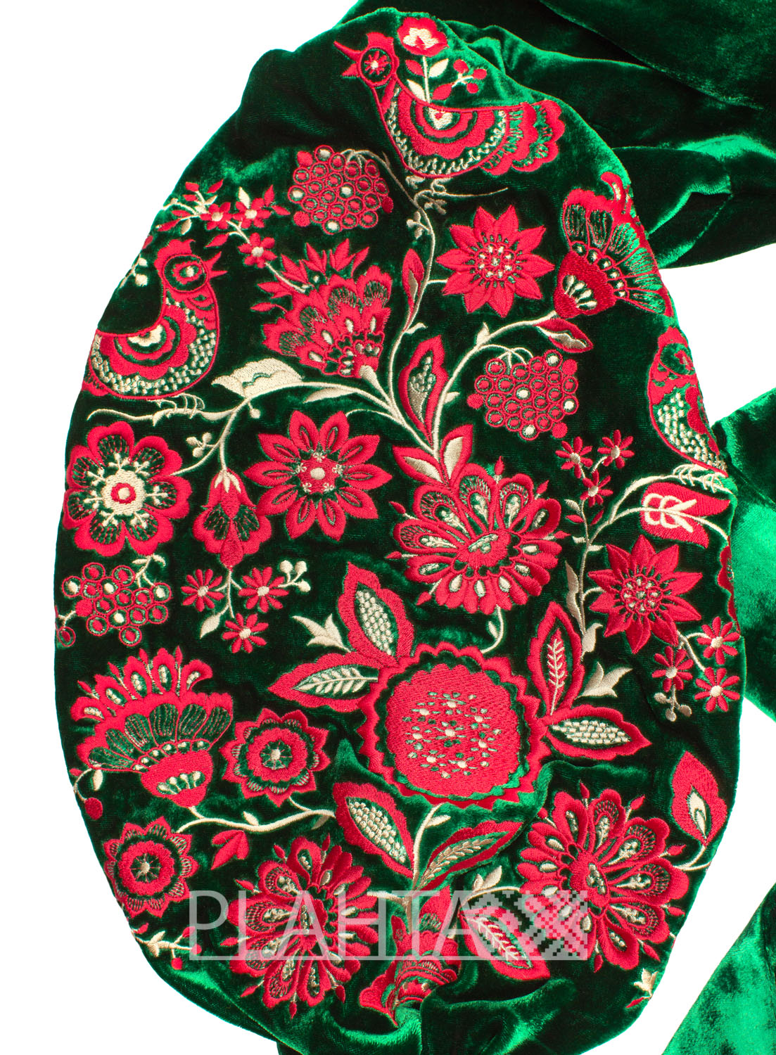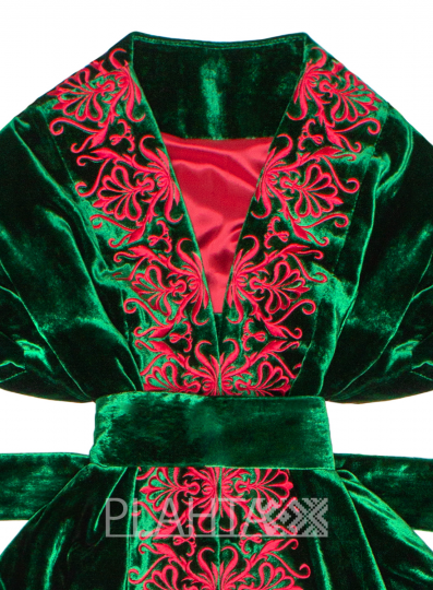 На смарагдово-зеленому оксамиті красується символічна вишивка. Так зване, "Дерево Життя" - це український етнічний обереговий знак, який має декілька значень: Мати-Природа, Жінка-Мати, уособлення структури світобудови. Квіти на Дереві Життя символізують красу і молодість, а птиці - це посланці Божого Духа, що оберігають родину.