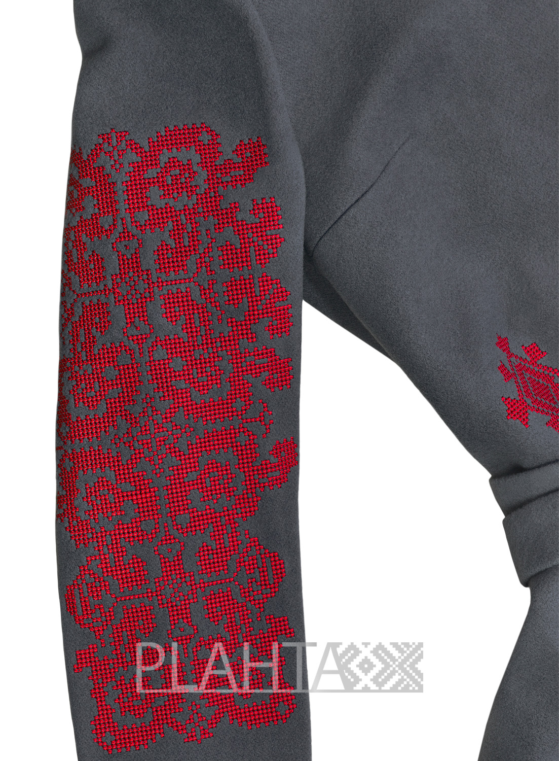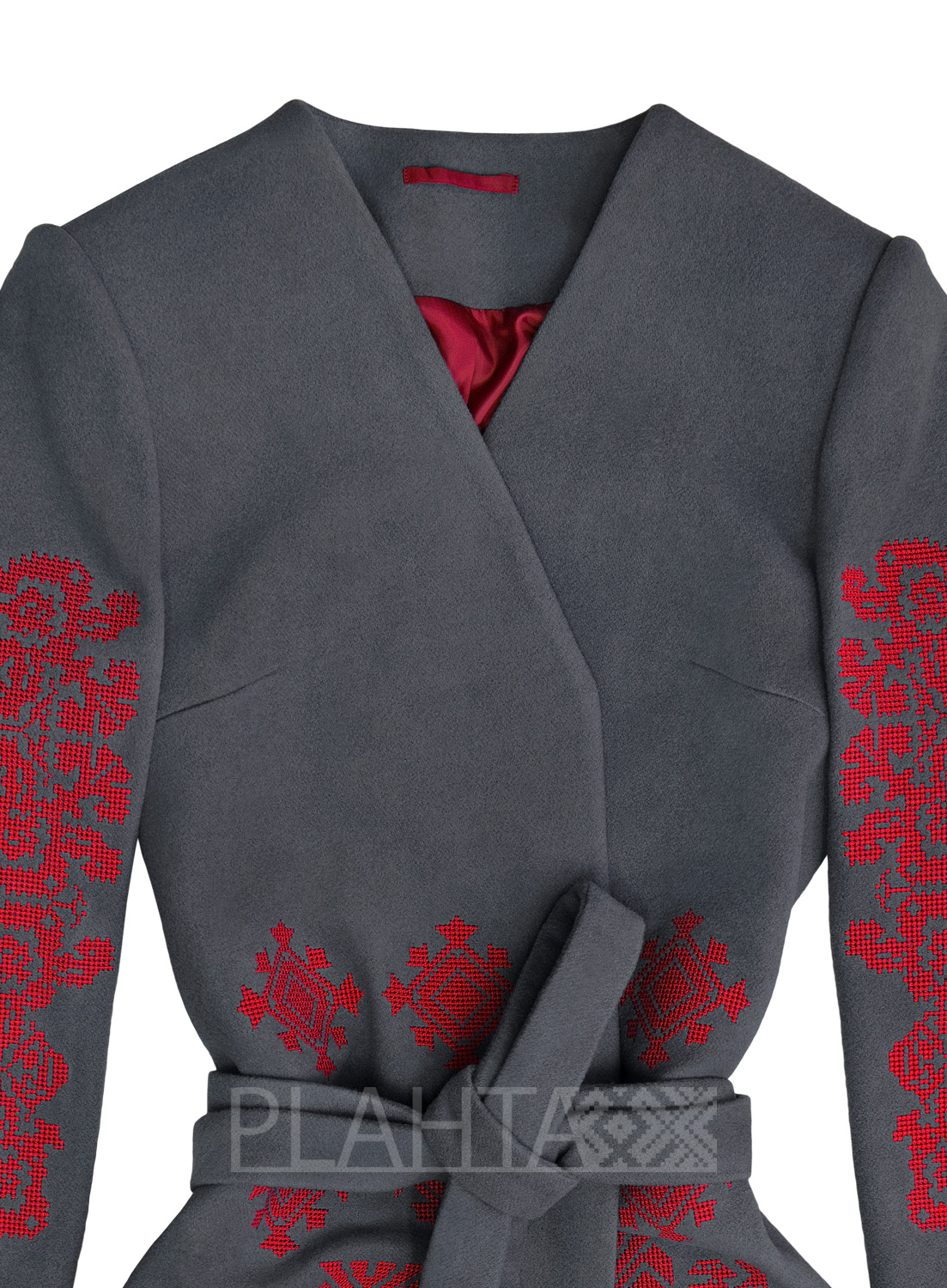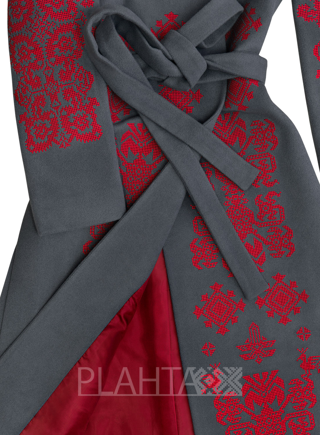 Сірий колір - завжди актуальний та універсальний. Його доповнює багата червона вишивка. Червоний колір та його відтінки були найулюбленішими в українській культурі. Цей колір наділили особливим значенням. Червоний - це любов, пристрасть, життєлюбність. Символіка кольору органічно переплітається з космогонічною символікою вишитого орнаменту. В центрі розташоване дерево зі скрученими гілками, об'єднуюче все земне та небесне. Воно нагадаує нам про зв'язок з пращурами й про циклічність життя. Коні, що скачуть, символізують небо та космос, а ромб - це солярний знак. Колообіг завершує пісня зозулі, що символізує життя та несе нас до душ пращурів.