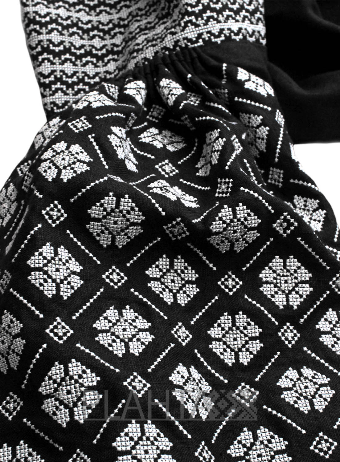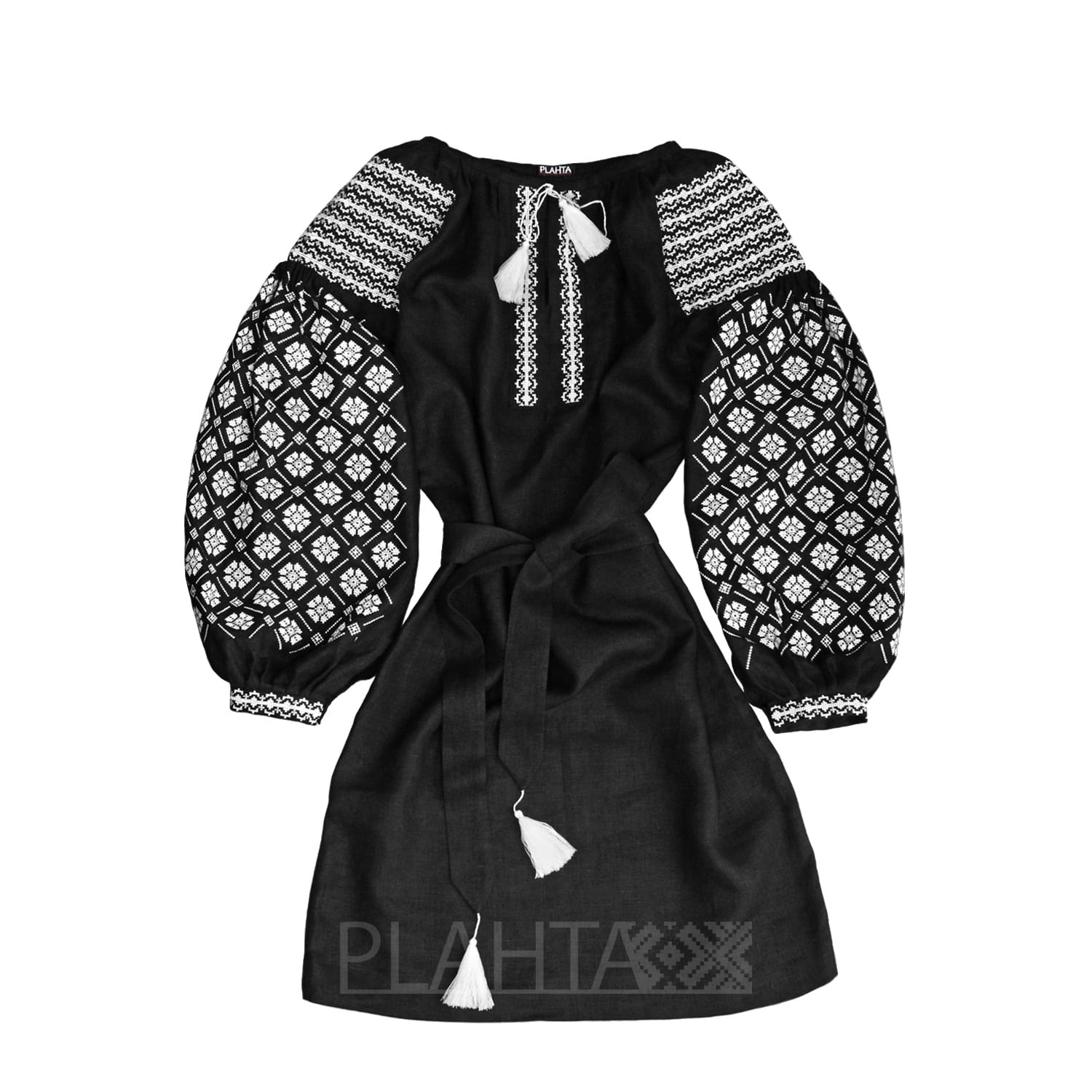 Сукня-вишиванка "Нічний Барвінок" в стриманій чорно-білій гамі - це трендова і сучасна річ в автентичному українському стилі. Ненав'язливе класичне поєднання чорного, білого і сірого, доповнене вишитим геометричним орнаментом в традиційній манері, відмінно підкреслить жіночність і особливе відчуття стилю власниці. До того ж це дуже універсальний елемент гардеробу, що підходить як до ділових зустрічей, так і до вечірніх виходів.