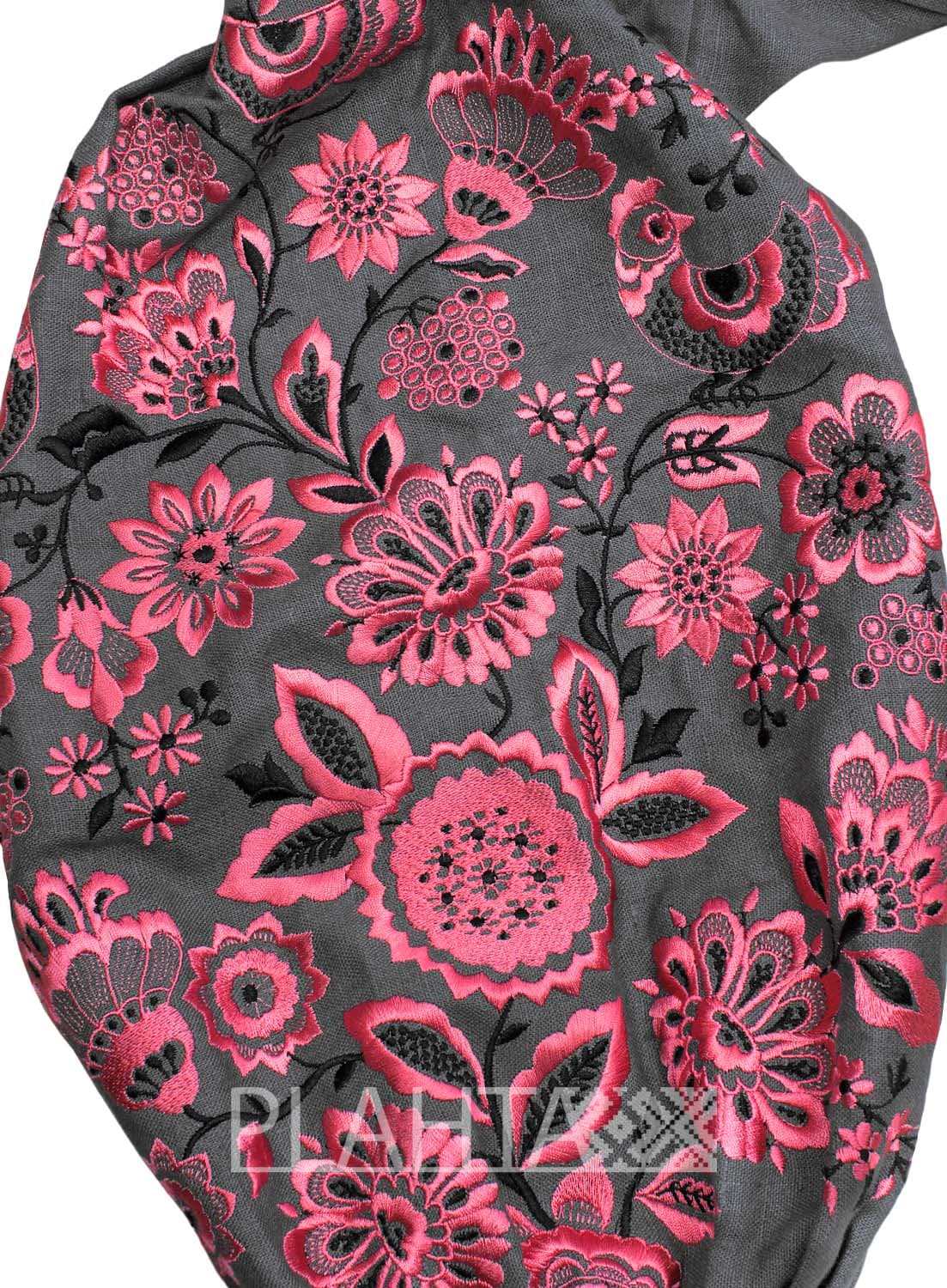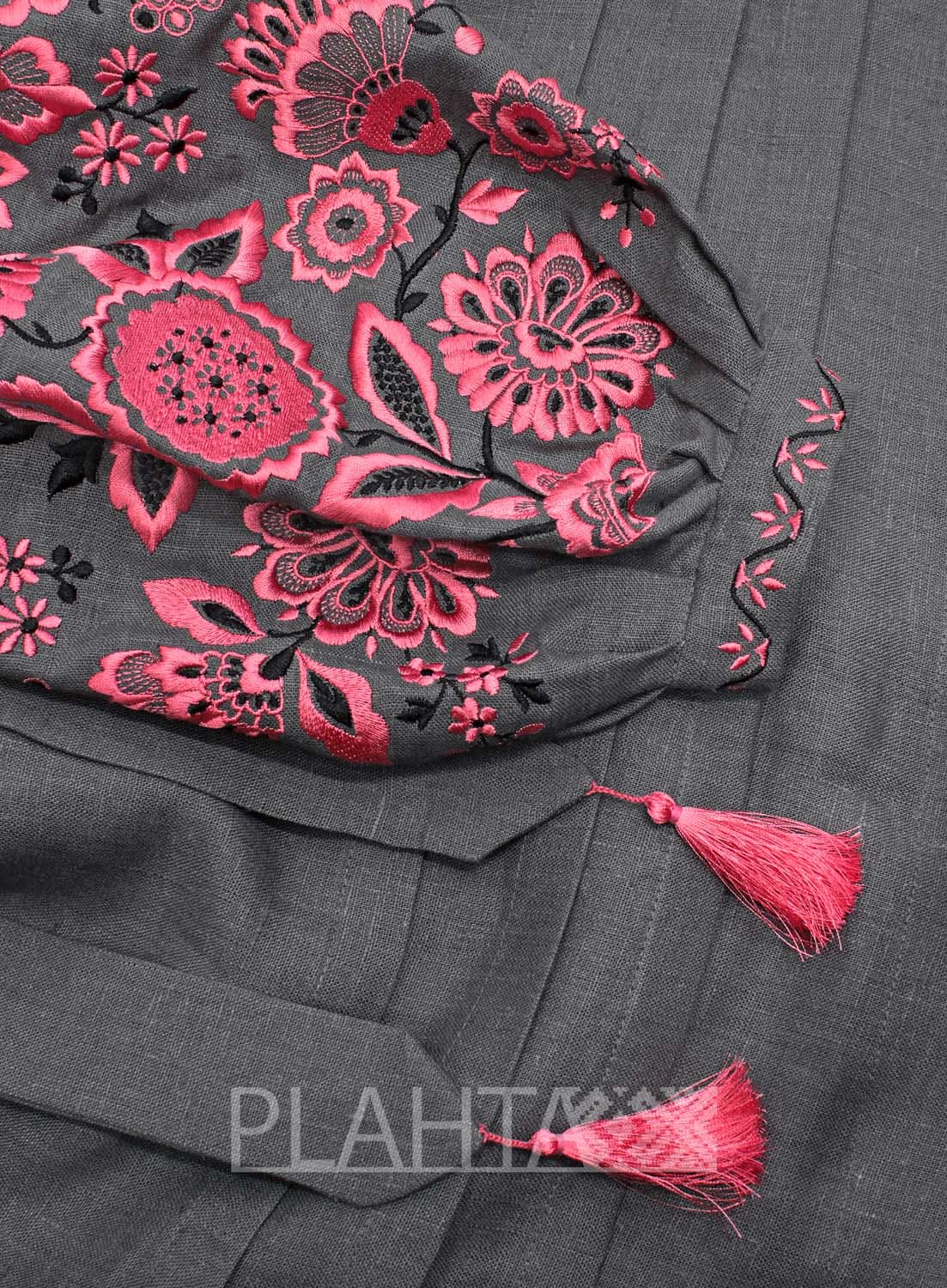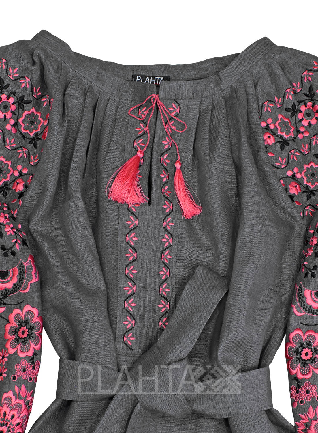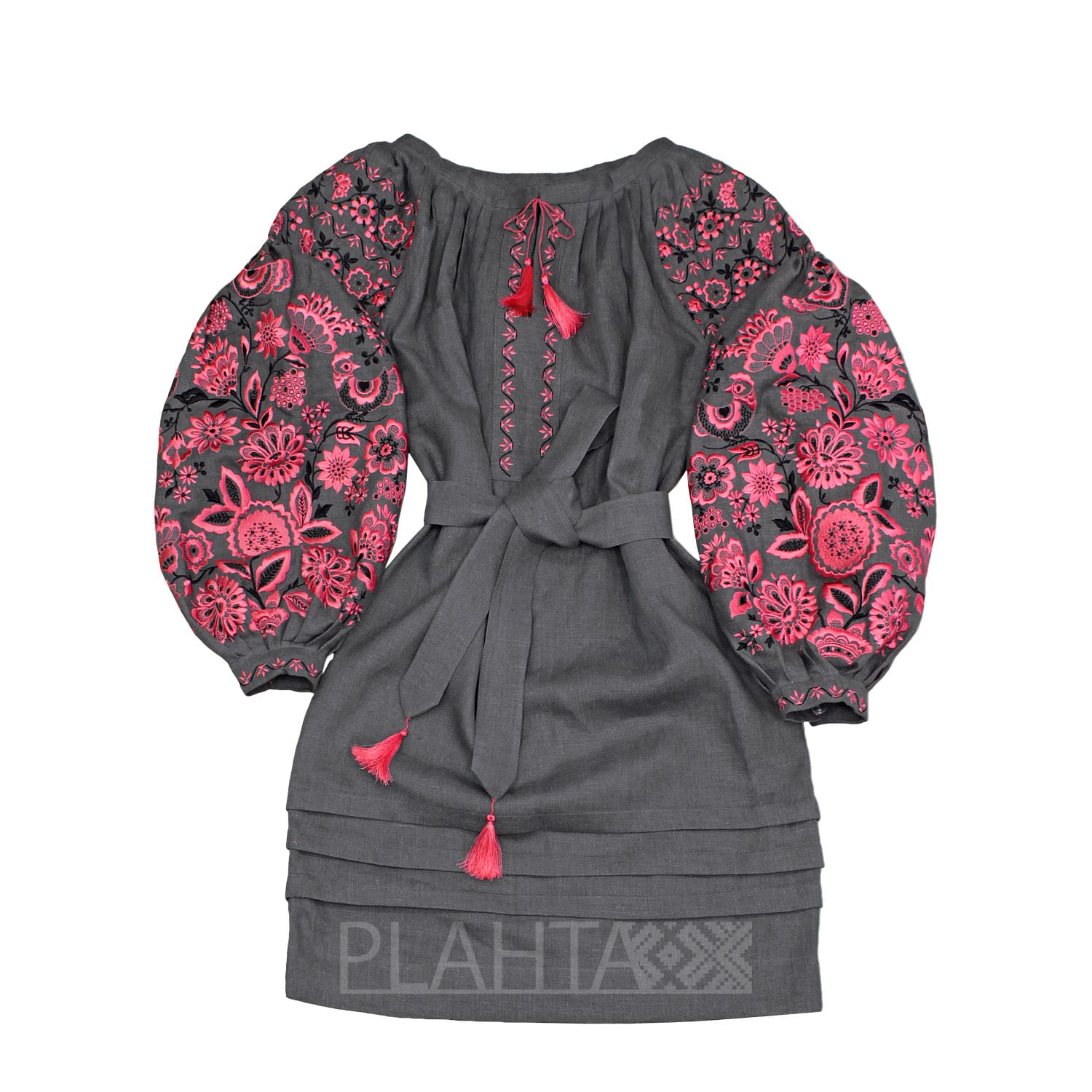 Сукня-вишиванка "Диво-Дерево" - стильна річ з яскравою автентичною вишивкою в українському стилі. Таке плаття відповідає всім критеріям сучасних модних тенденцій. Простий крій, завжди актуальний сірий колір льону, масивна вишивка традиційного мотиву в рожевому кольорі - сміливе і нестандартне поєднання, яке доповнить оригінальний жіночий образ - діловий, вечірній або молодіжний.