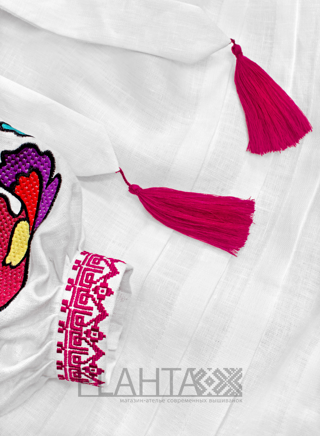 Довжина сукні - 94 см. Пошиття - цілісний фасон з вирізом посередині. Для декорування горловини і рукавів використані традиційні техніки "збиранка" та "пухлики". На рукавах - застібки-гудзики. Вишивка зроблена на промислових японських вишивальних машинах якісними нитками, що не линяють. Виріб зшитий вручну нашими майстринями.