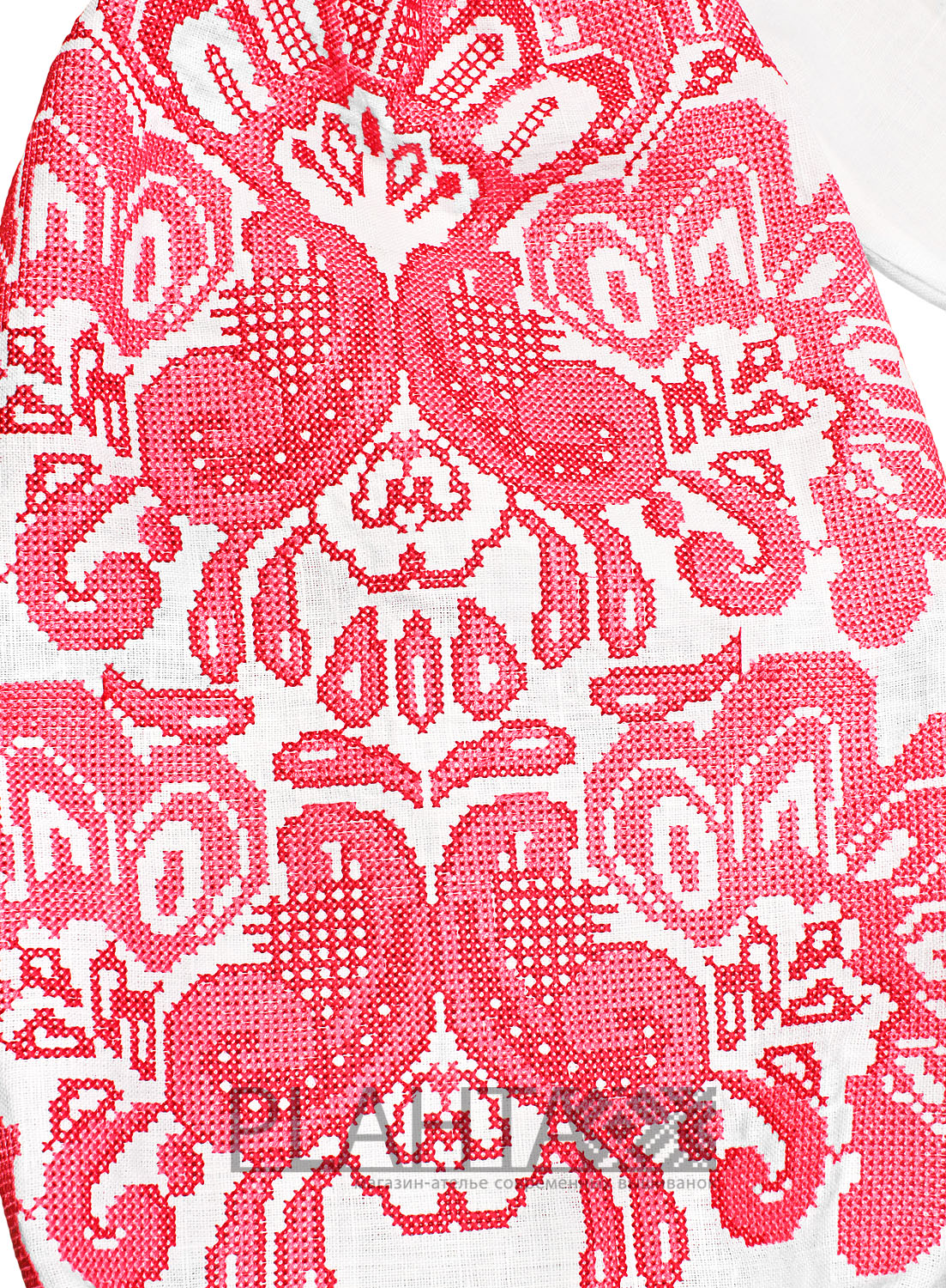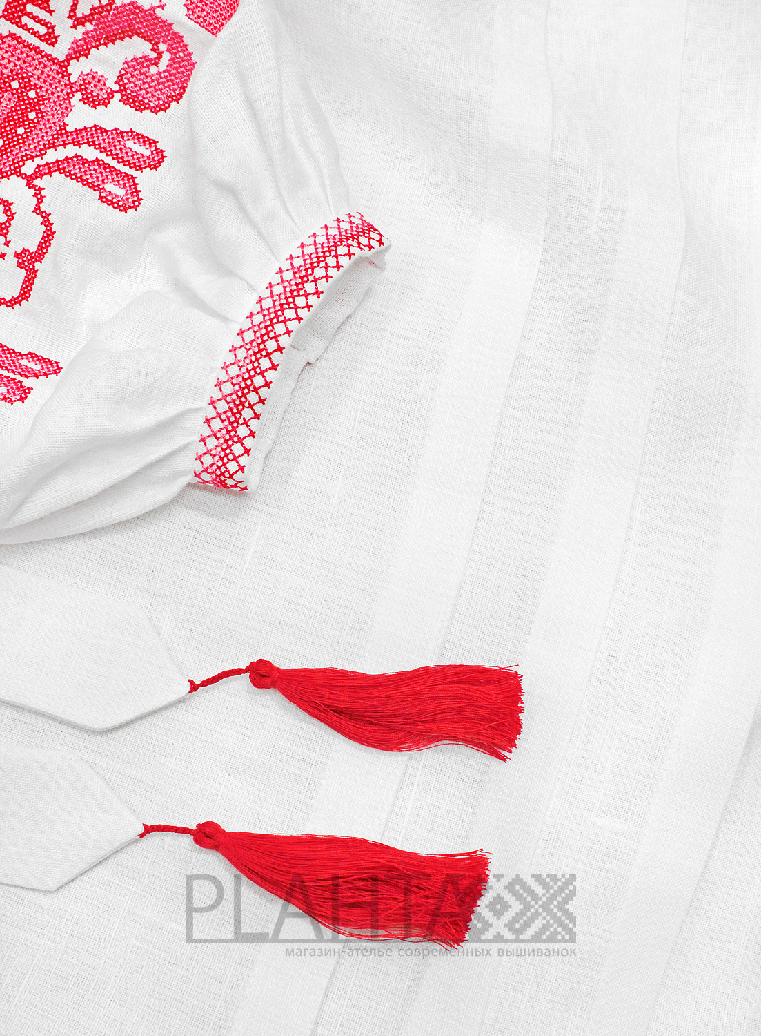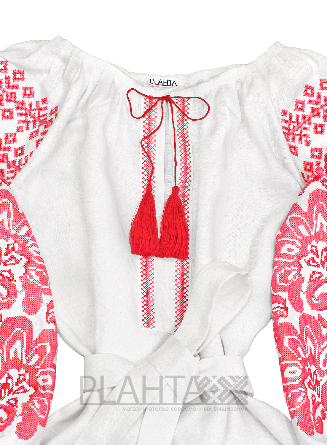 Квітковий мотив, що прикрашає рукава сукні-вишиванки, дуже нагадує загадкову квітку папороті. Згідно слов'янської міфології ця квітка розпускається лише раз на рік, в ніч на Івана Купала. Яскраво-вогняна квітка, настільки яскрава, що на неї неможливо дивитися, наділяє магічними здібностями того, хто зуміє її знайти і забрати з собою з гущавини лісу. В українській вишивці квітка є символом краси і непорочності, оберегом любові. А білий колір лляної матерії символізує силу, енергію, чистоту як фізичну, так і духовну. Червоний колір вишивки - захищає від зла і притягує енергію гармонії, творіння, любові.