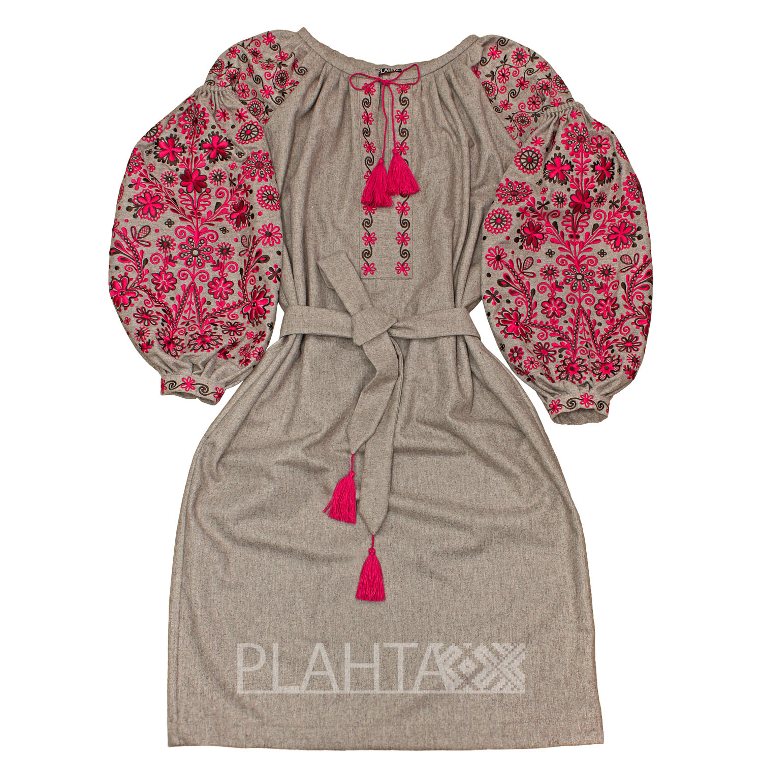 Довжина сукні - 108 см. Пошиття - цілісний фасон з вирізом посередині. Горловина і рукава прикрашені в традиційних техніках - "збиранка" та "пухлики". На рукавах - застібки-гудзики. Вишивка гладдю зроблена на промислових японських вишивальних машинах якісними нитками, що не линяють. Виріб зшитий вручну нашими майстринями.