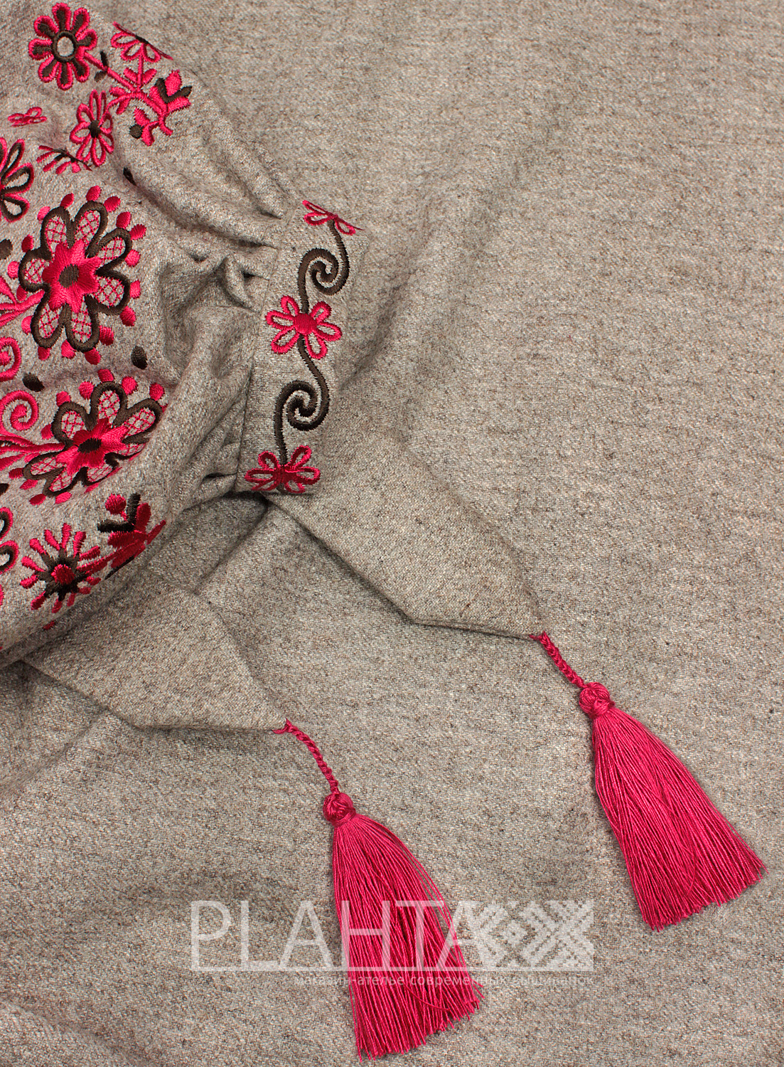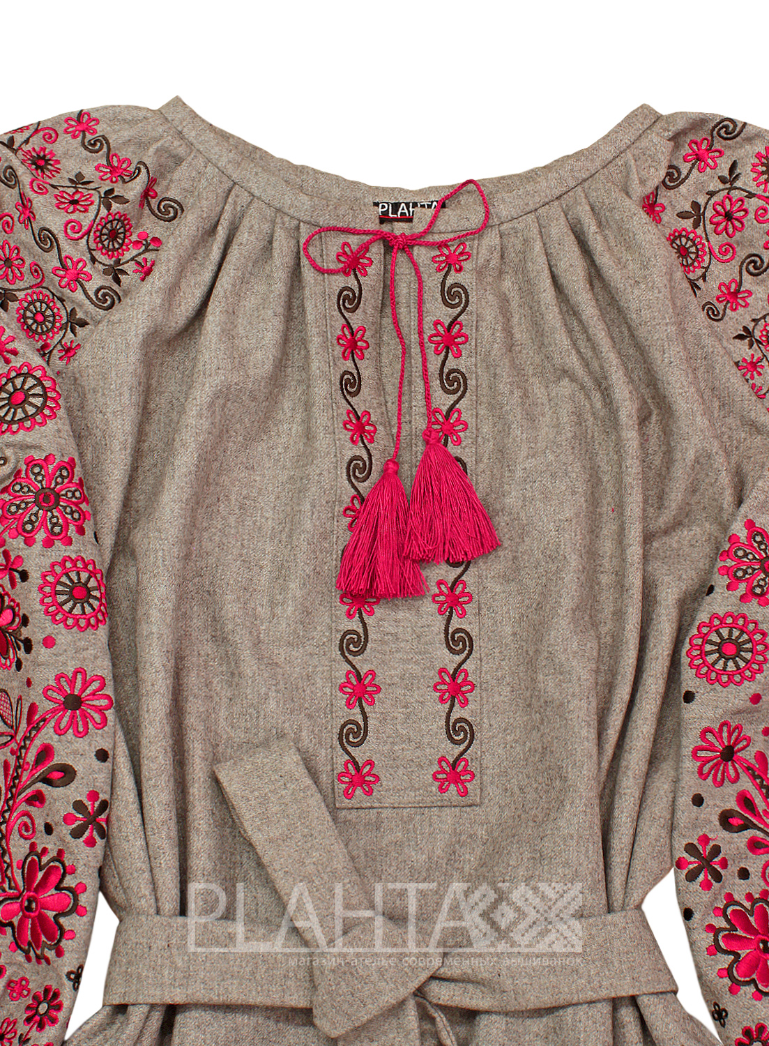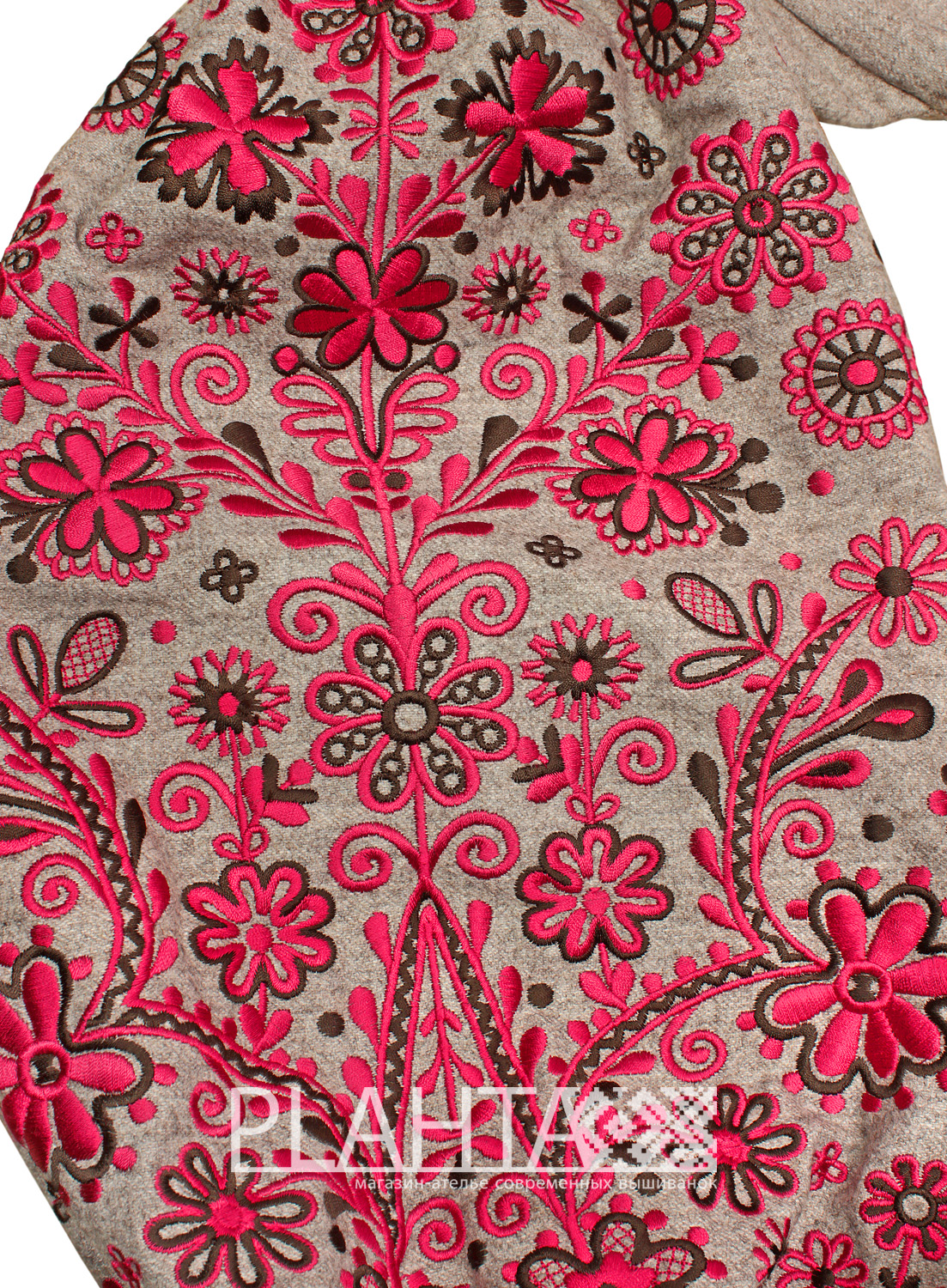 Гармонійне поєднання кавово-сірої тканини і коричнево-малинової вишивки виглядає яскраво і безумовно стильно. До того ж такі кольори тканини і ниток використовувалися в традиційній українській вишиванці і мали особливе архаїчне значення. Коричневий - це колір землі. Він здавна символізував родючість. А рожевий - колір духовного спектра, символ чуттєвості, пристрасті, квітучої землі і розвитку. У вишивці домінує квітковий мотив. Квітка в українській вишивці - це символ краси, юності, чистоти і процвітання роду.