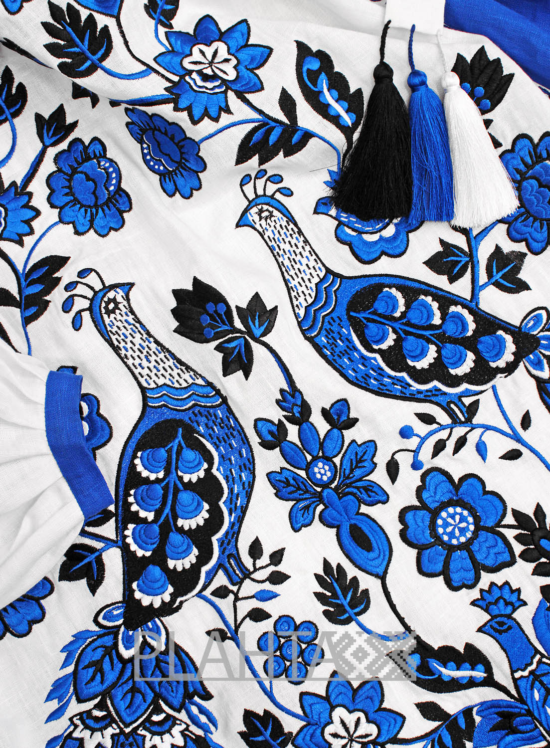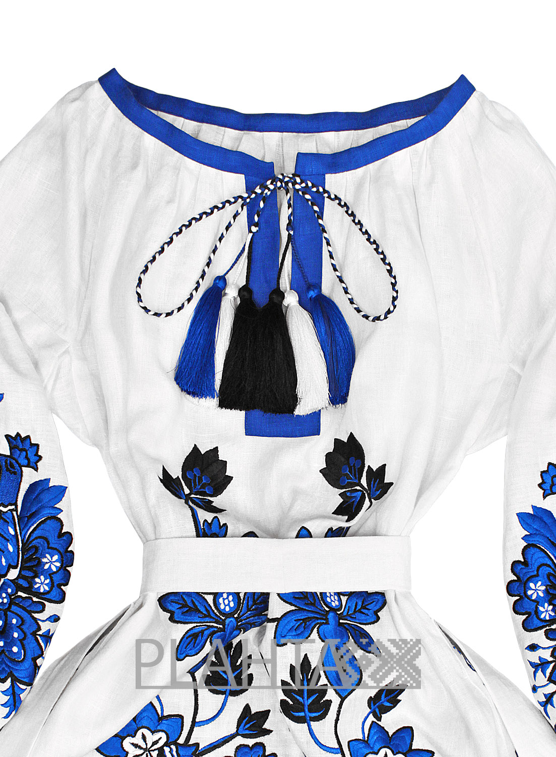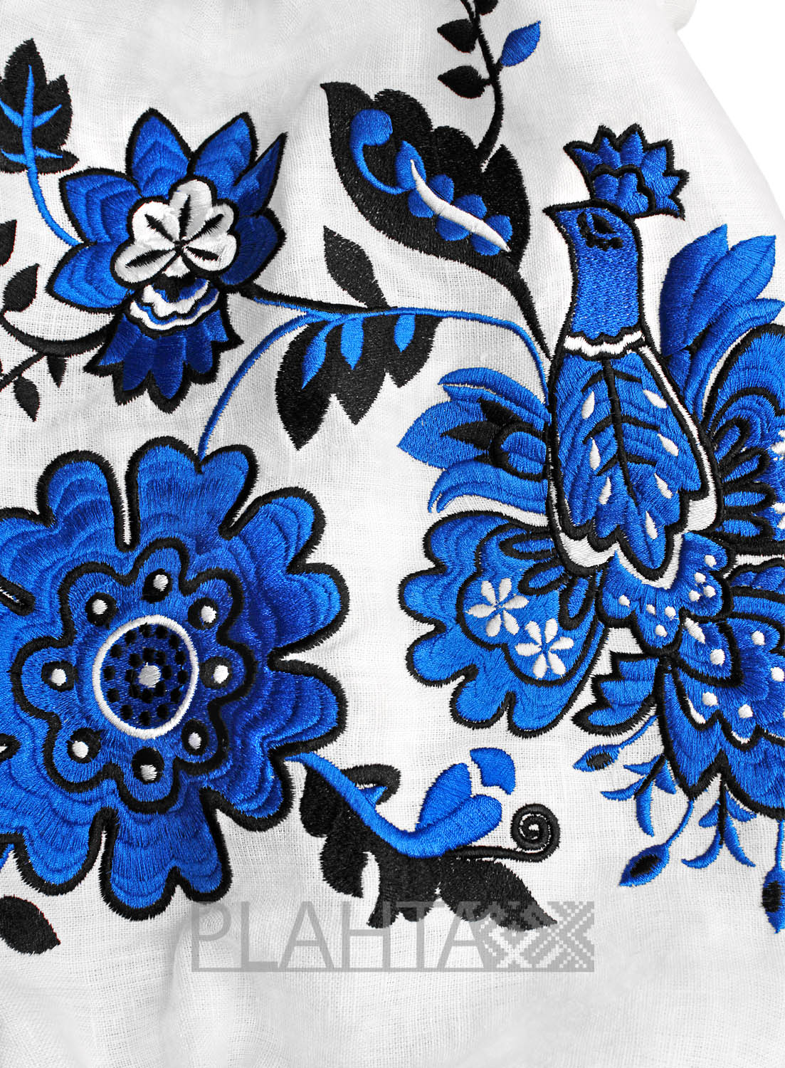 Традиційне поєднання білого, синього та чорного несе в собі глибинний архаїчний зміст. Білий колір - символ чистоти та енергії, синій є кольором води, отже символізує очищення фізичне й душевне, а чорний колір в українській вишивці - це колір родючості. Багата вишивка традиційних мотивів не менш символічна. Квіти - це символи краси, дівочої привабливості та молодості. А казкові павичі - це птахи сімейного щастя, що приносять удачу та успіх.