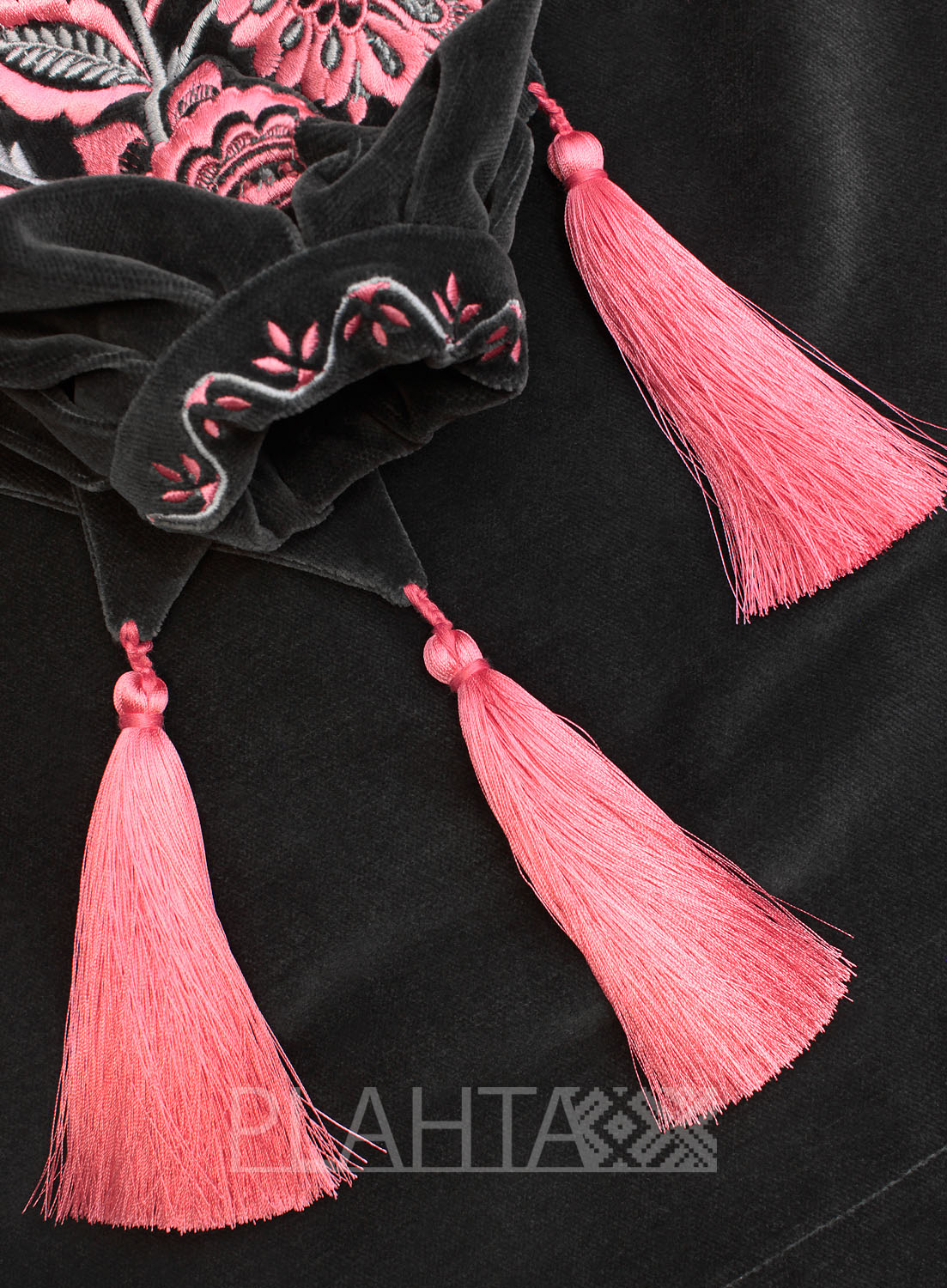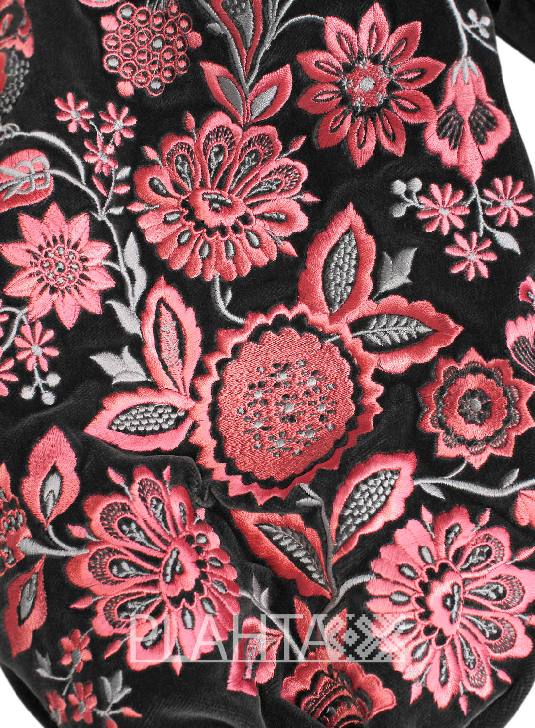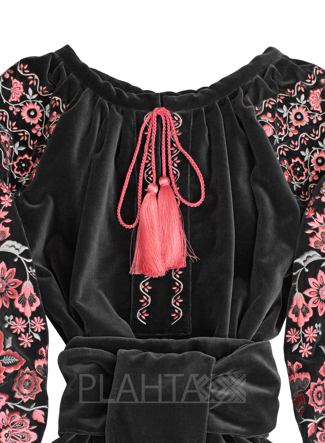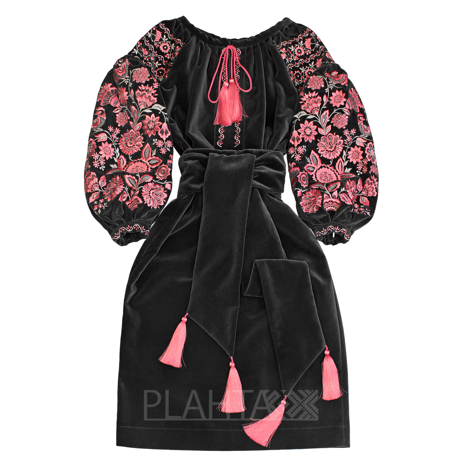 Чарівна оксамитова сукня "Диво-Дерево" - справжня перлина сучасного жіночого образу. Шляхетний темно-сірий оксамит і блідо-рожева вишивка традиційного мотиву виглядають по-особливому  жіночно.