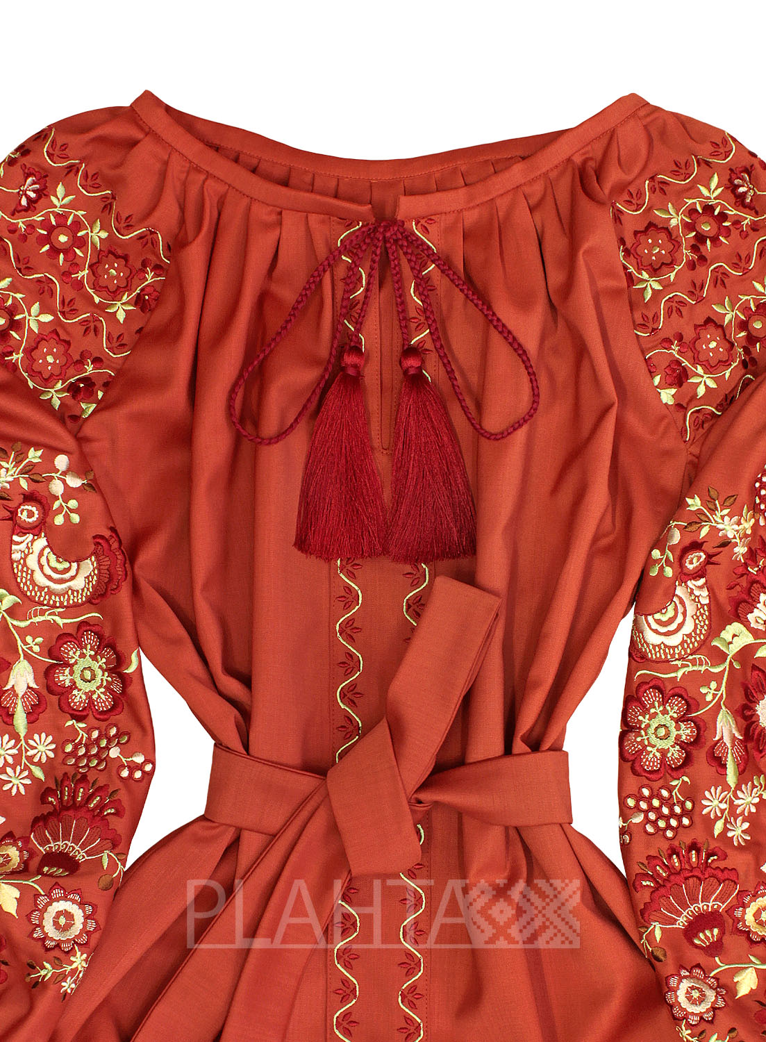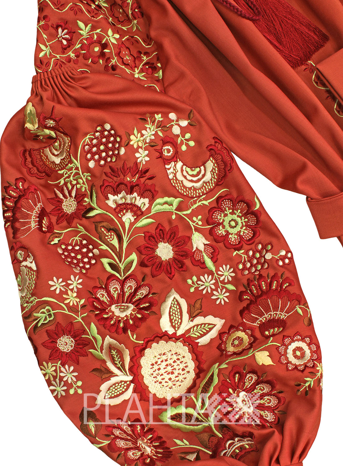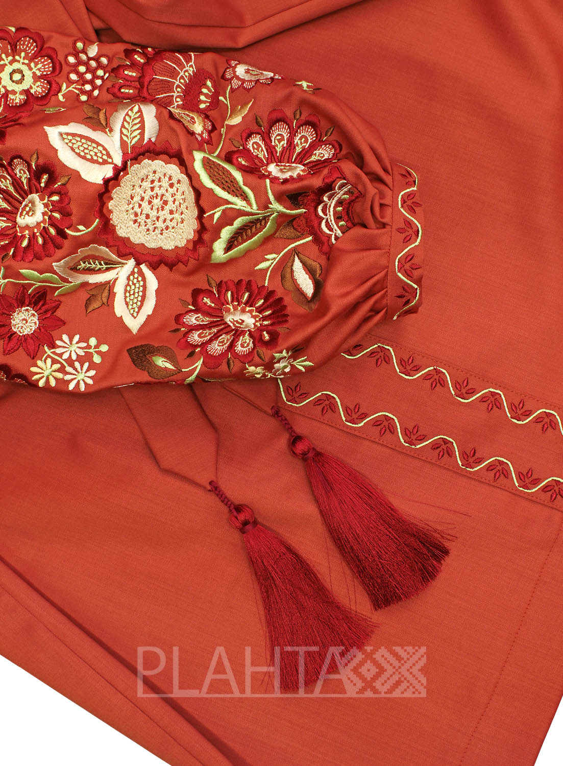 Вишивка в бордово-коричневих тонах, доповнена екрю та фісташковим кольором, виглядає дуже вишукано на тлі теракотової вовняної тканини. На окрему увагу заслуговує мотив  "Дерево Життя", використаний у вишивці. Це український етнічний обереговий знак, який має декілька значень: Мати-Природа, Жінка-Мати, уособлення структури світобудови. Квіти на  Дереві Життя символізують красу і молодість, а птиці - це посланці Божого Духа, що оберігають родину.