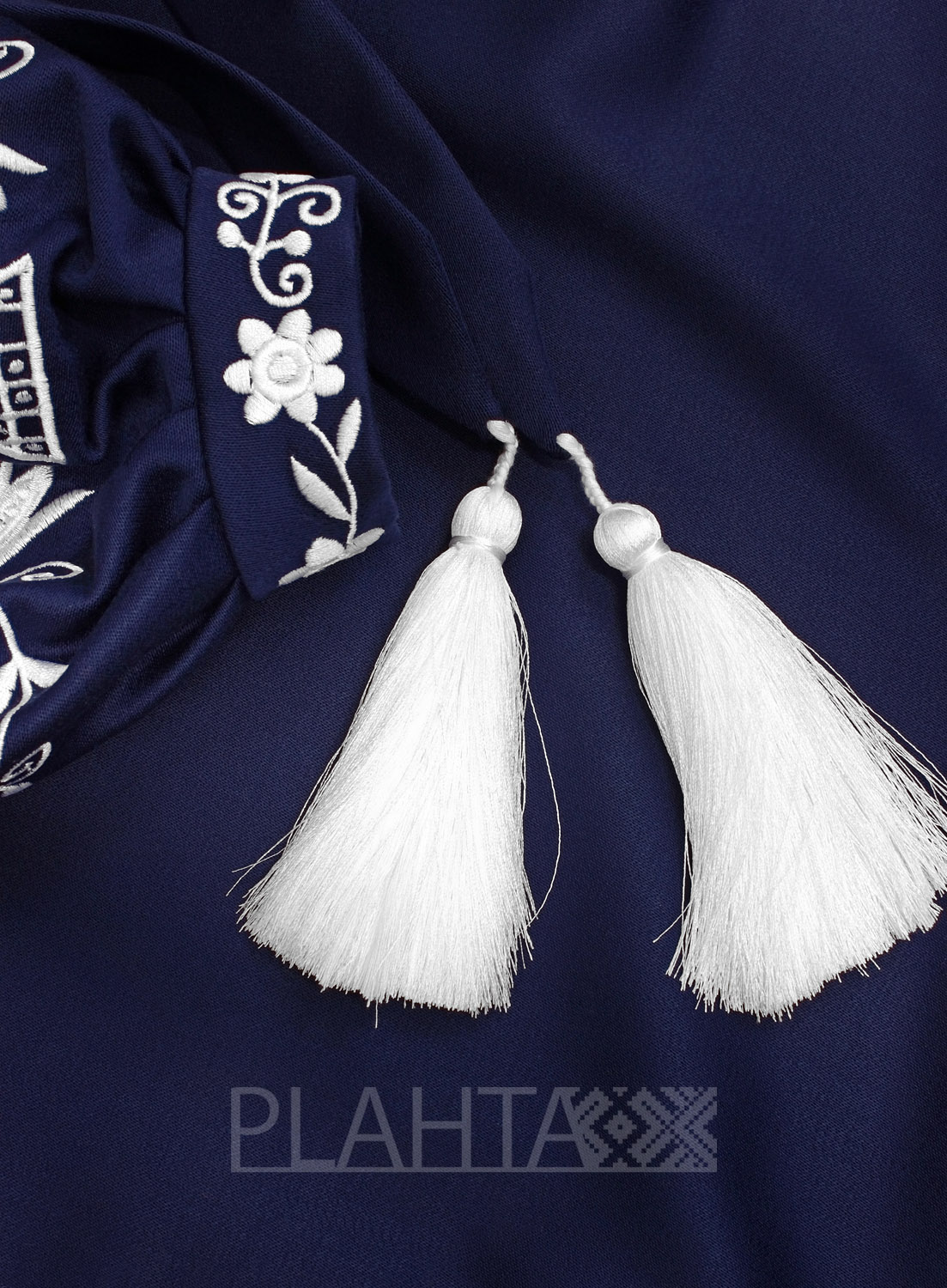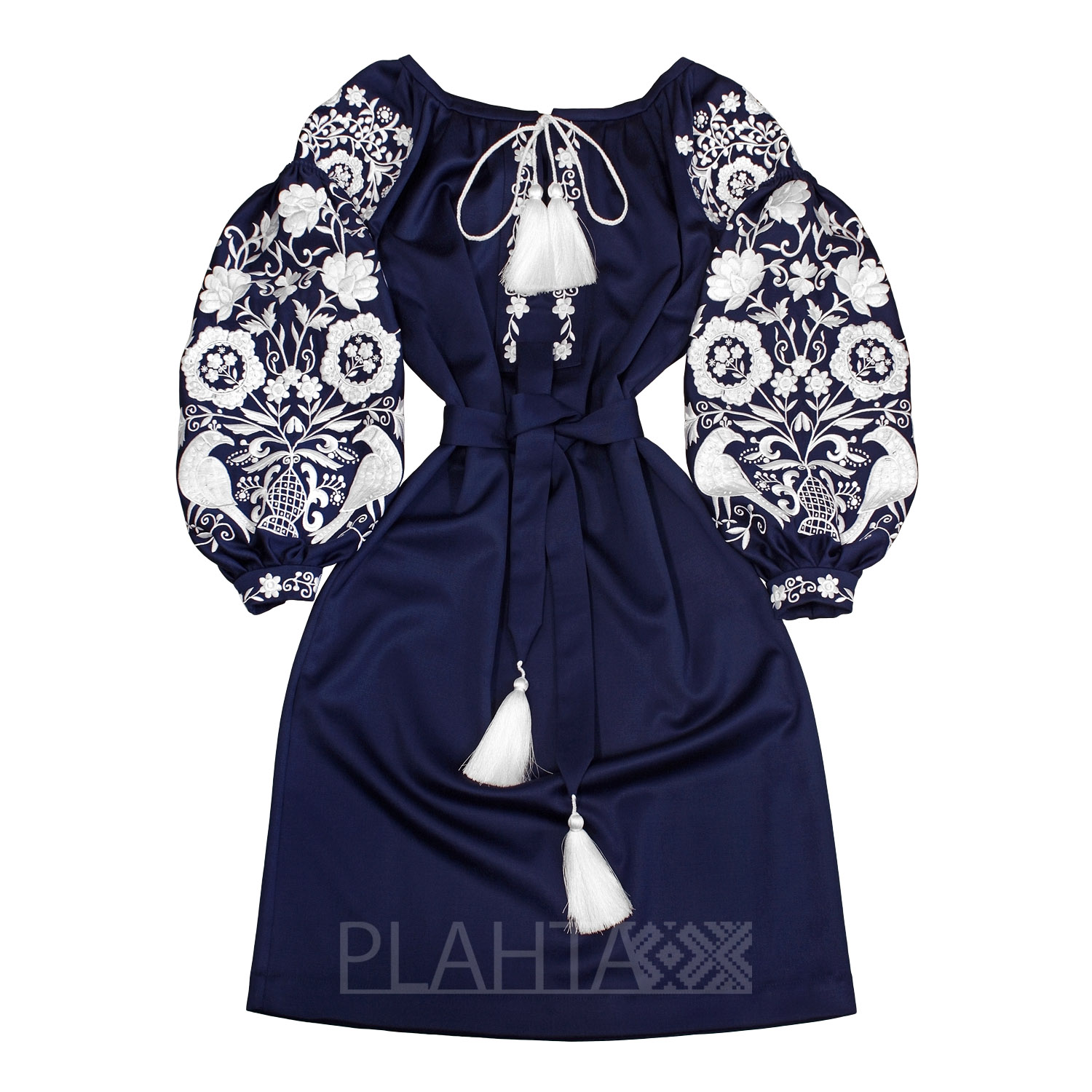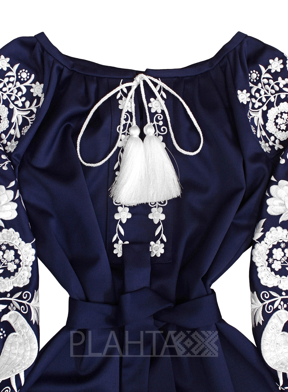 Колорит сукні та мотив вишивки не тільки гармонійно поєднуються, але й мають особливе значення. Синій колір в українській культурі - це символ води та жіночого начала, а білий символізує чистоту. У вишивці домінує квітковий мотив, зібраний в систему орнаменту, що символізує уявлення народу про Всесвіт та його нескінченність. А птахи - це посланці Божого Духа, що оберігають родину.