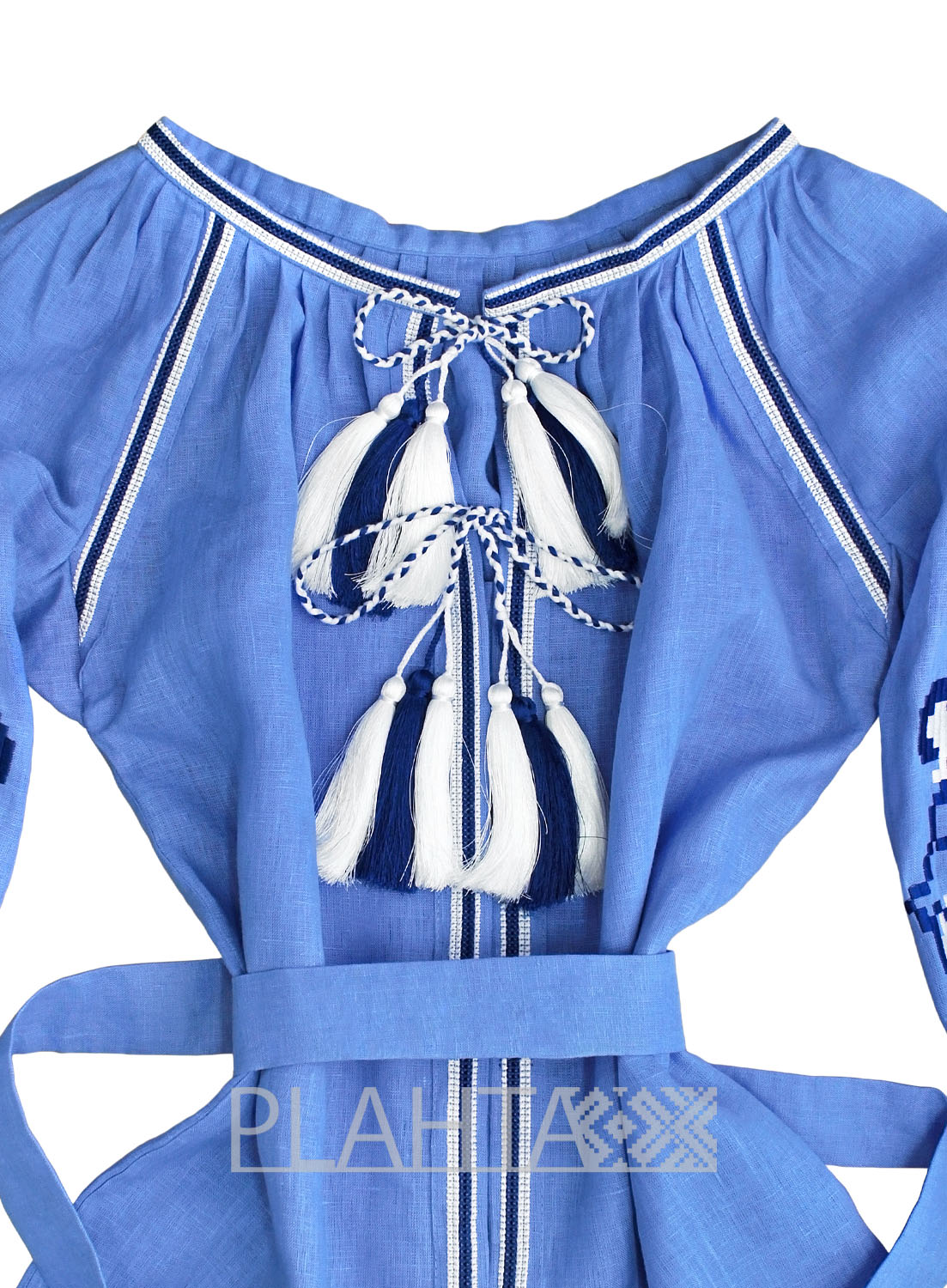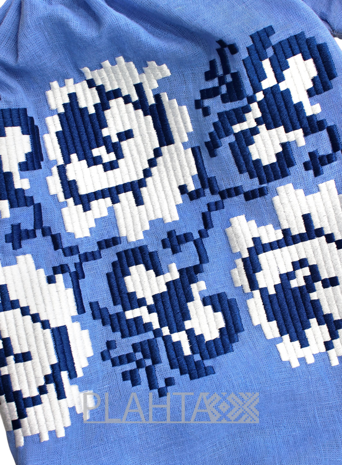 Комбінація білого, темно-синього та блакитного кольору доповнюється символічною квітковою вишивкою. Троянда - улюблена квітка українців, яку здавна вишивали на одязі й рушниках. Ніжні квіти, зібрані в геометричний орнамент, втілюють уявлення людини про Всесвіт як про гармонійну систему. Крім того, троянда - це символ дівочої вроди та привабливості.