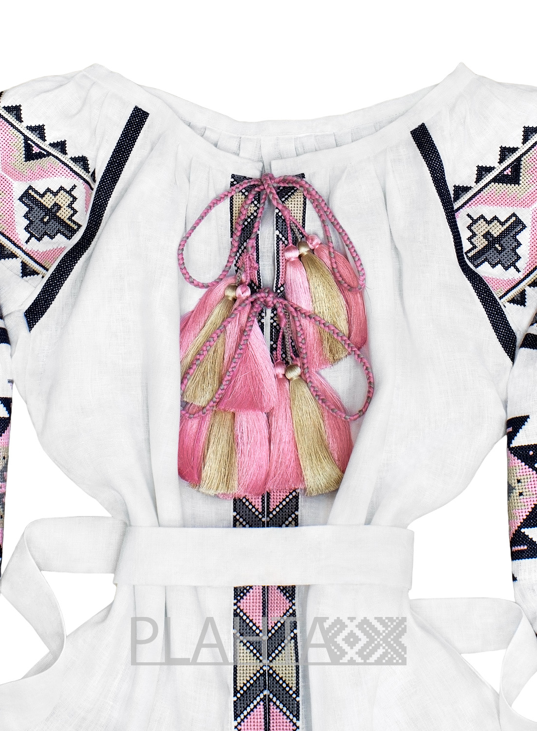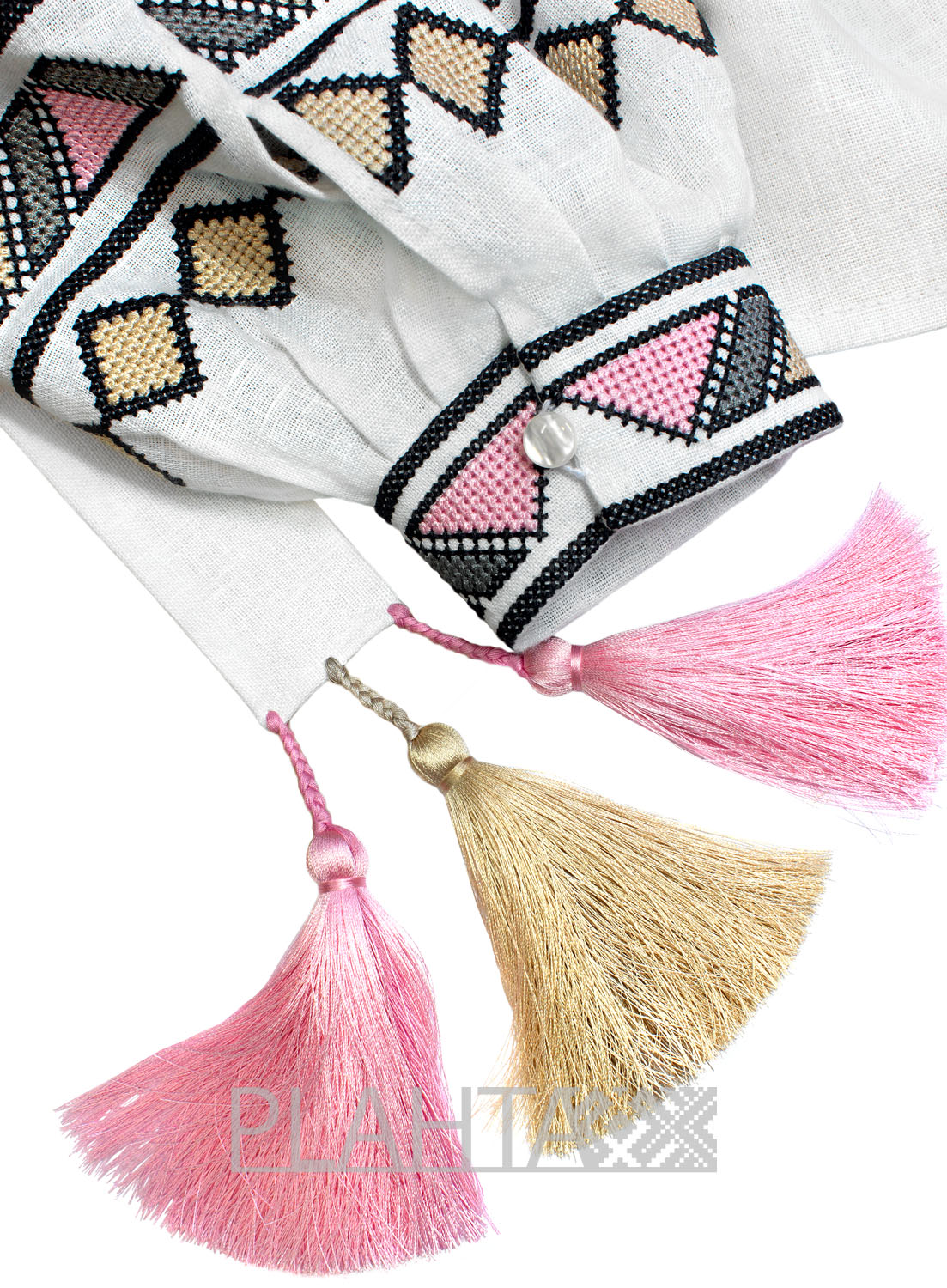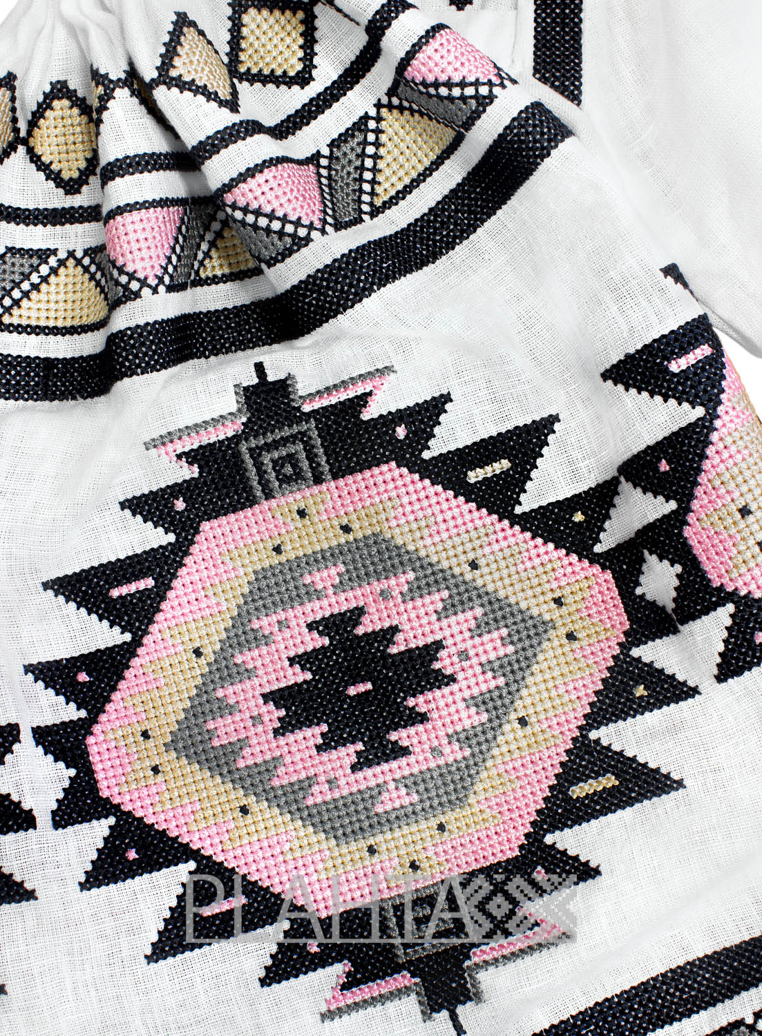 Пастельний колорит доповнений глибоким архаїчним символізмом. Домінує ромбічний мотив, який є потужним оберегом, що приносить щастя. Ромб - це символ сонця та родючості. Також у вишивці зустрічається трикутник - символ людини.