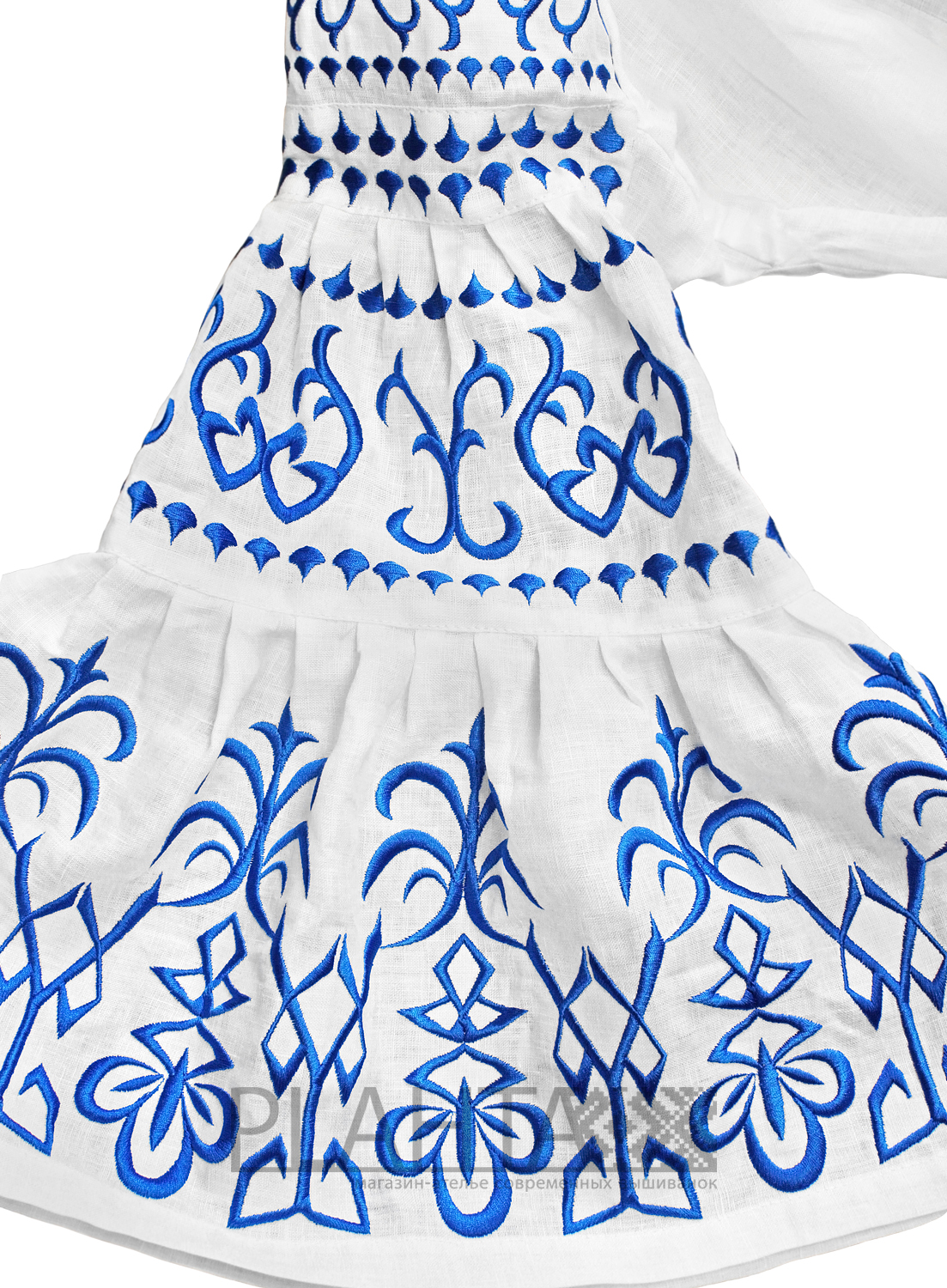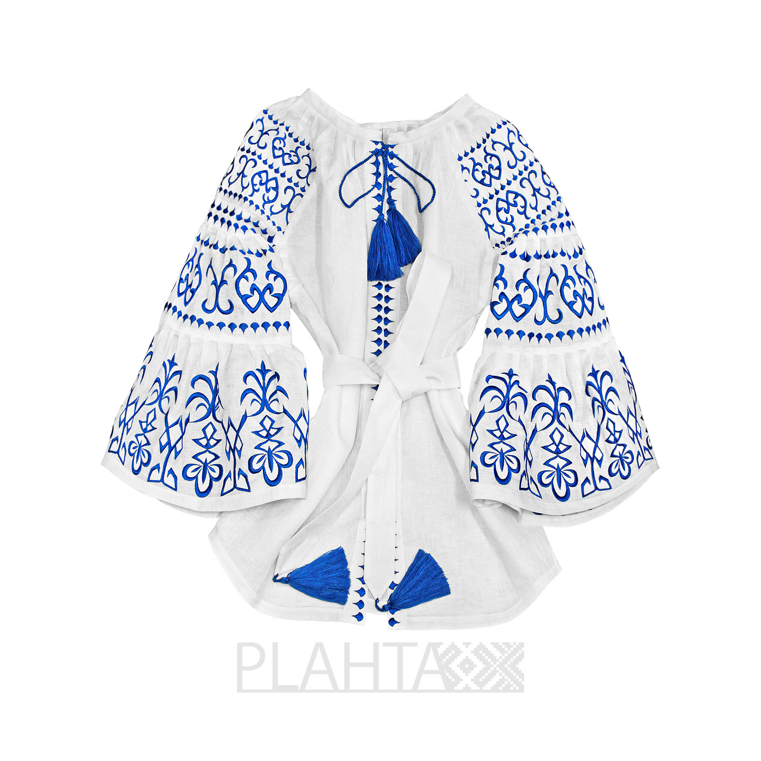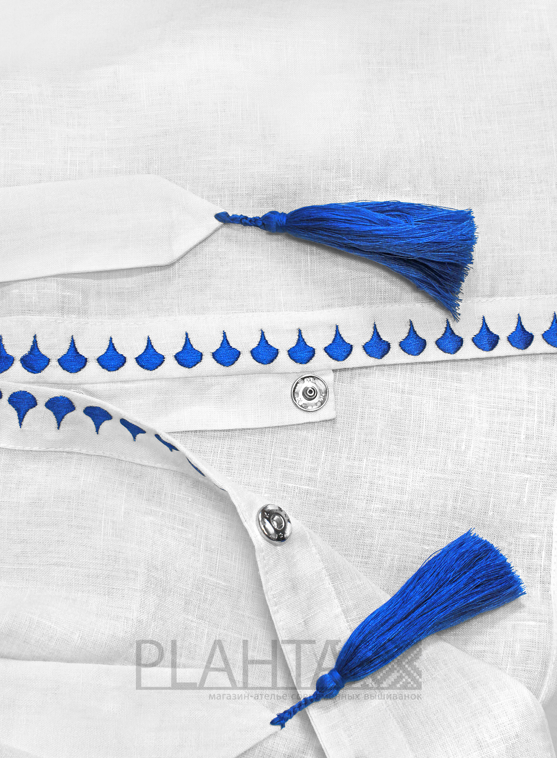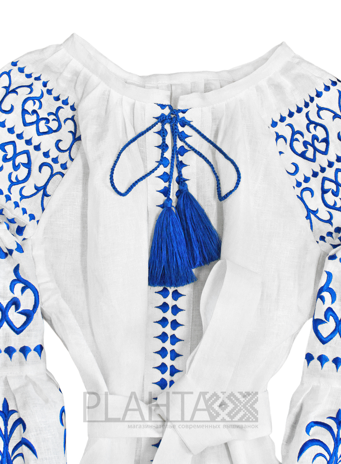 У цій вишиванці представлено оригінальне сплетіння рослинного і геометричного орнаменту в традиційній українській кольоровій гамі. Синій колір вишитої нитки здавна вважався розкішним і дорогим кольором, а вишивка цим кольором символізувала душевний спокій. Також синій колір був найпотужнішим оберегом. А білий колір лляної тканини символізував чистоту і енергію.